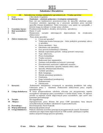 CDP Szkolenia i Doradztwo 1 2 3 4 5 6 7 8 9 10 11 12 13 A6. Interaktywny trening umiejętności sprzedażowych – Trudna sprzedaż 2 dni (około 12 godzin). Czas: Rodzaj kursu: Zamknięte – szkolenie połączone z treningiem umiejętności. Kurs ten jest każdorazowo przystosowywany do specyfiki szkolonej grupy Uczestnicy szkolenia zapoznają się z procesem sprzedaży przez pryzmat specyfiki własnej działalności. Także ćwiczenia i casy oparte są o przypadki, z którymi mogą się zetknąć w swojej pracy szkoleni. Przedstawiciele handlowi, doradcy, akwizytorzy, sprzedawcy. Uczestnicy kursu: Około 15 osób Ilość uczestników: Dostarczenie narzędzi ułatwiających doprowadzenie do zwiększania Cel: efektywności Pracy pionu sprzedaży. Zakres tematyczny: • Czym jest sprzedaż? • Tradycyjna kontra koncepcyjna – które podejście gwarantuje sukces w sprzedaży • Proces sprzedaży – fazy • Określanie celu sprzedaży, • Fazy procesu komunikacji z klientem, • Metody rozpoznania potrzeb, rodzaje potrzeb i motywacji, • Typy nabywców, • Proces komunikacji • Trudne rozmowy • Budowanie bazy argumentów, • Zamiana cech produktu na korzyści i przewagi • Prowokowanie zastrzeżeń i odpieranie zarzutów, • Trudne zastrzeżenia i sposoby radzenia sobie z nimi • Sposoby obłaskawiania klientów, • Techniki sprzedaży, • Body launguage, • Metody prezentacji produktów, • Finalizacja, • Etapy komunikacji pozakupowej. • Podsumowanie • Zakończenie Podniesienie umiejętności związanych ze sprzedażą produktów lub usług. Korzyści: Ułatwienie pracy z klientami. Podniesienie efektywności pracy zespołu sprzedażowego Usługa dodatkowa: W koszt przeprowadzenia szkolenia wliczone jest przygotowanie raportu szczegółowo opisującego prace uczestników w formie kasety wideo. W raporcie zawarte są nagrania scenek odgrywanych przez uczestników, opis casów oraz komentarz prowadzącego Termin: Do uzgodnienia Zaproponowane przez Klienta lub przez CDP (posiadamy bazę danych Miejsce: zweryfikowanych ośrodków szkoleniowo-wypoczynkowych) Paweł Kacprzak, Paweł Frątczak Prowadzący: [email protected] Więcej informacji Uwagi dodatkowe: Podczas szkolenia uczestnicy pracują na przygotowanych casach. Elementem szkolenia jest odgrywanie nagrywanych na VHS scenek i późniejsza wspólna analiza zarejestrowanego procesu sprzedaży. O nas Oferta Zespół Klienci Partnerzy Nowości Kontakt