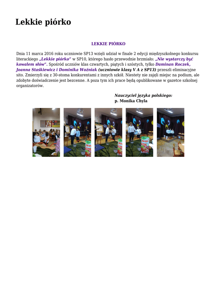 Lekkie piórko LEKKIE PIÓRKO Dnia 11 marca 2016 roku uczniowie SP13 wzięli udział w finale 2 edycji międzyszkolnego konkursu literackiego „Lekkie piórko” w SP10, którego hasło przewodnie brzmiało: „Nie wystarczy być kowalem słów”. Spośród uczniów klas czwartych, piątych i szóstych, tylko Daminan Roczek, Joanna Staśkiewicz i Dominika Woźniak (uczniowie klasy V A z SP13) przeszli eliminacyjne sito. Zmierzyli się z 30-stoma konkurentami z innych szkół. Niestety nie zajęli miejsc na podium, ale zdobyte doświadczenie jest bezcenne. A poza tym ich prace będą opublikowane w gazetce szkolnej organizatorów. Nauczyciel języka polskiego: p. Monika Chyla