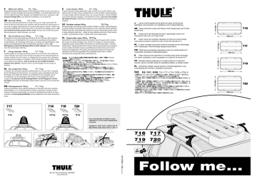 S Tillåten last: 100 kg. 717: 75 kg. Kontrollera högsta tillåtna taklast för Din bilmodell. Observera att vissa typer av solluckor inte går att öppna med monterad lasthållare. Last skall alltid surras fast väl med spännremmar eller liknande runt lasthållarrören eller i korgramen ej i korgens bottenprofiler. Tag alltid bort lasthållaren vid maskintvätt. D F 717: 75 kg Překontrolujte nejvyšší povolené zatížení Vašeho vozidla. Upozorňujeme, že určité modely otvíracích střech nejdou otevřít s namontovaným nosičem. Náklad musí být vždy připoután řemeny k rourové konstrukci nosiče nebo k rámu nákladového koše – nikdy ke dnu nákladového koše. Před mytím vozidla v automatické myčce vozidel vždy nosič odmontujte. GB These instructions deal with fitting to both square bars and T-track profile bars. D Anleitung für die Montage auf dem Lastenträger sowohl mit Vierkantrohr als auch mit T-spur Profil. PL Dopuszczalny ciężar: 100 kg 717:75 kg. 100 716 (9.6) 100 717 (6) 720 (12) 100 NL In deze montage-instructies wordt de montage op een allesdrager met T-railstangen of rechthoekige stangen beschreven. FIN Tässä asennusohjeessa selostetaan asennus neliöputkella tai Turaputkella varustettuun taakkatelineeseen. PL Instrukcja montażu opisuje zarówno montaż bagażnika z rurą MAX LOAD 75 Kg 1300 mm 716 717 719 720 1020 mm 9,6 kg 719 czworokątną, jak również z zaczepem szynowym. 717: 75 kg. Tarkista automallisi suurin sallittu kattokuorma. Huomaa että tietyn tyyppisiä kattoluukkuja ei voi avata kattotelineen ollessa asennettuna. Kourma on aina sidottava kiinni kuormansitojilla tai vastaavilla taakkatelineen putkiin tai korin reunoihin ei korin pohjaprofiileihin. Poista taakkateline aina ennen koneellista pesua. 6 kg 1300 mm CZ Montážní pokyny platí jak pro montáž nosičů se 4-hrannými rourami, tak pro montáž nosičů do zapuštěné drážky ve střeše vozidla. 75 FIN Maksimipainolasti: 100 kg. 716 717 E Estas instrucciones describen el montaje sobre porta-equipajes con tubos cuadrados y porta-equipajes con sujeción de ranura en T. NL Max. laadgewicht: 100 kg. 717: 75 kg. Controleer de maximaal toegestane dakbelasting van uw auto. Het is mogelijk dat de allesdrager het functioneren van sommige typen zonnedaken beinvloed. De bagage moet altjid met behulp van sjorbanden of iets dergelijks aan de dwarsstangen van de allesdrager of het frame van het bagagerek worden vastgezet en mag niet aan de bodemprofielen van het bagagerek worden bevistigd. Demonteer de allesdrager altijd wanneer u de auto in de carwash laat wassen. 717 1600 mm F Cette notice de montage sapplique à la fois aux porte-charge avec barres à section carrée et à ceux munis de rainures en T. Sprawdź ile wynosi maksymalny, dozwolony ciężar bagażu, który można przewozić na dachu Twojego auta. Zwróć też uwagę, że zamontowanie bagażnika może uniemożliwić otwieranie się niektórych typów „dachów słonecznych”. Bagaż powinien być zawsze sztywno przywiązany, przy pomocy pasów zaciskowych lub czegoś o podobnym przeznaczeniu, do rury lub ramy kosza bagażnika. Nie należy natomiast przywiązywać bagażu do spodniej części kosza bagażnika. W przypadku mycia auta w myjni automatycznej bagażnik należy zdemontować. 719 (8.5) 716 820 mm Charge maximum: 100 kg. 717: 75 kg. Vérifier quelle est la charge maximale autorisée sur le toit de vorte modèle de voiture.Veuillez noter que le porte-charge peut gêner le bon fonctionnement de certains modèles de toit-ouvrants. Le chargement doit toujours être solidement maintenu par des sangles ou similaires fixées autour des barres du porte-charge ou au cadre de de la galeria mais en aucun cas aux profilés formant le plancher de la galeria. Toujours enlever le porte-bagage lors du lavage en machine. S Denna monteringsanvisning beskriver både montering på lasthållare med fyrkantrör och lasthållare med T-spårsinfästning. CZ Povolené zatížení: 100 kg 520 mm Max Gewicht der Last: 100 kg. 717: 75 kg. Überprüfen Sie die höchstzulässige Dachlast für Ihr Fahrzeug. Bitte beachten Sie, daß gewisse Schiebedächer bei montiertem Lastenträger nicht geöffnet werden können. Die Zuladung muß immer zuverlässig mit Spannbändern o.dgl. an den Lastenträgerrohren oder am Korbrahem gesichert werden- eine Befestigung an den Korb-Bodenprofilen ist nicht zulässig! In der Waschanlage stets den Lastenträger entfernen. Carga máxima: 100 kg 717: 75 kg. Controle el peso máximo permisible sobre el techo de su coche. Observe que algunos tipos de techo solar no pueden abrirse si está montado el porta-equipajes. La carga siempre deberá afirmarse bien con correas tensadas o similar alrederor de los tubos del porta-equipajes o del bastidor de la baca pero no en los perfiles del fondo de la baca. Desmontar siempre el porta-equipajes al lavar el coche a máquina. 820 mm GB Max load: 100 kg. 717: 75 kg. Check the maximum permitted roof load for your cars make and model. Be aware of that the load carrier may interfere with the function of certain types of sun roofs. Luggage should always be secured with straps or similar which must be passed round the bars of the load carrier or the frame the luggage carrier and not round the bottom sections of the carrier. Always remove the load carrier before putting the vehicle through a car-wash. E 720 1600 mm 719 720 8,5 kg MAX LOAD 100 Kg 12 kg Se la vostra lingua non è compresa nelle istruzioni, prendete contatto conil rivenditore per informazioni. Caso sua língua não esteja nas instruções, contate a loja para informações. Если в инструкции нет Вашего языка, обращайтесь за получением информации в магазин. 716 717 719 720 700 mm 27 1/4 inch 1000-15-4 1000-15-3 1000-15-1 1000-15-2 Box 69, 330 33 Hillerstorp, SWEDEN www.thule.com 926•3DF/ 501495305 TÜV Rheinland geprüfte Sicherheit Follow m