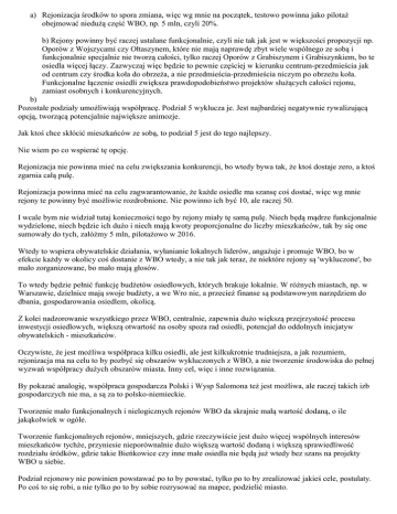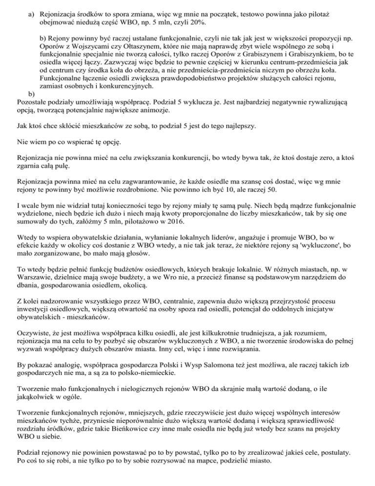 a) Rejonizacja środków to spora zmiana, więc wg mnie na początek, testowo powinna jako pilotaż obejmować niedużą część WBO, np. 5 mln, czyli 20%. b) Rejony powinny być raczej ustalane funkcjonalnie, czyli nie tak jak jest w większości propozycji np. Oporów z Wojszycami czy Ołtaszynem, które nie mają naprawdę zbyt wiele wspólnego ze sobą i funkcjonalnie specjalnie nie tworzą całości, tylko raczej Oporów z Grabiszynem i Grabiszynkiem, bo te osiedla więcej łączy. Zazwyczaj więc będzie to pewnie częściej w kierunku centrum-przedmieścia jak od centrum czy środka koła do obrzeża, a nie przedmieścia-przedmieścia niczym po obrzeżu koła. Funkcjonalne łączenie osiedli zwiększa prawdopodobieństwo projektów służących całości rejonu, zamiast osobnych i konkurencyjnych. b) Pozostałe podziały umożliwiają współpracę. Podział 5 wyklucza je. Jest najbardziej negatywnie rywalizującą opcją, tworzącą potencjalnie największe animozje. Jak ktoś chce skłócić mieszkańców ze sobą, to podział 5 jest do tego najlepszy. Nie wiem po co wspierać tę opcję. Rejonizacja nie powinna mieć na celu zwiększania konkurencji, bo wtedy bywa tak, że ktoś dostaje zero, a ktoś zgarnia całą pulę. Rejonizacja powinna mieć na celu zagwarantowanie, że każde osiedle ma szansę coś dostać, więc wg mnie rejony te powinny być możliwie rozdrobnione. Nie powinno ich być 10, ale raczej 50. I wcale bym nie widział tutaj konieczności tego by rejony miały tę samą pulę. Niech będą mądrze funkcjonalnie wydzielone, niech będzie ich dużo i niech mają kwoty proporcjonalne do liczby mieszkańców, tak by się one sumowały do tych, załóżmy 5 mln, pilotażowo w 2016. Wtedy to wspiera obywatelskie działania, wyłanianie lokalnych liderów, angażuje i promuje WBO, bo w efekcie każdy w okolicy coś dostanie z WBO wtedy, a nie tak jak teraz, że niektóre rejony są 'wykluczone', bo mało zorganizowane, bo mało mają głosów. To wtedy będzie pełnić funkcję budżetów osiedlowych, których brakuje lokalnie. W różnych miastach, np. w Warszawie, dzielnice mają swoje budżety, a we Wro nie, a przecież finanse są podstawowym narzędziem do dbania, gospodarowania osiedlem, okolicą. Z kolei nadzorowanie wszystkiego przez WBO, centralnie, zapewnia dużo większą przejrzystość procesu inwestycji osiedlowych, większą otwartość na osoby spoza rad osiedli, potencjał do oddolnych inicjatyw obywatelskich - mieszkańców. Oczywiste, że jest możliwa współpraca kilku osiedli, ale jest kilkukrotnie trudniejsza, a jak rozumiem, rejonizacja ma na celu to by pozbyć się obszarów wykluczonych z WBO, a nie tworzenie środowiska do pełnej wyzwań współpracy dużych obszarów miasta. Inny cel, więc i inne rozwiązania. By pokazać analogię, współpraca gospodarcza Polski i Wysp Salomona też jest możliwa, ale raczej takich izb gospodarczych nie ma, a są za to polsko-niemieckie. Tworzenie mało funkcjonalnych i nielogicznych rejonów WBO da skrajnie małą wartość dodaną, o ile jakąkolwiek w ogóle. Tworzenie funkcjonalnych rejonów, mniejszych, gdzie rzeczywiście jest dużo więcej wspólnych interesów mieszkańców tychże, przyniesie nieporównalnie dużo większą wartość dodaną i większą sprawiedliwość rozdziału śródków, gdzie takie Bieńkowice czy inne małe osiedla nie będą już wtedy bez szans na projekty WBO u siebie. Podział rejonowy nie powinien powstawać po to by powstać, tylko po to by zrealizować jakieś cele, postulaty. Po coś to się robi, a nie tylko po to by sobie rozrysować na mapce, podzielić miasto. Ja się domyślam, że dużo wygodniejsze i mniej 'upierdliwe' byłoby zrobienie 10ciu rejonów, zamiast 50ciu, ale WBO nie ma na celu wygody urzędników, tylko to by spełniać pewne cele typu: możliwie sprawiedliwe rozdysponowywanie środków na małe inwestycje, wspieranie postaw obywatelskich itd. A 50 rejonów dużo lepiej spełni te zasady. Przy 10ciu rejonach, ryzyko wykluczenia z WBO jest dalej duże. Przy 50ciu nie, bo one mogą być zbliżone obszarami do funkcjonalnych osiedli i wtedy w sposób gwarantowanych, każda społeczność uzyska jakieś inwestycje u siebie, a to zachęci do angażowania się także w samorządność lokalną oraz w WBO na poziomie ogólnomiejskim. 10 rejonów wiele nie zmieni w stosunku do stanu obecnego. To będzie kosmetyczna i mało funkcjonalna zmiana. Wykluczone obecnie osiedla, w dużej mierze dalej takimi pozostaną. Nie daje to gwarancji wartości dodanej, takiej jaką daje 50 rejonów, chociażby i zrobionej wg podziałów na osiedla, by nie wymyślać od zera jakichś innych. Osiedli jest bodajże 48. c) c) Propozycja z mapki 5 jest całkowicie nielogiczna, niefunkcjonalna i budząca tylko niezdrową formę rywalizacji między osiedlami: albo my albo oni. To bez sensu. d) Fundusze rejonowe można byłoby zrobić na takiej zasadzie by tam były jedynie projekty z małej puli możliwe, albo nawet z mikro puli, czyli np. do 50 tys zł, tudzież z obu. Przynajmniej w pilotażu. Ogólnowrocławsko dalej byłyby projekty z trzech puli, jak w zeszłym roku, ale z mniejszą kwotą na małe projekty wtedy, bo trochę z nich uzyska szansę na realizację z kwoty na rejony. e) Kwoty na pule powinny być znane z góry, wtedy nie ma zaskoczenia i protestów na to jak sobie Biuro ds. Partycypacji Społecznej, odgórnie i arbitralnie ustala kwoty. Przykładowo: 25 mln na całość WBO, w tym: - 5 mln na mikro i małe projekty rejonowe - 5 mln na małe projekty ogólnowrocławskie - 7 mln na średnie projekty ogólnowrocławskie - 8 mln na duże projekty ogólnowrocławskie f) Tak jak w każdym normalnym głosowaniu w Polsce, cząstkowe wyniki wyborów powinny być podawane w miarę zliczania głosów, to jest prawo obywateli do informacji publicznej i Biuro ds. Partycypacji Społecznej łamie prawo ustawy o dostępie do informacji publicznej, nie upubliczniając ty