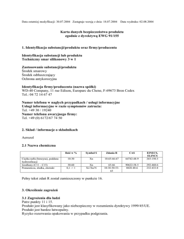 Data ostatniej modyfikacji: 30.07.2004 Zastępuje wersję z dnia: 18.07.2004 Data wydruku: 02.08.2004 Karta danych bezpieczeństwa produktu zgodnie z dyrektywą EWG 91/155 1. Identyfikacja substancji/produktu oraz firmy/producenta Identyfikacja substancji lub produktu Techniczny smar silikonowy 3 w 1 Zastosowanie substancji/produktu Środek smarowy Środek odtłuszczający Ochrona antykorozyjna Identyfikacja firmy/producenta (nazwa spółki) WD-40 Company, 11 rue Edison, Europarc du Chene, F-69673 Bron Cedex Tel.: 04 72 14 67 47 Numer telefonu w nagłych przypadkach / usługi informacyjne Usługi informacyjne w razie symptomów zatrucia: Tel. +49 30 / 19240 Numer telefonu awaryjnego firmy: Tel. +49 (0) 6172/67 74 50 2. Skład / informacje o składnikach Aerozol 2.1 Nazwa chemiczna CięŜka nafta (benzyna), poddana hydrorafinacji Izoalkany (C11 – C15) Pomarańcza, słodka, ekstrakt Ilość w % Symbol S Zdania R CAS 10-30 Xn 10-65-66-67 64742-48-9 EINECS, ELINCS 265-150-3 30-60 0,1 -< 1 Xn Xi//Xn/N 65-66 10-38-50-5365 90622-58-5 8028-48-6 292-460-6 232-433-8 Pełny tekst zdań R został zamieszczony w punkcie 16. 3. Określenie zagroŜeń 3.1 ZagroŜenia dla ludzi Patrz punkty 11 i 15. Produkt jest klasyfikowany jako niebezpieczny w rozumieniu dyrektywy 1999/45/UE. Produkt jest bardzo łatwopalny. Ryzyko rozerwania opakowania w przypadku podgrzania. Opakowanie ciśnieniowe. Chronić przed bezpośrednim działaniem promieni słonecznych oraz temperatury przekraczającej 50oC. Nie przedziurawiać ani nie wrzucać opakowania do ognia, nawet po wykorzystaniu produktu. Długotrwałe naraŜenie na działanie produktu moŜe spowodować wysuszenie lub popękanie skóry. Wdychanie oparów moŜe spowodować senność i zawroty głowy. 3.2 ZagroŜenia dla środowiska Patrz punkt 12. 4. Pierwsza pomoc 4.1 Wdychanie Wyprowadzić osobę poszkodowaną na świeŜe powietrze. Wyprowadzić osobę poszkodowaną z zagroŜonego miejsca. W razie zaburzeń oddychania – konieczne jest zastosowanie aparatów oddechowych. 4.2 Kontakt z oczami Przepłukać duŜą ilością wody przez kilka minut. W razie konieczności zwrócić się do lekarza. 4.3 Kontakt ze skórą Umyć duŜą ilością wody z mydłem i natychmiast zdjąć zabrudzone lub pochlapane ubrania. W przypadku podraŜnienia skóry (zaczerwienienie itp.) naleŜy skontaktować się z lekarzem. 4.4 Połknięcie Dokładnie przepłukać usta duŜą ilością wody. Natychmiast skontaktować się z lekarzem. Pokazać lekarzowi kartę danych produktu. Nie powodować wymiotów. Ryzyko przedostania się produktu do płuc. 4.5 Specyficzne środki pierwszej pomocy Kran do płukania oczu. 5. Środki ochrony przeciwpoŜarowej 5.1 Właściwe środki gaśnicze Mgiełka wodna Suchy proszek gaśniczy Proszek gaśniczy W razie niebezpieczeństwa chłodzić pojemniki wodą. 5.2 Niewłaściwe środki gaśnicze, których nie naleŜy stosować ze względów bezpieczeństwa Nie przebadane. 5.3 Szczegółowe zagroŜenia związane z naraŜeniem na działanie substancji/produktu, produktów spalania i wytwarzających się gazów W razie poŜaru mogą wytwarzać się: ZagroŜenie wybuchem rozgrzanych opakowań. Tlenki węgla Niebezpieczne opary cięŜsze od powietrza. W przypadku rozprzestrzeniania się tuŜ nad powierzchnią ziemi, poŜar moŜe wybuchnąć nawet jeŜeli źródła zapłonu znajdują się w duŜej odległości. 5.4 Specjalne wyposaŜenie ochronne dla osób walczących z poŜarem NiezaleŜne aparaty oddechowe. 5.5 Inne zalecenia Odprowadzać wodę gaśniczą zgodnie z obowiązującymi przepisami miejscowymi. 6. Postępowanie w wypadku nieprzewidzianego wycieku Patrz punkt 13 oraz informacje dotyczące osobistego wyposaŜenia ochronnego - punkt 8. 6.1 Bezpieczeństwo osobiste Przechowywać w bezpiecznej odległości od źródeł zapłonu. Nie palić tytoniu. Zapewnić odpowiednią wentylację. Unikać kontaktu ze skórą oraz oczami i wdychania produktu. Stosować odpowiednie środki zabezpieczające przed wyładowaniami statycznymi. 6.2 Ochrona środowiska Zapobiegać powaŜnym wyciekom produktu. Unikać przedostania się produktu do studzienek wentylacyjnych. Unikać zanieczyszczenia wód gruntowych i powierzchniowych oraz gleby. 6.3 Sposoby czyszczenia W przypadku wycieku produktu w postaci aerozolu / gazu, zapewnić odpowiedni dopływ świeŜego powietrza. Substancja aktywna: Zbierać za pomocą środków wiąŜących ciecze (np. uniwersalne środki wiąŜące, piasek) i usuwać zgodnie z zaleceniami zamieszczonymi w punkcie 13. 7. UŜytkowanie i przechowywanie produktu 7.1 UŜytkowanie Informacje dotyczące uŜytkowania produktu: Patrz punkt 6.1. Zapewnić dobrą wentylację pomieszczeń. Przestrzegać zaleceń zamieszczonych na etykiecie i w instrukcji obsługi. Stosować odpowiednie środki zabezpieczające przed wyładowaniami statycznymi. Stosować odpowiednie procedury robocze zgodnie z instrukcjami dotyczącymi produktów. NaleŜy myć ręce przed kaŜdą przerwą w pracy i po jej zakończeniu. W miejscu pracy nie naleŜy spoŜywać Ŝadnych posiłków ani napojów lub palić tytoniu. 7.2 Przechowywanie Wymogi dotyczące magazynów i pojemników: Nie przechowywać produktu w korytarzach i na klatkach schodowych. Przestrzegać specjalnych przepisów dotyczących produktów w aerozolu. Przestrzegać przepisów dotyczących gazów technicznych TRG 300 (przepisy niemieckie). Specyficzne warunki przechowywania: Patrz punkt 10.2. Przechowywać w miejscu zabezpieczonym przed bezpośrednim działaniem promieni słonecznych oraz temperaturą przekraczającą 50oC. Przechowywać w miejscu suchym. Przechowywać w miejscu chłodnym. 8. Kontrola naraŜenia / osobiste wyposaŜenie ochronne Zapewnić odpowiednią wentylację, taką jak miejscowa instalacja wydechowa lub ogólny system odprowadzania powietrza. JeŜeli to nie wystarczy, w celu zapewnienia stęŜenia na poziomie nie przekraczającym maksymalnych wartości dozwolonych na stanowiskach pracy (VME, MAK), nal