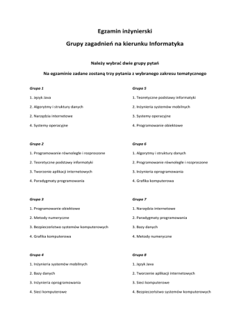Egzamin inżynierski Grupy zagadnień na kierunku Informatyka Należy wybrać dwie grupy pytań Na egzaminie zadane zostaną trzy pytania z wybranego zakresu tematycznego Grupa 1 Grupa 5 1. Język Java 1. Teoretyczne podstawy informatyki 2. Algorytmy i struktury danych 2. Inżynieria systemów mobilnych 2. Narzędzia internetowe 3. Systemy operacyjne 4. Systemy operacyjne 4. Programowanie obiektowe Grupa 2 Grupa 6 1. Programowanie równoległe i rozproszone 1. Algorytmy i struktury danych 2. Teoretyczne podstawy informatyki 2. Programowanie równoległe i rozproszone 3. Tworzenie aplikacji internetowych 3. Inżynieria oprogramowania 4. Paradygmaty programowania 4. Grafika komputerowa Grupa 3 Grupa 7 1. Programowanie obiektowe 1. Narzędzia internetowe 2. Metody numeryczne 2. Paradygmaty programowania 3. Bezpieczeństwo systemów komputerowych 3. Bazy danych 4. Grafika komputerowa 4. Metody numeryczne Grupa 4 Grupa 8 1. Inżynieria systemów mobilnych 1. Język Java 2. Bazy danych 2. Tworzenie aplikacji internetowych 3. Inżynieria oprogramowania 3. Sieci komputerowe 4. Sieci komputerowe 4. Bezpieczeństwo systemów komputerowych Zagadnienia dotyczące wybranych przedmiotów Przedstawione zagadnienia mają charakter poglądowy – na egzaminie mogą pojawić się pytania o podobnym sformułowaniu, bądź takie, które ostatecznie nie znalazły się na liście Inżynieria oprogramowania 1. Czym jest model i jakie możliwości reprezentacji modeli oferuje UML? 2. Podstawowe cechy obiektowości: wymień i scharakteryzuj 3. Co to jest scenariusz, do czego służy i z czego się składa? 4. Scharakteryzuj diagram przypadków użycia: elementy i zasady budowy 5. Wyjaśnij ideę metody CRC 6. Co to jest, do czego służy i z jakich elementów się składa diagram klas? 7. Jakimi inwariantami charakteryzuje się klasa? 8. Jakie są typy związków w UMLu? 9. Jakie są perspektywy projektu w UMLu? Do czego służą? 10. Wyjaśnij pojęcia klasy abstrakcyjnej i ekstensji klasy 11. Czym charakteryzują się atrybuty i metody klasy 12. Scharakteryzuj podobieństwa i różnice pomiędzy asocjacją, agregacją i kompozycją. Podaj przykłady 13. Co to jest maszyna stanowa i w jaki sposób można reprezentować ją w UML? Bazy danych 1. System baz danych – definicja pojęcia, elementy systemu i zależności między nimi. 2. Architektura systemu baz danych – poziomy opisu danych. 3. Perspektywy – definicja pojęcia, zastosowanie w praktyce. 4. Wyzwalacze – definicja pojęcia, rodzaje, przykłady. 5. Język DML w bazach danych – zastosowanie, przykłady instrukcji. 6. Język DDL w bazach danych – zastosowanie, przykłady instrukcji. 7. Związki między tabelami – rodzaje, cechy związków, przykłady. 8. Integralność danych – rodzaje, sposoby zapewnienia integralności w bazach danych. 9. Transakcja – definicja, cechy transakcji. 10. Awarie w systemach baz danych – rodzaje, sposoby odtwarzania stanu spójnego bazy. 11. Normalizacja baz danych – definicja pojęcia, cechy, celowość stosowania. 12. Klucze w bazach danych – definicja pojęcia, rodzaje, obszary zastosowań. Teoretyczne podstawy informatyki 1. Automaty skończone 2. Wyrażenia regularne 3. Automaty z wyjściem 4. Automaty ze stosem i gramatyki bezkontekstowe 5. Maszyna Turinga 6. Języki rekurencyjnie przeliczane 7. Złożoność pamięciowa. Twierdzenie o hierarchii 8. Złożoność czasowa. Twierdzenie o hierarchii 9. Porównanie złożoności deterministycznej i niedeterministycznej 10. Klasy problemów P i NP. Przykłady problemów NP Metody numeryczne 1. Reprezentacja liczb zmiennopozycyjnych w komputerze 2. Analiza błędu wytworzonego, algorytm numerycznie poprawny, zadania źle uwarunkowane 3. Zagadnienie interpolacji 4. Zagadnienie aproksymacji 5. Metody całkowania numerycznego 6. Metody skończone rozwiązywania układów równań liniowych 7. Równania i układy równań algebraicznych nieliniowych 8. Metody rozwiązywania równań różniczkowych zwyczajnych Algorytmy i struktury danych 1. Czym są: tablica, stos, lista, kolejka? Jakie są ich główne właściwości i jak wygląda organizacja w pamięci? 2. Przedstawić i omówić algorytmy wyszukiwania wzorca w danych binarnych i tekstowych (m.in. KMP,KR) 3. Omówić główne algorytmy sortowania, jaka jest ich złożoność czasowa? 4. Funkcje mieszające – czym są i gdzie się je stosuje? 5. Drzewa BST – jak działają, jak się buduje i gdzie stosuje? 6. Czym są drzewa AVL? 7. Grafy - reprezentacja w pamięci i własności 8. Algorytm Grahama / otoczka wypukła Bezpieczeństwo systemów komputerowych 1. Podpis elektroniczny - zasada działania, funkcje 2. Funkcje skrótu, HMAC, sól i pieprz - pojęcia, zastosowanie, funkcje 3. Tryby pracy algorytmów kryptograficznych - przykłady, cechy, zastosowania 4. Macierze dysków RAID - rodzaje, cechy, zastosowania 5. Wirtualizacja - wady, zalety, wpływ na bezpieczeństwo 6. Kryptografia symetryczna i asymetryczna - pojęcia i porównanie (wady, zalety, zastosowania) 7. Szyfry kaskadowe - zasada działania i wykorzystywane operacje (elementy) 8. Infrastruktura klucza publicznego 9. Rodzaje kopii zapasowej 10. Szyfr monoalfabetyczny - zasada działania, słabości Inżynieria systemów mobilnych 1. Warstwy w architekturze współczesnych systemów mobilnych, ich elementy i funkcje 2. Struktura aplikacji mobilnej dla systemu Android 3. Najważniejsze elementy graficznego interfejsu użytkownika i ich zastosowanie w systemie Android 4. Sposoby trwałego przechowywania danych w systemie Android 5. Przesyłanie danych pomiędzy elementami aplikacji w systemie Android 6. Aktywności, usługi, odbiorcy rozgłoszeń – znaczenie podstawowych elementów aplikacji mobilnej dla systemu Android 7. Sposoby wykonywania zadań w tle w systemie Android 8. Budowa pakietu aplikacji we współczesnych systemach mobilnych 9. Wykonywanie aplikacji we współczesnych systemach mobilnych (środowiska uruchomieniowe, model