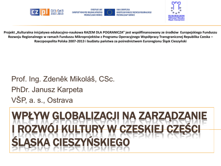 Projekt „Kulturalna inicjatywa edukacyjno-naukowa RAZEM DLA POGRANICZA” jest współfinansowany ze środków Europejskiego Funduszu Rozwoju Regionalnego w ramach Funduszu Mikroprojektów z Programu Operacyjnego Współpracy Transgranicznej Republika Czeska – Rzeczpospolita Polska 2007-2013 i budżetu państwa za pośrednictwem Euroregionu Śląsk Cieszyński Prof. Ing. Zdeněk Mikoláš, CSc. PhDr. Janusz Karpeta VŠP, a. s., Ostrava WPŁYW GLOBALIZACJI NA ZARZĄDZANIE I ROZWÓJ KULTURY W CZESKIEJ CZĘŚCI ŚLĄSKA CIESZYŃSKIEGO KULTURA I ZARZĄDZANIE W naszej pracy traktujemy kulturę jako "dobrowolne dzielenie się wartościami, ideami i podejściami." • Zarządzanie jest rozumiane jako "celowa kontrola obiektu zarządzanego przez podmiot zarządzający". Tak więc, chodzi o tworzenie celów, planowanie, podejmowanie decyzji, przywództwo i motywowanie ludzi, a także regulację zarządzanego systemu. MOŻLIWOŚCI ZARZĄDZANIA KULTURĄ LOKALNĄ Tab. 1: Interakcje rzeczywistości obiektywnej i subiektywnej I-porządek IIobiektywny spontaniczność obiektywna A-subiektywny porządek AI AII Bspontaniczność obiektywna BI BII MOŻLIWOŚCI ZARZĄDZANIA KULTURĄ LOKALNĄ Połączenie obiektywnego i subiektywnego porządku (AI) jest szczególnie widoczne w kulturze korporacyjnej.Typowym przykładem jest specyficzna kultura górnicza w okolicach miasta Karwina (OKR - Ostrawsko-Karwiński Rewir), gdzie obiektywne warunki naturalne i prawidłowości istnieją w połączeniu z rygorystycznymi przepisami pracy, które muszą być przestrzegane w kopalniach. Nabyte zwyczaje, wartości, postawy i pomysły na "kopalaniach" są odzwierciedlone w życiu osobistym "górników". Co ciekawe po drugiej stronie Śląska Cieszyńskiego można zauważyć inne objawy. Życie górali w trudnych warunkach naturalnych, specyficzna praca (wypas) itp., mają również zasadniczy wpływ na lokalną kulturę wskutek oddziaływania obiektywnego i subiektywnego porządku środowiska naturalnego. MOŻLIWOŚCI ZARZĄDZANIA KULTURĄ LOKALNĄ • Połączenie subiektywnego porządku i obiektywnej spontaniczności (AII) jest typowe dla kryzysowych sytuacji na obszarach Śląska Cieszyńskiego z działalnością górniczą. Na przykład wypadek śmiertelny, wybuch gazu kopalnianego itp. (jako spontaniczne obiektywne zjawisko) rozpoczyna formalne i nieformalne procesy subiektywne (solidarność górników z rodzinami zmarłych kolegów, rekacje gmin i związków na niefortunny przypadek, organizowanie pogrzebów, itp), które nie są powszechne w innych branżach i regionach. Podobne procesy można opisać w wypadku górali Śląska Cieszyńskiego, kultura regionu pod naciskiem obiektywnej spontaniczności (nieoczekiwane zmiany warunków naturalnych, pożary, powodzie i inne zjawiska kryzysowe) jest wchłaniana przez historycznie skonstruowany subiektywny porządek (formalny porządek i również nieformalne praktyki, tradycje i zasady). MOŻLIWOŚCI ZARZĄDZANIA KULTURĄ LOKALNĄ Specyfika połączenia subiektywnej spontaniczności i obiektywnego porządku, (BI) znajdują odzwierciedlenie zarówno na obszarach górniczych i górali w chwilach, kiedy "wszystko jest tak jak być powinno" (wysoka wydajność, udane zbiory, warunki wydobycia nie komplikowały się wskutek katastrof naturalnych, zadania związane z wydobyciem zostały spełnione itp). Typowe objawy tego zjawiska mogą być widoczne w wypadku uroczystości góralskich lub górniczych. Społeczność lokalna wyraża spontaniczną radość życia i pracy, bez udawania i pozerstwa. MOŻLIWOŚCI ZARZĄDZANIA KULTURĄ LOKALNĄ Prawdziwa (autentyczna) kultura regionu znajduje odzwierciedlenie w połączeniu z obiektywną i subiektywną spontanicznością (BII). Pojawiają się sytuacje, podczas których są spontanicznie utworzone zespoły artystyczne, kluby, itp.Typowym przykładem może być ostatnie dziesięciolecie, gdy na obszarze Trzyńca dosłownie wykluło się wiele najlepszych wokalistów i zespołów (np. Klus, Farna), przedsiębiorców (bracia Wałachowie) itp. Mogą się również spontanicznie zrodzić negatywne przejawy kultury (np. sprzeczności między narodowościami, wyznawcami różnych kościołów, itp), które zostało odnotowano także w niedawnej przeszłości, w czeskiej części Śląska Cieszyńskiego. NACISK TENDENCJI GLOBALIZACYJNYCH NA POCZĄTKU 21 WIEKU • Jeden kanał jest spontaniczny - poprzez wykorzystanie nowych technologii komunikacyjnych i sieci społecznych (bez jakiegokolwiek subiektywnego porządku lokalnego) spontanicznie jest wprowadzana obca kultura, zwłaszcza w środowisku młodzieży. W dziedzinie filozofii i stylu życia, kultury krajów wschodnich przedostają się do tego regionu. W dziedzinie kultury muzycznej źródła anglosaskie mają duży wpływ.Przecięciem tych procesów jest znaczne zróżnicowanie wartości, idei i podejścia do życia. Drugim kanałem, który wprowadza nowe parametry do kultury regionu, są przejawy inwestycji strategicznych. NACISK TENDENCJI GLOBALIZACYJNYCH NA POCZĄTKU 21 WIEKU Można zatem wyciągnąć dwa wnioski: 1) Dwa filary kultury regionu, które mają wpływ na Śląsk Cieszyński: górnicza i góralska kultura zbudowana na fundamentach zakorzenionych w polskiej tradycji, uzupełniona morawskimi i słowackimi wpływami, będzie ustępować w najbliższej przyszłości nowym uwarunkowaniom kulturowym procesów globalizacyjnych (patrz wyżej) NACISK TENDENCJI GLOBALIZACYJNYCH NA POCZĄTKU 21 WIEKU 2) Przesunięcie zainteresowania z rzeczywistej kultury do kultury wirtualnej opartej nie na realnych społecznościach lokalnych, ale raczej na społecznościach wirtualnych sieci społecznych będzie wymagać zmian w kształtowaniu kultury lokalnej. NACISK TENDENCJI GLOBALIZACYJNYCH NA POCZĄTKU 21 WIEKU Jesteśmy przekonani, iż będzie konieczne dokonać dwu zmian, tak, żeby wartości, historyczny kontekst idei i podejścia do regionu czeskiej części Śląska Cieszyńskieg