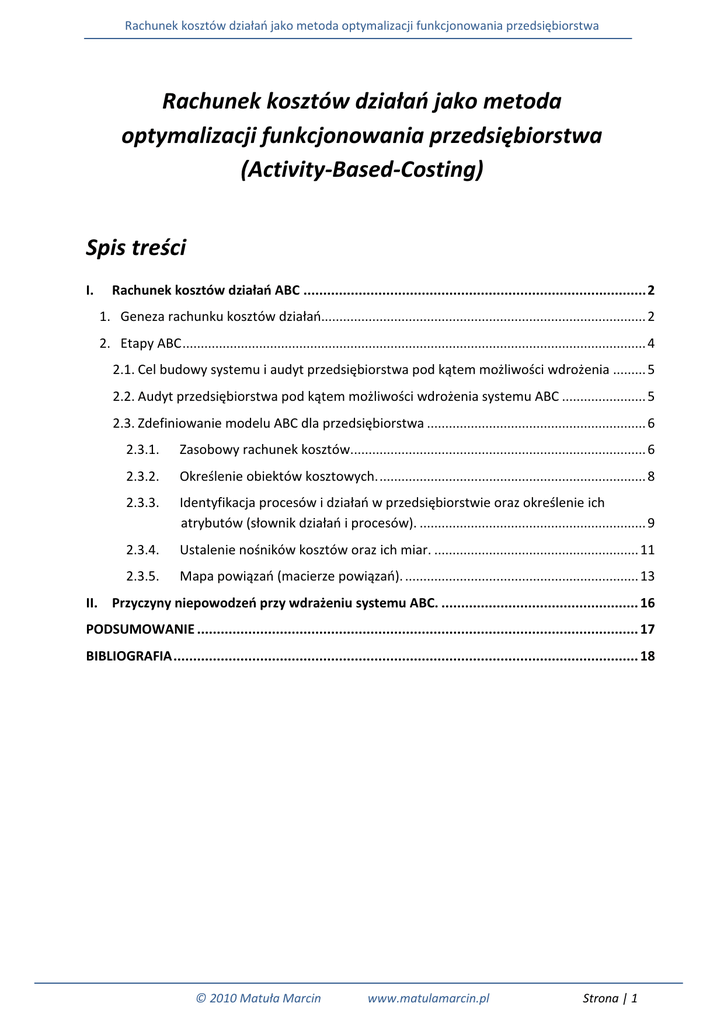 Rachunek kosztów działań jako metoda optymalizacji funkcjonowania przedsiębiorstwa Rachunek kosztów działań jako metoda optymalizacji funkcjonowania przedsiębiorstwa (Activity-Based-Costing) Spis treści I. Rachunek kosztów działań ABC ....................................................................................... 2 1. Geneza rachunku kosztów działań......................................................................................... 2 2. Etapy ABC ............................................................................................................................... 4 2.1. Cel budowy systemu i audyt przedsiębiorstwa pod kątem możliwości wdrożenia ......... 5 2.2. Audyt przedsiębiorstwa pod kątem możliwości wdrożenia systemu ABC ....................... 5 2.3. Zdefiniowanie modelu ABC dla przedsiębiorstwa ............................................................ 6 2.3.1. Zasobowy rachunek kosztów................................................................................. 6 2.3.2. Określenie obiektów kosztowych. ......................................................................... 8 2.3.3. Identyfikacja procesów i działań w przedsiębiorstwie oraz określenie ich atrybutów (słownik działań i procesów). .............................................................. 9 2.3.4. Ustalenie nośników kosztów oraz ich miar. ........................................................ 11 2.3.5. Mapa powiązań (macierze powiązań). ................................................................ 13 II. Przyczyny niepowodzeń przy wdrażeniu systemu ABC. .................................................. 16 PODSUMOWANIE ................................................................................................................ 17 BIBLIOGRAFIA ...................................................................................................................... 18 © 2010 Matuła Marcin www.matulamarcin.pl Strona | 1 Rachunek kosztów działań jako metoda optymalizacji funkcjonowania przedsiębiorstwa I. RACHUNEK KOSZTÓW DZIAŁAŃ ABC 1. GENEZA RACHUNKU KOSZTÓW DZIAŁAŃ. „Chociaż przewaga konkurencyjna zależy od sukcesu produktów i usług, to wynika ona z efektywności procesów i działań podejmowanych w celu opracowania tych produktów i usług, wytworzenia ich i dostarczenia na rynek. W zasadzie organizacje konkurują bowiem ze sobą właśnie na poziomie działań i procesów. Wyroby i usługi stanowią tylko ich efekt” (A. J. Miller, 2000). Rachunek kosztów to narzędzie, które identyfikuje procesy i działania w przedsiębiorstwie, a także wspomaga zarządzanie nimi. Instrumentem tym jest rachunek kosztów działań ABC nazywany również współczesnym rachunkiem kosztów działań. Rachunek ABC powstał w latach 80 XX wieku i obecnie należy do nowoczesnych modeli rachunku kosztów. Podobnie jak pozostałe rachunki kosztów rachunek kosztów działań jest narzędziem służącym do wspomagania procesów decyzyjnych. Jego głównym zadaniem jest dostarczenie informacji na temat rentowności określonych obiektów kosztowych, którymi mogą być: produkty, usługi, klienci, projekty, kontrakty, kanały dystrybucyjne lub inne obiekty, na które można rozliczyć koszty powstające w przedsiębiorstwie. Główną przesłanką do powstania rachunku kosztów działań była potrzeba lepszego rozliczania kosztów wspólnych. Problem ten istnieje w przedsiębiorstwach, w których udział kosztów pośrednich w ogólnych kosztach przedsiębiorstwa jest wysoki, a także zaistniały takie czynniki jak: duża ilość procesów nie związanych bezpośrednio z produkcją, duża konkurencyjność, dywersyfikacja działalności, klienci o zróżnicowanych wymaganiach, a także korzystanie ze specjalistycznych usług przez przedsiębiorstwa. W tradycyjnym rachunku kosztów rozliczanie kosztów pośrednich, a następnie ich odnoszenie na produkty (obiekty kosztowe) odbywa się jednoetapowo, poprzez doliczenie do kosztów bezpośrednich produktów, kosztów wspólnych, za pomocą określonego klucza rozliczeniowego. Natomiast w rachunku kosztów działań zasoby przedsiębiorstwa rozliczane są najpierw na działania (za pomocą nośników zasobów), a następnie koszty działań przyporządkowywane są do obiektów kosztowych (Rys. 1). Dzięki takiemu rozwiązaniu uwzględnia się działania rzeczywiście powiązane z danym obiektem kosztowym, a także co jest również istotne intensywność tych działań (np.: ilość przezbrojeń maszyny). Dlatego o wielkości przypisanych kosztach wspólnych do określonych obiektów kosztowych nie będzie decydować wielkość produkcji, jak to ma miejsce w przypadku rachunku kosztów pełnych. Warto zwrócić uwagę na fakt, iż niektóre działania nie trafiają bezpośrednio do obiektów kosztowych, ale pośrednio poprzez przypisanie ich najpierw do innych działań. Działania te nazywane są działaniami wspomagającymi. Natomiast niektóre koszty zasobów można bezpośrednio przypisać do obiektów kosztowych. © 2010 Matuła Marcin www.matulamarcin.pl Strona | 2 Rachunek kosztów działań jako metoda optymalizacji funkcjonowania przedsiębiorstwa Rysunek 1. Schemat rozliczenia zasobów na obiekty kosztowe w rach. działań ABC. ZASOBY Pracownicy − Maszyny, urządzenia − Środki transportu − Budynki − Materiały bezpośrednie Materiały pośrednie − itd. − Liczba etatów − Czas pracy − % czas pracy − m2, m3, kwh, kg − itd. ROZLICZENIE DZIAŁANIA − Fakturowanie − Rozładunek Załadunek Wydawanie materiałów − Planowanie sprzedaży − Szkolenia − itd. ROZLICZENIE − − Rozliczenie za pomocą NOŚNIKÓW DZIAŁAŃ DZIAŁANIA WSPOMAGAJĄCE − Rozliczenie za pomocą NOŚNIKÓW ZASOBÓW ROZLICZENIE − − Liczba faktur − Liczba dostaw − maszynogodziny − ilość przezbrojeń − itd. OBIEKTY KOSZTOWE Produkty i usługi Klient, grupa klientów − Re