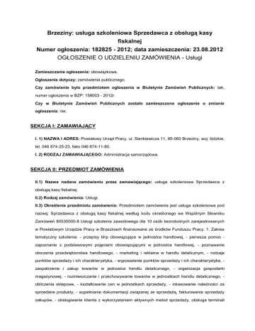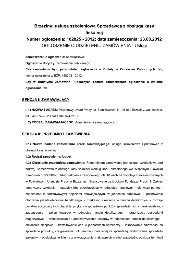 Brzeziny: usługa szkoleniowa Sprzedawca z obsługą kasy fiskalnej Numer ogłoszenia: 182825 - 2012; data zamieszczenia: 23.08.2012 OGŁOSZENIE O UDZIELENIU ZAMÓWIENIA - Usługi Zamieszczanie ogłoszenia: obowiązkowe. Ogłoszenie dotyczy: zamówienia publicznego. Czy zamówienie było przedmiotem ogłoszenia w Biuletynie Zamówień Publicznych: tak, numer ogłoszenia w BZP: 158003 - 2012r. Czy w Biuletynie Zamówień Publicznych zostało zamieszczone ogłoszenie o zmianie ogłoszenia: nie. SEKCJA I: ZAMAWIAJĄCY I. 1) NAZWA I ADRES: Powiatowy Urząd Pracy, ul. Sienkiewicza 11, 95-060 Brzeziny, woj. łódzkie, tel. 046 874-25-23, faks 046 874-11-80. I. 2) RODZAJ ZAMAWIAJĄCEGO: Administracja samorządowa. SEKCJA II: PRZEDMIOT ZAMÓWIENIA II.1) Nazwa nadana zamówieniu przez zamawiającego: usługa szkoleniowa Sprzedawca z obsługą kasy fiskalnej. II.2) Rodzaj zamówienia: Usługi. II.3) Określenie przedmiotu zamówienia: Przedmiotem zamówienia jest usługa szkoleniowa pod nazwą: Sprzedawca z obsługą kasy fiskalnej według kodu określonego we Wspólnym Słowniku Zamówień 80530000-8 Usługi szkolenia zawodowego dla 10 osób bezrobotnych zarejestrowanych w Powiatowym Urzędzie Pracy w Brzezinach finansowane ze środków Funduszu Pracy. 1. Zakres tematyczny szkolenia: - przepisy bhp obowiązujące w jednostce handlowej, - pierwsza pomoc zapoznanie z podstawowymi pojęciami obowiązującymi w jednostce handlowej, - poznawanie otoczenia przedsiębiorstwa handlowego, - marketing i reklama w handlu detalicznym, - rodzaje punktów sprzedaży i ich charakterystyka, - wyposażenie punktów sprzedaży i ich charakterystyka, zaopatrzenie i zakup towarów w jednostce handlu detalicznego, - organizacja gospodarki magazynowej, - rozmieszczanie i przechowywanie towarów w jednostkach handlu detalicznego, obliczenia sklepowe, - kształtowanie cen w jednostkach sprzedaży, - inkasowanie należności za sprzedane produkty, - wypełnianie dokumentacji związanej ze sprzedażą, fakturowanie sprzedaży zakupów, - obsługiwanie klienta z wykorzystaniem aktywnych metod sprzedaży, obsługa terminali kart płatniczych, - zawieranie transakcji sprzedaży, - dekorowanie wnętrza sklepu i okna wystawowego, - obsługa kas fiskalnych. Celem szkolenia będzie przygotowanie teoretyczne i praktyczne osób bezrobotnych, mających zamiar podjąć pracę w zawodzie sprzedawcy z obsługą kasy fiskalnej. 2. Wykonawca zapozna uczestników szkolenia z programem i harmonogramem szkolenia. Wykonawca zapewni uczestnikom szkolenia materiały dydaktyczne zgodnie z zakresem tematycznym szkolenia, notatnik i długopis. Każdy uczestnik ma zapewniony dostęp do stanowiska szkoleniowego w całym procesie nauczania. Wykonawca zapewni każdemu uczestnikowi szkolenia dostęp do stanowiska w trakcie zajęć praktycznych przy kasie fiskalnej oraz zapewni dostęp do stanowiska przy komputerze lub laptopie. 3. Liczba osób objętych szkoleniem - 10. 4. Czas trwania kursu: do 6 tygodni ( do 30 dni roboczych); planowany termin realizacji: sierpień-listopad 2012 r., ilość godzin na jednego uczestnika- 180 godzin zegarowych zajęć teoretycznych i praktycznych, w tym zajęć teoretycznych 80 godzin i zajęć praktycznych 100 godzin, w tym egzamin wewnętrzny. Program szkolenia musi być realizowany według planu nauczania obejmującego przeciętnie nie mniej niż 25 godzin zegarowych w tygodniu (godzina zegarowa szkolenia liczy 60 minut i obejmuje zajęcia edukacyjne liczące 45 minut oraz przerwę liczącą średnio 15 minut, długość przerw może być ustalona w sposób elastyczny). Program szkolenia musi być opracowany zgodnie z rozporządzeniem Ministra Pracy i Polityki Społecznej z dnia 14 września 2010r. w sprawie standardów i warunków prowadzenia usług rynku pracy (Dz. U. z 2010r. Nr 177 poz. 1193 ze zm.) Program szkolenia powinien wykorzystywać standardy kwalifikacji zawodowych, modułowe programy szkoleń zawodowych, dostępne w bazach danych prowadzonych przez MPiPS znajdujących się na stronie internetowej www.standardyiszkolenia.praca.gov.pl. 5.Zajęcia będą odbywały się codziennie w dni robocze (od poniedziałku do piątku) na terenie miasta Brzeziny lub innej miejscowości zgodnie z Rozdziałem IV.2 SIWZ. Zakończenie zajęć nie później niż godz. 18.00. 6.Maksymalna liczba godzin szkoleniowych w ciągu jednego dnia nie może przekroczyć ośmiu. 7. W czasie zajęć powinny być zapewnione właściwe, zgodne z obowiązującymi przepisami warunki bezpieczeństwa i higieny pracy, odpowiednie warunki lokalowe i socjalne (środki higieny osobistej itp.). 8. Instytucja szkoleniowa zobowiązana jest do ubezpieczenia od następstw nieszczęśliwych wypadków uczestników szkolenia, którym nie przysługuje stypendium oraz którym przysługuje stypendium, o którym mowa w art. 41 ust. 3b ustawy o promocji zatrudnienia i instytucjach rynku pracy, czyli uczestnikom szkolenia, którzy w trakcie szkolenia podjęli zatrudnienie, inną pracę zarobkową lub działalność gospodarczą. 9. Instytucja szkoleniowa zapewni nadzór wewnętrzny, przez co należy rozumieć ustalenie opiekuna grupy, który jest do dyspozycji grupy w trakcie szkolenia i odpowiada za organizację i sprawny przebieg szkolenia. 10. Szkolenie zakończy się egzaminem wewnętrznym. 11. Wykonawca wystawi zaświadczenie lub inny dokument potwierdzający ukończenie szkolenia Sprzedawca z obsługą kasy fiskalnej każdemu uczestnikowi szkolenia, który pozytywnie zaliczy egzamin końcowy po ukończeniu szkolenia (wykonawca zobowiązany jest załączyć do oferty wzór zaświadczenia lub innego dokumentu potwierdzającego ukończenie szkolenia i uzyskanie kwalifikacji). Zaświadczenie lub inny dokument potwierdzający ukończenie szkolenia i uzyskania kwalifikacji powinno zawierać, zgodnie z rozporządzeniem MPiPS z dnia 14 września 2010r. w sprawie standardów i warunków prowadzenia usług rynku pracy, o ile przepisy odrębne nie stanowią inac