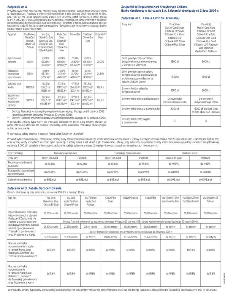 Za∏àczniki do Regulaminu Kart Kredytowych Citibank Banku Handlowego w Warszawie S.A. Za∏àczniki obowiàzujà od 2 lipca 2009 r. Za∏àcznik nr 4 Przyk∏ad wyliczenia rzeczywistej rocznej stopy oprocentowania i ca∏kowitego kosztu kredytu w rozumieniu art. 7 ustawy o kredycie konsumenckim z dnia 20 lipca 2001 roku (Dz.U. Nr 100, poz. 1081 ze zm.) oraz ∏àcznej kwoty wszystkich kosztów, op∏at i prowizji, o której mowa w art. 4 ust. 2 pkt 9 wskazanej ustawy, przy za∏o˝eniu, ˝e posiadacz karty kredytowej dokonuje jednej transakcji bezgotówkowej na kwot´ 8 000 z∏ i powsta∏e w ten sposób zad∏u˝enie zostaje sp∏acone w ciàgu 12 miesi´cy kalendarzowych w równych ratach miesi´cznych, dodajàc kwot´ op∏aty rocznej do pierwszej raty. Typy Kart Oprocentowanie nominalne Rzeczywista roczna stopa oprocentowania Ca∏kowity koszt kredytu ¸àczna kwota wszystkich kosztów, op∏at i prowizji Visa Platinum, MasterCard Platinum, Citibank-LOT Platinum Visa Gold, Citibank-Era Gold, MasterCard Gold, Citibank-BP Gold, Citibank-LOT Gold, Citibank-Plus Gold MasterCard Silver, Citibank-BP Silver, Citibank-Plus Silver Citibank-Elle Visa Silver, Citibank-Era Silver 20,00% 20,00% (23,88%)* (35,76%)** 20,00% (25,80%)* (37,80%)** 20,00% (25,80%)* (33,36%)** 20,00% (25,80%)* (37,80%)** 20,00% 35,88% 30,66% (35,76%)* (52,54%)** 24,40% (31,70%)* (48,06%)** 24,40% (31,70%)* (41,80%)** 24,11% (31,39%)* (47,70%)** 24,84% 1342,91 z∏ 1182,91 z∏ (1362,15 z∏)* (1922,85 z∏)** 977,91 z∏ (1246,55 z∏)* (1815,92 z∏)** 977,91 z∏ 967,91 z∏ (1246,55 z∏)* (1236,55 z∏)* (1603,14 z∏)** (1805,92 z∏)** 992,91 z∏ 1342,91 z∏ 1182,91 z∏ (1362,15 z∏)* (1922,85 z∏)** 977,91 z∏ (1246,55 z∏)* (1815,92 z∏)** 977,91 z∏ 967,91 z∏ 1246,55 z∏)* (1236,55 z∏)* (1603,14 z∏)** (1805,92 z∏)** 992,91 z∏ Za∏àcznik nr 1. Tabela Limitów Transakcji Typy Kart Visa Silver MasterCard Silver Citibank-BP Silver Citibank-Era Silver Citibank-Elle Citibank-LOT Silver Citibank-Plus Silver Visa Gold MasterCard Gold Citibank-BP Gold Citibank-Era Gold Citibank-LOT Gold Citibank-Plus Gold Citibank-LOT Platinum Visa Platinum MasterCard Platinum Limit pojedynczego przelewu bezgotówkowego dokonywanego u Doradcy w CitiPhone 1500 z∏ 3000 z∏ Limit pojedynczego przelewu bezgotówkowego dokonywanego w Automatycznym Bankierze /przez Citibank Online 1500 z∏ 1500 z∏ Dzienny limit przelewów bezgotówkowych 1500 z∏ 3000 z∏ Dzienny limit wyp∏at gotówkowych Do wysokoÊci indywidualnego limitu Do wysokoÊci indywidualnego limitu Dzienny limit wyp∏at z bankomatów 2000 z∏ 5000 zł dla Kart Gold 10 000 zł dla Kart Platinum 3 4 Citibank-LOT Silver * Dotyczy Transakcji wykonanych po wystawieniu pierwszego Wyciàgu po 20 czerwca 2005 r. i przed wystawieniem pierwszego Wyciàgu po 20 stycznia 2006 r. ** Dotyczy Transakcji wykonanych do dnia wystawienia pierwszego Wyciàgu po 20 czerwca 2005 r. W przypadku zmiany typu Karty, do transakcji dokonanych przed datà zmiany, stosuje si´ oprocentowanie w∏aÊciwe dla danego typu Karty, którà dokonano Transakcji, obowiàzujàce w dniu jej dokonania. Dzienny limit liczby wyp∏at z bankomatów W przypadku sp∏aty kredytu w ramach Planu Sp∏at Ratalnych ,,Komfort” Przyk∏ad wyliczenia nominalnej i rzeczywistej rocznej stopy oprocentowania i ca∏kowitego kosztu kredytu w rozumieniu art. 7 ustawy o kredycie konsumenckim z dnia 20 lipca 2001 r. (Dz. U. Nr 100 poz. 1081 ze zm.) oraz ∏àcznej kwoty wszystkich kosztów, op∏at i prowizji, o której mowa w art. 4 ust. 2 pkt 9 wskazanej ustawy, przy za∏o˝eniu, ˝e posiadacz karty kredytowej dokonuje jednej transakcji bezgotówkowej na kwot´ 8 000 z∏ i powsta∏e w ten sposób zad∏u˝enie zostaje sp∏acone w ciàgu 12 miesi´cy kalendarzowych w równych ratach miesi´cznych. Typ Transakcji Typy kart Roczne oprocentowanie nominalne Transakcje gotówkowe Transakcje bezgotówkowe Przelew z Karty Silver, Elle, Gold Platinum Silver, Elle, Gold Platinum Silver, Elle, Gold Platinum do 19,18% do 19,18% do 19,18% do 19,18% do 19,18% do 19,18% Rzeczywista roczna stopa oprocentowania do 20,94% do 20,94% do 20,94% do 20,94% do 28,03% do 28,03% Ca∏kowity koszt kredytu do 855,16 z∏ do 855,16 z∏ do 855,16 z∏ do 855,16 z∏ do 1095,16 z∏ do 1095,16 z∏ Za∏àcznik nr 3. Tabela Oprocentowania Odsetki obliczane sà przy za∏o˝eniu, ˝e rok ma 360 dni, a miesiàc 30 dni. Oprocentowanie Transakcji bezgotówkowych z u˝yciem Karty, jeÊli Zad∏u˝enie nie zosta∏o w ca∏oÊci sp∏acone przed up∏ywem terminu p∏atnoÊci, a tak˝e oprocentowanie Transakcji gotówkowych oraz Przelewów z Karty Visa Silver, MasterCard Silver, Citibank-BP Silver Visa Gold, MasterCard Gold, Citibank-BP Gold Visa Platinum MasterCard Platinum Citibank-Era Silver Citibank-Era Gold Citibank-Elle Visa Citibank-LOT Silver Visa Citibank-Plus Silver Visa Citibank-LOT Gold Visa Citibank-Plus Gold Visa Citibank-LOT Platinum 20,00% rocznie 20,00% rocznie 20,00% rocznie 20,00% rocznie 20,00% rocznie 20,00% rocznie 20,00% rocznie 20,00% rocznie 20,00% rocznie Dotyczy Transakcji wykonanych po wystawieniu pierwszego Wyciàgu po 20 czerwca 2005 r. i przed wystawieniem pierwszego Wyciàgu po 20 stycznia 2006 r. 25,80% rocznie 23,88% rocznie 21,84% rocznie 25,80% rocznie 23,88% rocznie 25,80% rocznie nie dotyczy nie dotyczy nie dotyczy Dotyczy Transakcji wykonanych do dnia wystawienia pierwszego Wyciàgu po 20 czerwca 2005 r. 37,80% rocznie 35,76% rocznie nie dotyczy 37,80% rocznie 35,76% rocznie 33,36% rocznie nie dotyczy nie dotyczy nie dotyczy Roczne nominalne oprocentowanie kredytu w ramach Planu Sp∏at Ratalnych ,,Komfort” dla Transakcji bezgotówkowych do 19,18% do 19,18% do 19,18% do 19,18% do 19,18% do 19,18% do 19,18% do 19,18% do 19,18% Roczne nominalne oprocentowanie w ramach Planu Sp∏at Ratalnych „Komfort” dla Transakcji gotówkowych oraz Przelewów z Karty do 19,18% do 19,18% do 19,18% do 19,18%
