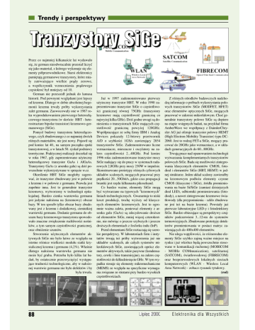 Trendy i perspektywy Tranzystory SiGe Przez co najmniej kilkanaście lat wydawało się, że german nieodwracalnie przestał liczyć się jako materiał, z którego wykonuje się ele− menty półprzewodnikowe. Starsi elektronicy pamiętają germanowe tranzystory, które mia− ły zatrważająco wielkie prądy zerowe, a współczynnik wzmocnienia prądowego częstokroć był mniejszy od 10. German nie przeszedł jednak do lamusa historii. Pod pewnymi względami jest lepszy od krzemu. Dlatego w dobie absolutnej hege− monii krzemu trwały próby wykorzystania zalet germanu. Zaowocowały one w 1987 ro− ku wyprodukowaniem pierwszego heterozłą− czowego tranzystora (w skrócie HBT − hete− rostructure bipolar transistor) krzemowo−ger− manowego (SiGe). Pomysł budowy tranzystora heterozłączo− wego, czyli zbudowanego z co najmniej dwóch różnych materiałów, nie jest nowy. Pojawił się pod koniec lat 40., na samym początku epoki tranzystorowej, a w latach 50. zyskał podstawy teoretyczne. Praktycznej realizacji doczekał się w roku 1967, gdy zaprezentowano użyteczny heterozłączowy tranzystor GaAs i AlGaAs. Tranzystory GaAs (z arsenku galu) są dziś po− wszechnie wykorzystywane w sprzęcie w.cz. Określenie HBT SiGe mogłoby sugero− wać, że tranzystor zbudowany jest w połowie z krzemu i w połowie z germanu. Prawda jest zupełnie inna. Jest to generalnie tranzystor krzemowy, wytworzony w technologii epita− ksjalnej. Bardzo cienka warstewka germanu jest jedynie nałożona na (krzemowy) obszar bazy. W ten sposób tylko obszar bazy zbudo− wany jest z krzemu i dodatkowej, cieniutkiej warstewki germanu. Dodanie germanu do ob− szaru bazy krzemowego tranzystora spowodo− wało znaczne zwiększenie ruchliwości nośni− ków, a tym samym częstotliwości granicznej, oraz obniżenie szumów. Stworzenie użytecznych elementów ak− tywnych SiGe nie było łatwe ze względu na istotne różnice wielkości modułu siatki kry− stalicznej krzemu i germanu (4,2%). Właśnie dlatego nałożona warstewka germanu nie może być gruba. Potrzeba było kilku lat ba− dań, by ostatecznie przezwyciężyć występu− jące trudności technologiczne, aby w nałożo− nej warstwie germanu nie było defektów i by była trwała. 88 Już w 1997 zademonstrowano pierwszy użyteczny tranzystor HBT. W roku 1990 za− prezentowano tranzystor SiGe o częstotliwo− ści granicznej równej 75GHz (tranzystory krzemowe mają częstotliwość graniczną co najwyżej kilka GHz). Dziś godne uwagi są do− niesienia o tranzystorach SiGe mających czę− stotliwość graniczną powyżej 120GHz. Współpracujące ze sobą firmy IBM i Analog Devices pokazały 12−bitowy przetwornik A/D o szybkości 1GS/s zawierający 2854 tranzystorów SiGe. Zademonstrowano liczne wzmacniacze, mieszacze i oscylatory na za− kres częstotliwości 2...40GHz. Pod koniec 1996 roku zademonstrowano tranzystor mocy SiGe nadający się do pracy w systemach rada− rowych 2,8GHz przy mocy 230W w impulsie. Skonstruowano prototypy różnych cyfrowych układów scalonych, mogących pracować przy prędkości 20...30Gbit/s, gdzie czas propagacji bramki jest rzędu kilkunastu pikosekund. Co bardzo ważne, elementy SiGe mogą być wytwarzane na typowych "krzemowych" liniach technologicznych. Gwarantuje to niski koszt produkcji, trochę wyższy od klasycz− nych elementów krzemowych. Jest to ogro− mnie ważna zaleta, ponieważ elementy z ar− senku galu (GaAs) są zdecydowanie droższe od elementów SiGe, mniej więcej czterokrot− nie, nie mówiąc o jeszcze szybszych i jeszcze droższych elementach z fosforku indu (InP). Przed elementami SiGe roztaczają się szero− kie perspektywy. W laboratoriach firm i insty− tutów trwają też próby wytworzenia już nie układów scalonych, ale całych systemów mi− krofalowych SiGe, zawierających oprócz ele− mentów aktywnych, także pasywne (kondensa− tory, cewki i linie transmisyjne), na zakres czę− stotliwości do kilkudziesięciu GHz. W tym wy− padku stosuje się elementy mikromechaniczne (MEMS) ze względu na specyficzne wymaga− nia związane ze stratami przy bardzo wysokich częstotliwościach. Z różnych ośrodków badawczych nadcho− dzą informacje o próbach wykorzystania polo− wych tranzystorów SiGe (MODFET, HFET) oraz elementów optycznych SiGe, mogących pracować w zakresie mikrofalowym. Choć ge− neralnie tranzystory polowe SiGe są dopiero na etapie wstępnych badań, na przykład firma AmberWave we współpracy z DaimlerChry− sler AG już oferuje tranzystor polowy HEMT (High Electron Mobility Transistor) typu DC− 2060. Jest to rodzaj FET−a SiGe, mogący pra− cować do 20GHz jako wzmacniacz, a w ukła− dach generacyjnych do 60...80GHz. Trwają prace nad opanowaniem technologii wytwarzania komplementarnych tranzystorów polowych SiGe. Bada się możliwości zintegro− wania klasycznych elementów CMOS, foto− diod i elementów SiGe (HBT, HEMT) w jed− nej strukturze. Jeden układ scalony zawierałby na krzemowym podłożu elementy czynne CMOS (klasyczne i SiGe), źródła promienio− wania na bazie Si/SiGe (zamiast dzisiejszych diod LED), odbiorniki promieniowania (foto− diody), a nawet zintegrowane krzemowe świa− tłowody (dla przypomnienia − szkło zbudowa− ne jest też na bazie krzemu). Powstały już pierwsze laboratoryjne LED−y i fotodetektory SiGe. Bardzo obiecujące są perspektywy czuj− ników podczerwieni 3...12µm do systemów termowizyjnych. Zbudowano prototypy detek− torów promieniowania w postaci matryc za− wierających do 400x400 elementów. Nie ulega wątpliwości, że różnorodne ele− menty SiGe szybko zajmą ważne miejsce na rynku i już wkrótce będą powszechnie stoso− wane w komunikacji ruchomej (MOBICOM − MOBIe COMmunication), satelitarnej (SATCOM), światłowodowej (FIBRECOM) oraz bezprzewodowych lokalnych sieciach komputerowych (WLAN − Wireless Local Area Networ