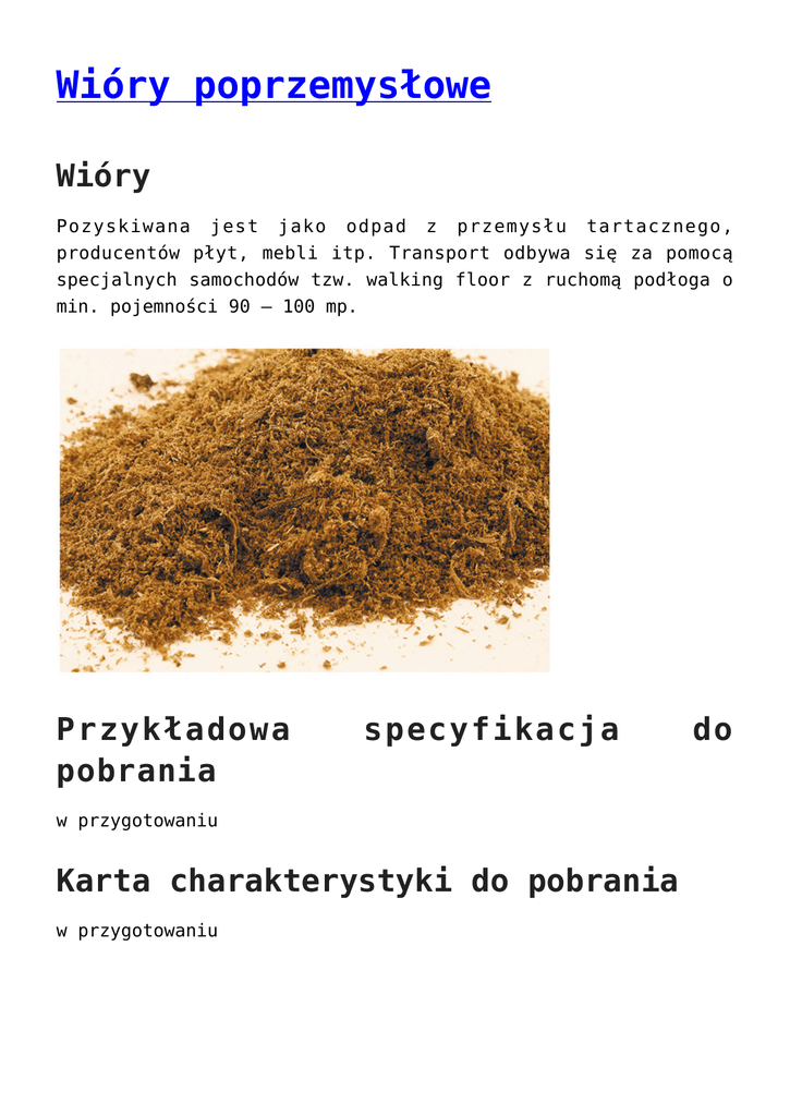 Wióry poprzemysłowe Wióry Pozyskiwana jest jako odpad z przemysłu tartacznego, producentów płyt, mebli itp. Transport odbywa się za pomocą specjalnych samochodów tzw. walking floor z ruchomą podłoga o min. pojemności 90 – 100 mp. Przykładowa pobrania specyfikacja w przygotowaniu Karta charakterystyki do pobrania w przygotowaniu do