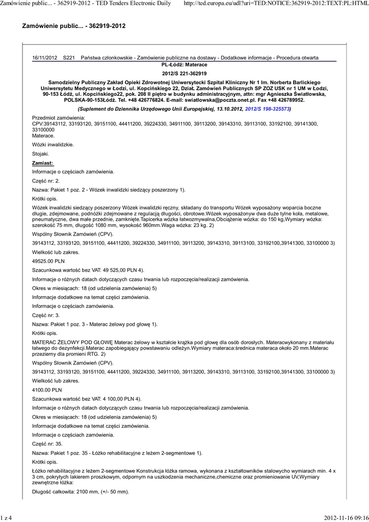 Zamówienie public... - 362919-2012 - TED Tenders Electronic Daily 1z4 http://ted.europa.eu/udl?uri=TED:NOTICE:362919-2012:TEXT:PL:HTML Zamówienie public... - 362919-2012 16/11/2012 S221 Państwa członkowskie - Zamówienie publiczne na dostawy - Dodatkowe informacje - Procedura otwarta PL-Łódź: Materace 2012/S 221-362919 Samodzielny Publiczny Zakład Opieki Zdrowotnej Uniwersytecki Szpital Kliniczny Nr 1 Im. Norberta Barlickiego Uniwersytetu Medycznego w Łodzi, ul. Kopcińskiego 22, DziaŁ Zamówień Publicznych SP ZOZ USK nr 1 UM w Łodzi, 90-153 Łódź, ul. Kopcińskiego22, pok. 208 II piętro w budynku administracyjnym, attn: mgr Agnieszka Światłowska, POLSKA-90-153Łódź. Tel. +48 426776824. E-mail: [email protected]. Fax +48 426789952. (Suplement do Dziennika Urzędowego Unii Europejskiej, 13.10.2012, 2012/S 198-325573) Przedmiot zamówienia: CPV:39143112, 33193120, 39151100, 44411200, 39224330, 34911100, 39113200, 39143310, 39113100, 33192100, 39141300, 33100000 Materace. Wózki inwalidzkie. Stojaki. Zamiast: Informacje o częściach zamówienia. Część nr: 2. Nazwa: Pakiet 1 poz. 2 - Wózek inwalidzki siedzący poszerzony 1). Krótki opis. Wózek inwalidzki siedzący poszerzony Wózek inwalidzki ręczny, składany do transportu Wózek wyposażony woparcia boczne długie, zdejmowane, podnóżki zdejmowane z regulacją długości, obrotowe.Wózek wyposażonyw dwa duże tylne koła, metalowe, pneumatyczne, dwa małe przednie, zamknięte.Tapicerka wózka łatwozmywalna,Obciążenie wózka: do 150 kg,Wymiary wózka: szerokość 75 mm, długość 1080 mm, wysokość 960mm.Waga wózka: 23 kg. 2) Wspólny Słownik Zamówień (CPV). 39143112, 33193120, 39151100, 44411200, 39224330, 34911100, 39113200, 39143310, 39113100, 33192100,39141300, 33100000 3) Wielkość lub zakres. 49525.00 PLN Szacunkowa wartość bez VAT: 49 525,00 PLN 4). Informacje o różnych datach dotyczących czasu trwania lub rozpoczęcia/realizacji zamówienia. Okres w miesiącach: 18 (od udzielenia zamówienia) 5) Informacje dodatkowe na temat części zamówienia. Informacje o częściach zamówienia. Część nr: 3. Nazwa: Pakiet 1 poz. 3 - Materac żelowy pod głowę 1). Krótki opis. MATERAC ŻELOWY POD GŁOWĘ Materac żelowy w kształcie krążka pod głowę dla osób dorosłych. Materacwykonany z materiału łatwego do dezynfekcji.Materac zapobiegający powstawaniu odleżyn.Wymiary materaca:średnica materaca około 20 mm.Materac przezierny dla promieni RTG. 2) Wspólny Słownik Zamówień (CPV). 39143112, 33193120, 39151100, 44411200, 39224330, 34911100, 39113200, 39143310, 39113100, 33192100,39141300, 33100000 3) Wielkość lub zakres. 4100.00 PLN Szacunkowa wartość bez VAT: 4 100,00 PLN 4). Informacje o różnych datach dotyczących czasu trwania lub rozpoczęcia/realizacji zamówienia. Okres w miesiącach: 18 (od udzielenia zamówienia) 5) Informacje dodatkowe na temat części zamówienia. Informacje o częściach zamówienia. Część nr: 35. Nazwa: Pakiet 1 poz. 35 - Łóżko rehabilitacyjne z leżem 2-segmentowe 1). Krótki opis. Łóżko rehabilitacyjne z leżem 2-segmentowe Konstrukcja łóżka ramowa, wykonana z kształtowników stalowycho wymiarach min. 4 x 3 cm, pokrytych lakierem proszkowym, odpornym na uszkodzenia mechaniczne,chemiczne oraz promieniowanie UV,Wymiary zewnętrzne łóżka: Długość całkowita: 2100 mm, (+/- 50 mm). 2012-11-16 09:16 Zamówienie public... - 362919-2012 - TED Tenders Electronic Daily 2z4 http://ted.europa.eu/udl?uri=TED:NOTICE:362919-2012:TEXT:PL:HTML Szerokość całkowita: 980 mm, (+/- 50 mm) wraz z zamontowanymi barierkami. Wymiary leża 2000mm x 900mm,W narożnikach leża 4 krążki odbojowe, chroniące ramę leża, barierki i ścianyprzed uderzeniami oraz otarciami. Na całej długości ramy leża listwy odbojowe. Szczyty łóżka chromowane,łatwo odejmowane, wypełnione wysokiej jakości płytą HPL o grybości min.10mm, odporną na działaniewysokiej temperatury, uszkodzenia mechaniczne, chemiczne oraz promieniowanie UV. Wypełnienie szczytówwyjmowane bez użycia narzędzi,Leże łóżka 2 segmentowe w tym oparcie pleców unoszone,Segmenty leżawypełnione odejmowaną siatką pokrytą lakierem proszkowym o wymiarach oczek max. 5x5cm, wykonanez pręta stalowego o grubości min 5mm, W narożnikach leża tuleje do mocowania wieszaka kroplówki orazwysięgnika z uchwytem do ręki, wysokość leża od podłoża: 550 mm, (+/- 30 mm), Regulacja kąta oparciapleców, realizowana bezstopniowo, za pomocą sprężyny gazowej w zakresie: 0 – 75st (+/- 5st),Regulacjasegmentu oparcia pleców wykonywana za pomocą dźwigni umieszczonej pod ramą leża, w miejscu łatwegodostępu dla leżącego pacjenta, czytelnie oznaczona,Podstawa łóżka wzmocniona poprzeczkami łączącyminogi; jezdna, wyposażona w 4 koła o średnicy min. 125 mm z czego min. 2 mają posiadać blokadę jazdy iobrotu, rdzeń koła osłonięty metalową osłoną. Wzmocniona podstawa leża, obciążenie maksymalne łóżka min200kg. potwierdzone przez niezależny instytut badawczy. Łóżko wyposażone w półkę na pościel wysuwaną zapomocą mechanizmu rolkowego, nie wystająca poza obrys ramy leża. Możliwość montażu barierek bocznych,ramy wyciągowej. Rama leża wyposażona w uchwyty zabezpieczające materac przed przesuwaniem, * Barierkijednoczęściowe, składana, pokryta powłoką lakierniczą spełniająca wymagania normy EN 60-601-2-52:2010, *Uchwyt uniwersalny do łóżka rehabilitacyjnego U-13 * tworzywowe uchwyty na wyposażenie dodatkowe. 2) Wspólny Słownik Zamówień (CPV). 39143112, 33193120, 39151100, 44411200, 39224330, 34911100, 39113200, 39143310, 39113100, 33192100,39141300, 33100000 3) Wielkość lub zakres. 94750.00 PLN Szacunkowa wartość bez VAT: 94 750,00 PLN 4). Informacje o różnych datach dotyczących czasu trwania lub rozpoczęcia/realizacji zamówienia. Okres w miesiącach: 18 (od udzielenia zamówienia) 5) Informacje dodatkowe na temat części zamó