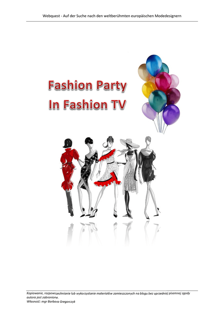 Webquest - Auf der Suche nach den weltberühmten europäischen Modedesignern Kopiowanie, rozpowszechnianie lub wykorzystanie materiałów zamieszczonych na blogu bez uprzedniej pisemnej zgody autora jest zabronione. Własność: mgr Barbara Gregorczyk Webquest - Auf der Suche nach den weltberühmten europäischen Modedesignern Einleitung: Du bist eine Moderatorin in Fashion-TV. Nächste Woche wird in deiner Sendung London Fashion Week “live” übertragen. Deine Aufgabe ist, die Informationen über die bekanntesten Modedesigner aus Europa zu sammeln und Ihre Kollektionen Frühling/Sommer an spezielle Anlässe: city, casual, party zu präsentieren. Kopiowanie, rozpowszechnianie lub wykorzystanie materiałów zamieszczonych na blogu bez uprzedniej pisemnej zgody autora jest zabronione. Własność: mgr Barbara Gregorczyk Webquest - Auf der Suche nach den weltberühmten europäischen Modedesignern Aufgabenstellung: Bereite eine Präsentation vor, die die weltberühmten Modedesigner aus Europa mit ihren Kollektionen Frühling/Sommer darstellt. Finde Informationen über die heutigen Mode-Trends. Merke, wie sich die Stile unterscheiden, je nach den Anlässen: City – feminin und stilvoller für Job und Stadtbummel, Casual – weiblich und unkompliziert für Freizeit und Wochenende, Party – chic und verführerisch für Party und Events. Der Endeffekt deiner Arbeit soll eine mündliche Präsentation mithilfe des Power Point-Projekts im Plenum sein. Deine Kollegen und Kolleginnen finden bestimmt etwas Interessantes für sich für Frühling und/oder Sommer. Kopiowanie, rozpowszechnianie lub wykorzystanie materiałów zamieszczonych na blogu bez uprzedniej pisemnej zgody autora jest zabronione. Własność: mgr Barbara Gregorczyk Webquest - Auf der Suche nach den weltberühmten europäischen Modedesignern Schritte: 1. Du kannst das Projekt selbst nicht schaffen. Wähle also einige Kollegen zur Mitarbeit. 2. Jetzt teile die Aufgaben zwischen den Kollegen. 3. Eine Person ist Modedesigner-Spezialist (-in) und sucht die Informationen über die Projektanten. 4. Die zweite Person kreiert den City-Stil. Sie sucht Informationen und nützliche Bilder zu diesem Trend. 5. Dritte Person, so wie die zweite, versucht den Casual-Stil zu schaffen. 6. Vierte Person ist mit Party-Stil beschäftigt. 7. Die nächste Person ist für die Ausführung des Projekts in Power Point verantwortlich. 8. Beginne die Suche nach bestimmten Informationen und Materialien. Sortiere die Informationen und Bilder ganz genau. Folgende Internetseiten können behilflich sein: www.vogue.co.uk www.stylefinder.com www.chanel.com www.versace.com www.deu.dolcegabbana.it Die angegebenen Webseiten sollen natürlich mit Gebrauch der deutschen Sprache durchgeschaut werden. 9. Sammle den in der Präsentation gebrauchten Wortschatz. Die Mode-Trends sollen ausführlich dargeboten und die Kleider ganz genau beschrieben werden. Benutze viele Adjektive! 10. Bilde drei Dias pro einen Stil. Vergiss vom Accessoire nicht, wie: Handtaschen, Hute, Korallenketten, Ringe, Armbänder, Sonnenbrille, usw. 11. Wenn di mit deinen Aufgaben fertig bist, präsentiere die Modetrends vor der Klasse. Viel Spaß und Glück beim Kreieren der neuen Modetrends! Kopiowanie, rozpowszechnianie lub wykorzystanie materiałów zamieszczonych na blogu bez uprzedniej pisemnej zgody autora jest zabronione. Własność: mgr Barbara Gregorczyk Webquest - Auf der Suche nach den weltberühmten europäischen Modedesignern Rückblick: 1. Kannst du diese Gesichte erkennen? 2. Weißt du, welche Trends im Frühling/Sommer herrschen? 3. Kannst du die Stile erkennen und sich adäquat zum Anlass anziehen? 4. Kannst du die Accessoire, wie: Schmuck, Hut, Sonnenbrille, Handtasche überlegt gebrauchen und nicht alles auf einmal tragen? Wenn du viermal JA beantwortet hast, bedeutet das, dass du diese Aufgabe ausgezeichnet gelöst, dabei den neuen Wortschatz gelernt und über die Mode-Trends sehr viel erfahren hast. Viel Spaß bei weiterem Kreieren eigener Fashiontrends! Dank: Es wurden hier die Quellen aufgelistet, die bei der Bildung dieses Webquests behilflich waren. Die meisten Bilder wurden durch die Suchmaschine www.google.com herausgefunden. Die Basis (Vorlage) für dieses Webquest war Webquest „An Invitation to the London Fashion Week“, das auf der Homepage www.babylonia-ti.ch zu finden ist und allen zur Verfügung steht. Kopiowanie, rozpowszechnianie lub wykorzystanie materiałów zamieszczonych na blogu bez uprzedniej pisemnej zgody autora jest zabronione. Własność: mgr Barbara Gregorczyk