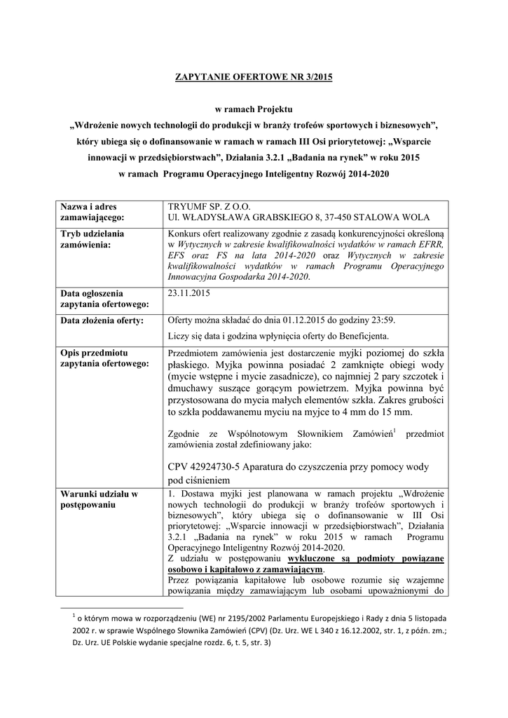 ZAPYTANIE OFERTOWE NR 3/2015 w ramach Projektu „Wdrożenie nowych technologii do produkcji w branży trofeów sportowych i biznesowych”, który ubiega się o dofinansowanie w ramach w ramach III Osi priorytetowej: „Wsparcie innowacji w przedsiębiorstwach”, Działania 3.2.1 „Badania na rynek” w roku 2015 w ramach Programu Operacyjnego Inteligentny Rozwój 2014-2020 Nazwa i adres zamawiającego: TRYUMF SP. Z O.O. Ul. WŁADYSŁAWA GRABSKIEGO 8, 37-450 STALOWA WOLA Tryb udzielania zamówienia: Konkurs ofert realizowany zgodnie z zasadą konkurencyjności określoną w Wytycznych w zakresie kwalifikowalności wydatków w ramach EFRR, EFS oraz FS na lata 2014-2020 oraz Wytycznych w zakresie kwalifikowalności wydatków w ramach Programu Operacyjnego Innowacyjna Gospodarka 2014-2020. Data ogłoszenia zapytania ofertowego: 23.11.2015 Data złożenia oferty: Oferty można składać do dnia 01.12.2015 do godziny 23:59. Liczy się data i godzina wpłynięcia oferty do Beneficjenta. Opis przedmiotu zapytania ofertowego: Przedmiotem zamówienia jest dostarczenie myjki poziomej do szkła płaskiego. Myjka powinna posiadać 2 zamknięte obiegi wody (mycie wstępne i mycie zasadnicze), co najmniej 2 pary szczotek i dmuchawy suszące gorącym powietrzem. Myjka powinna być przystosowana do mycia małych elementów szkła. Zakres grubości to szkła poddawanemu myciu na myjce to 4 mm do 15 mm. Zgodnie ze Wspólnotowym Słownikiem zamówienia został zdefiniowany jako: Zamówień1 przedmiot CPV 42924730-5 Aparatura do czyszczenia przy pomocy wody pod ciśnieniem Warunki udziału w postępowaniu 1 1. Dostawa myjki jest planowana w ramach projektu „Wdrożenie nowych technologii do produkcji w branży trofeów sportowych i biznesowych”, który ubiega się o dofinansowanie w III Osi priorytetowej: „Wsparcie innowacji w przedsiębiorstwach”, Działania 3.2.1 „Badania na rynek” w roku 2015 w ramach Programu Operacyjnego Inteligentny Rozwój 2014-2020. Z udziału w postępowaniu wykluczone są podmioty powiązane osobowo i kapitałowo z zamawiającym. Przez powiązania kapitałowe lub osobowe rozumie się wzajemne powiązania między zamawiającym lub osobami upoważnionymi do o którym mowa w rozporządzeniu (WE) nr 2195/2002 Parlamentu Europejskiego i Rady z dnia 5 listopada 2002 r. w sprawie Wspólnego Słownika Zamówień (CPV) (Dz. Urz. WE L 340 z 16.12.2002, str. 1, z późn. zm.; Dz. Urz. UE Polskie wydanie specjalne rozdz. 6, t. 5, str. 3) zaciągania zobowiązań w mieniu zamawiającego lub osobami wykonującymi w imieniu zamawiającego czynności związane z przygotowaniem i przeprowadzaniem procedury wyboru wykonawcy, a wykonawcą, polegające w szczególności na: uczestniczeniu w spółce, jako wspólnik spółki cywilnej lub spółki osobowej, posiadaniu co najmniej 10 % udziałów lub akcji, pełnieniu funkcji członka organu nadzorczego lub zarządzającego, prokurenta, pełnomocnika, pozostawaniu w związku małżeńskim, w stosunku pokrewieństwa lub powinowactwa w linii prostej, pokrewieństwa drugiego stopnia lub powinowactwa drugiego stopnia w linii bocznej lub w stosunku przysposobienia, opieki lub kurateli. 3. Wymagane doświadczenie Oferenta: Oferent powinien posiadać doświadczenie w produkcji maszyn do mycia szkła. 4. Oferent zobowiązany jest do udokumentowania swojego doświadczenia w obszarze stanowiącym przedmiot zamówienia poprzez wskazanie w treści oferty informacji odnoszących się do tej kwestii. 5. Oferent powinien zagwarantować sposób realizacji dostawy maszyny korzystny z punktu widzenia ochrony środowiska poprzez zapewnienie minimalizacji zużycia materiałów, surowców, energii itp. niezbędnych do realizacji dostawy maszyny. 6. Warunkiem udziału w postępowaniu jest zgoda Oferenta na możliwość przeprowadzenia udokumentowanych testów seryjnego mycia szkła na oferowanej maszynie w ciągu miesiąca od rozstrzygnięcia przetargu. Wynik pozytywny będzie równoznaczny z podpisaniem umowy z oferentem – przy uzyskaniu przez niego największej liczby punktów w konkursie. Wynik negatywny testów spowoduje odrzucenie oferty – mimo uzyskania najwyższej liczby punktów w konkursie. Maksymalny termin realizacji przedmiotu oferty: 30.06.2017 r. Kryteria wyboru oferty Wybór najkorzystniejszej oferty nastąpi w oparciu o następujące kryteria: 1. cena – (40%) 2. termin płatności – (30%) 3. najmniejsze pole kwadratowe szkła mytego na myjce – (30%) 1. Liczba punktów w kryterium „cena” będzie przyznawana według poniższego wzoru: An = (C min / C r) x 100 x 40% C min – cena minimalna w zbiorze C r – cena oferty rozpatrywanej 2. Liczba punktów w kryterium „termin płatności” będzie przyznawana według poniższego schematu Bn = (PP r x T r / PP max x Tppmax) x 100 x 30% PPr – procentowy udział płatności do uiszczenia po dostarczeniu maszyny - w ofercie rozpatrywanej T r – termin płatności do uiszczenia po dostarczeniu maszyny – w ofercie rozpatrywanej PP max – największy w zbiorze procentowy udział płatności do uiszczenia po dostarczeniu maszyny T ppmax – termin płatności do uiszczenia po dostarczeniu maszyny – w ofercie z PP max 3. Liczba punktów w kryterium „ najmniejsze pole kwadratowe szkła mytego na myjce” będzie przyznawana według poniższego wzoru: Cn = (W min / W r) x 100 x 30% W min – najmniejsze możliwe pole kwadratowe szkła mytego na myjce w zbiorze W r – najmniejsze pole kwadratowe szkła mytego na myjce w ofercie rozpatrywanej W ofercie należy odnieść się do wszystkich kryteriów wyboru oferty. W przypadku, gdy Oferent nie wskaże informacji umożliwiających ocenę jednego lub więcej kryteriów jego oferta może zostać uznana za nieważną lub w ocenie zostanie przyznanych mu 0 pkt. w danym kryterium. Nadesłane oferty oceniane będą przez komisję przetargową, w skład której wchodzić będą pracownicy Zamawiającego. Ocena dokonywana będzie w oparciu o ww. k