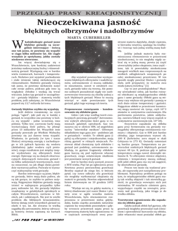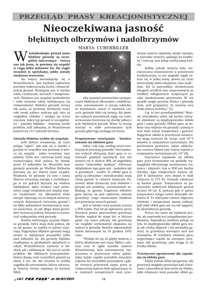 PRZEGLĄD PRASY KREACJONISTYCZNEJ Nieoczekiwana jasność błękitnych olbrzymów i nadolbrzymów MARTA CUBERBILLER W kalejdoskopie gwiazd jasne błękitne gwiazdy są szczególnie interesujące - świecą one tak jasno, że powinny się wypalić w ciągu kilku milionów lat. Ale ciągle wszędzie je spotykamy, jakby zostały niedawno stworzone. Im więcej dowiadujemy się o Wszechświecie, tym bardziej zadziwieni jesteśmy nadzwyczajną liczbą i różnorodnością gwiazd. Występują one w bardzo wielu rozmiarach, barwach i temperaturach. Niełatwo jest wyjaśnić pochodzenie i stałe istnienie takiej niekończącej się różnorodności. Niektóre gwiazdy świecą tak jasno, że powinny niebawem zużyć całe swoje paliwo, podczas gdy inne są względnie chłodne i wydają się trwać wiecznie. Jeden typ gwiazd w szczególności - gwiazdy błękitne - stanowią wielki problem, jeśli założymy, że Wszechświat pojawił się 13,7 miliarda lat temu. Aby wyjaśnić powszechne występowanie błękitnych olbrzymów i nadolbrzymów, astronomowie ci muszą zakładać, że nieustannie, nawet w ostatnich czasach, gwiazdy takie się tworzą. Ale pomimo usilnych poszukiwań nigdy nie zaobserwowano tworzenia się choćby jednej z tych błękitnych gwiazd. Mimo to muszą wierzyć w stałe powstawanie tych gwiazd, gdyż tego wymaga ich teoria. Gwiazdy błękitne szybko się wypalają Jeśli dobrze rozumiemy, na czym polega "ogień", jaki pali się w każdej z gwiazd, to wszystkie one powinny w końcu się wypalić - jedne wcześniej, inne później. Tylko tzw. czerwone karły mają wystarczającą ilość paliwa, by płonąć przez 13 miliardów lat. Wszystkie inne gwiazdy powstałe po Wielkim Wybuchu powinny się już dawno temu wypalić. Wiadomo, że gwiazdy (w tym i nasze Słońce) otrzymują energię z zachodzącego w ich jądrach łączenia się wodoru (dokładniej: jąder wodoru czyli protonów), czego rezultatem jest między innymi wydzielanie się olbrzymich ilości energii. Opierając się na danych obserwacyjnych dotyczących świecenia gwiazd i na kilku założeniach teoretycznych, można oszacować, na jak długo danej gwieździe wystarczy paliwa. Pozwala to wyznaczyć maksymalny wiek gwiazdy. Bardzo interesujące są jasne, błękitne gwiazdy, które mają dużo paliwa, ale są tak gorące, że szybko to paliwo zużywają. Najgorętsze błękitne gwiazdy mogą istnieć w najlepszym przypadku tylko parę milionów lat. Ale gwiazdy błękitne znajdujemy w galaktykach spiralnych w całym Wszechświecie, zarówno w bliskich, jak i oddalonych. Nie jest to wielki problem dla biblijnych kreacjonistów, którzy datują wiek wszystkich gwiazd na około 6 tys. lat. Ale stwarza to wielką zagadkę dla astronomów, którzy odrzucają historię świata zapisaną na kartach Biblii. Proponowane rozwiązanie - kondensowanie się obłoków gazu Gdzie i jak więc według teorii ewolucyjnych powstają gwiazdy? Astronomowie wykryli olbrzymie ilości gazu w ramionach galaktyk spiralnych. Gaz ten nazywa się w skrócie ISM, od angielskiej nazwy "interstellar medium". Głównym składnikiem tego gazu jest - podobnie jak w gwiazdach - wodór. Te obłoki gazu (i pyłu) są olbrzymie i niejednorodne, mają różną gęstość w różnych miejscach. Ponieważ skład chemiczny tych obłoków i gwiazd jest podobny, astronomowie zakładają, że gęstsze fragmenty obłoków gazu kurczą się pod wpływem własnej grawitacji, czego ostatecznym skutkiem jest powstanie nowych gwiazd. Jest to bardzo stary pomysł, jeszcze z XVII wieku. Pięć lat po ogłoszeniu przez Newtona prawa powszechnej grawitacji Bentley napisał do niego list, w którym pytał, czy nowo odkryta siła grawitacji nie mogłaby wytłumaczyć skupiania się materii w gwiazdy. Newton odpowiedział listem datowanym na 10 grudnia 1692 roku: "Wydaje mi się, że gdyby materia, z której zbudowane jest nasze Słońce i planety oraz w ogóle wszelka materia Wszechświata, była równomiernie rozproszona w przestrzeni nieba; gdyby, dalej, każda cząstka posiadała naturalne ciążenie ku wszystkim pozostałym i gdyby wreszcie przestrzeń zajęta przez tę rozproszoną materię była ograniczona: to w częściach zewnętrznych owej prze- „ i d ź P O D P R Ą D ” nr 10/87/2011 14 strzeni materia dążyłaby, dzięki ciążeniu, w kierunku wnętrza, spadając ku środkowi i tworząc tam jedną wielką masę kulistą. Jeśliby jednak materia była rozmieszczona równomiernie w przestrzeni nieskończonej, to nie mogłaby nigdy zebrać się w jedną masę; pewna jej część utworzyłaby jedno skupienie, inna część inne, tak iż powstałaby nieskończona mnogość wielkich mas rozproszonych na wielkich odległościach wzajemnych po całej nieskończonej przestrzeni. W ten sposób mogły powstać Słońce i gwiazdy stałe, jeśli przypuścić, że materia owa miała naturę świetlną." [1] Czy to jest prawdopodobne? Musimy uświadomić sobie, jak bardzo rożnymi obiektami są międzygwiezdne obłoki gazu i same gwiazdy. Obłoki gazu są miliony razy większe niż gwiazdy i panują w nich dużo niższe temperatury i gęstości. Najgęstsze obłoki w przestrzeni kosmicznej mogą zawierać ok. tysiąc, czyli 10^3 atomów w centymetrze sześciennym. Dla porównania powietrze, jakim oddychamy, zawiera biliard razy więcej cząstek w centymetrze sześciennym (ok. 10^18). Oczywiście zapadanie się obłoku gazu przy formowaniu się gwiazdy wymagałoby olbrzymiego zmniejszenia rozmiaru i objętości. Gaz w ISM jest bardzo chłodny, jego temperatura wynosi ok. 100 K (kelwinów; zero stopni w skali Celsjusza to 273 K). Gwiazdy natomiast są bardzo gorące. Temperatura na powierzchni niektórych błękitnych gwiazd wynosi 40 tys. K, podczas gdy w jądrze temperatura osiąga nawet dziesiątki milionów K. Te olbrzymie różnice objętości, ciśnienia i temperatury muszą zniknąć, jeśli jakiś obłok gazu ma się tak zagęścić, by ukształtować gwiazdę. Pr