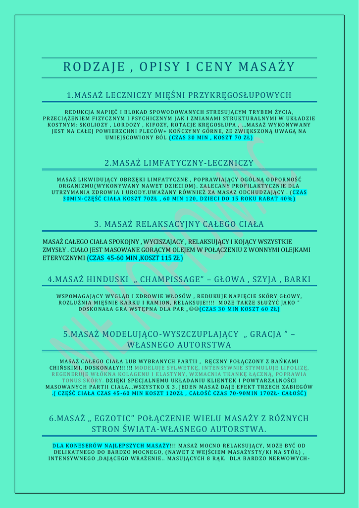 RODZAJE , OPISY I CENY MASAŻY 1.MASAŻ LECZNICZY MIĘŚNI PRZYKRĘGOSŁUPOWYCH R E D U K C J A N A P I Ę Ć I B L O K A D S P O W O D O W A N Y C H S TR E S U J Ą C Y M TR Y B E M Ż Y C I A , P R Z E C I Ą Ż E N I E M F I Z Y C Z N Y M I P S Y C H I C Z N Y M J A K I Z M I A N A M I S TR U K TU R A L N Y M I W U K ŁA D Z I E K O S T N Y M : S K O L I O Z Y , L O R D O Z Y , K I F O Z Y , R O TA C J E K R Ę G O S ŁU P A , … M A S A Ż W Y K O N Y W A N Y J E S T N A C A ŁE J P O W I E R Z C H N I P L E C Ó W + K O Ń C Z Y N Y G Ó R N E , Z E Z W I Ę K S Z O N Ą U W A G Ą N A UMIEJSCOWIONY BÓL (CZAS 30 MIN , KOSZT 70 ZŁ) 2.MASAŻ LIMFATYCZNY-LECZNICZY M A S A Ż L I K W I D U J Ą C Y O B R Z Ę K I L I M F A TY C Z N E , P O P R A W I A J Ą C Y O G Ó L N Ą O D P O R N O Ś Ć ORGANIZMU(WYKONYWANY NAWET DZIECIOM) . ZALECANY PROFILAKTYC ZNIE DLA U TR Z Y M A N I A Z D R O W I A I U R O D Y . U W A Ż A N Y R Ó W N I E Ż Z A M A S A Z O D C HU D Z A J Ą C Y . ( C Z A S 3 0 M I N - C Z Ę Ś Ć C I A ŁA K O S Z T 7 0 Z Ł , 6 0 M I N 1 2 0 , D Z I E C I D O 1 5 R O K U R A B A T 4 0 % ) 3. MASAŻ RELAKSACYJNY CAŁEGO CIAŁA MASAŻ CAŁEGO CIAŁA SPOKOJNY , WYCISZAJACY , RELAKSUJĄCY I KOJĄCY WSZYSTKIE ZMYSŁY . CIAŁO JEST MASOWANE GORĄCYM OLEJEM W POŁĄCZENIU Z WONNYMI OLEJKAMI ETERYCZNYMI (CZAS 45-60 MIN ,KOSZT 115 ZŁ) 4.MASAŻ HINDUSKI „ CHAMPISSAGE” – GŁOWA , SZYJA , BARKI W S P O M A G A J Ą C Y W Y G L Ą D I Z D R O W I E W ŁO S Ó W , R E D U K U J E N A P I Ę C I E S K Ó R Y G ŁO W Y , R O Z L U Ź N I A M I Ę Ś N I E K A R K U I R A M I O N , R E L A K S U J E ! !! ! M O Ż E TA K Ż E S ŁU Ż Y Ć J A K O ” D O S K O N A ŁA G R A W S TĘ P N A D L A P A R „ ( C Z A S 3 0 M I N K O S Z T 6 0 Z Ł) 5.MASAŻ MODELUJĄCO-WYSZCZUPLAJĄCY „ GRACJA ” – WŁASNEGO AUTORSTWA M A S A Ż C A Ł E G O C I A ŁA L U B W Y B R A N Y C H P A R T I I , R Ę C Z N Y P O ŁĄ C Z O N Y Z B A Ń K A M I C H I Ń S K I M I . D O S K O N A ŁY ! ! ! ! ! ! M O D E L U J E S Y L W E T K Ę , I N TE N S Y W N I E S TY M U L U J E L I P O L I Z Ę , R E G E N E R U J E W ŁÓ K N A K O L A G E N U I E L A S TY N Y , W Z M A C N I A T K A N K Ę ŁĄ C Z N Ą , P O P R A W I A TO N U S S K Ó R Y . D Z I Ę K I S P E C J A L N E M U U K ŁA D A N I U K L I E N T E K I P O W TA R Z A L N O Ś C I M A S O W A N Y C H P A R T I I C I A ŁA … W S Z Y S TK O X 3 , J E D E N M A S A Ż D A J E E F E K T T R Z E C H Z A B I E G Ó W . ( C Z Ę Ś Ć C I A ŁA C Z A S 4 5 - 6 0 M I N K O S Z T 1 2 0 Z Ł , C A ŁO Ś Ć C Z A S 7 0 - 9 0 M I N 1 7 0 Z Ł - C A ŁO Ś Ć ) 6.MASAŻ „ EGZOTIC” POŁĄCZENIE WIELU MASAŻY Z RÓŻNYCH STRON ŚWIATA-WŁASNEGO AUTORSTWA. DLA KONESERÓW NAJLEP SZYCH MASAŻY !!! MASAŻ MOCNO RELAKSUJĄCY, MOŻE BYĆ OD D E L I K A TN E G O D O B A R D Z O M O C N E G O , ( N A W E T Z W E J Ś C I E M M A S A Ż Y S TY / K I N A S TÓ Ł ) , I N TE N S Y W N E G O , D A J Ą C E G O W R A Ż E N I E . . M A S U J Ą C Y C H 8 R Ą K . D L A B A R D Z O N E R W O W Y C H - I N TE N S Y W N Y Z C Z Ę S TĄ Z M I A N Ą R U C HU , D L A B A R D Z I E J W Y C I S Z O N Y C H – W O L N I E J S Z Y I U K I E R U N K O W A N Y … W S P A N I A ŁY ! ! ! ! ! ( K L I E N T K I / C I C H C Ą W Y D ŁU Ż E N I A C Z A S U M A S A Ż U Z A D O D A T K O W Ą O P ŁA TĄ ) ( C Z A S 6 0 M I N - 1 3 0 Z Ł, 9 0 M I N K O S Z T 1 8 0 Z Ł , K A Ż D E K O L E J N E 1 0 M I N K O S Z T 1 5 Z Ł) 7.MASAŻ POLINEZYJKI „ MA-URI” WIELKI KROK NA PRZÓD P I Ę K N Y G ŁĘ B O K I , D U C H O W Y M A S A Ż P O M A G A J Ą C Y W D O TA R C I U I O D B L O K O W A N I U W S Z E L K I C H B L O K A D N A 3 P ŁA S Z C Z Y Z N A C H : F I Z Y C Z N E J , P S Y C HI C Z N E J , D U C H O W E J . . W Z A D Z I W I A J Ą C Y S P O S Ó B P O S Z E R Z A J Ą C Y P E R C E P C J Ę ( P O S TR Z E G A N I E ) . P O L E C A N Y K A Ż D E M U , W S Z C Z E G Ó L N O Ś C I O S O B O M P O S Z U K U J Ą C Y M S A TY S F A K C J O N U J Ą C Y C H Ż Y C I O W Y C H Ś C I E Ż E K , P O G Ł Ę B I A J Ą C Y M Ś C I E Ż K Ę D U C HO W Ą , P O S Z U K U J Ą C Y C H O D P O W I E D Z I N A N U R TU J Ą C E P Y TA N I A D O TY C Z Ą C E S W O J E J E G Z Y S T E N C J I , D O Ś W I A D C Z A J Ą C Y C H D ŁU G O TR W A Ł E J I D O K U C Z L I W E J Z M I A N Y W S TR U K TU R Z E D N A D A J Ą C E O B J A W Y T A K I E J A K : C HR O N I C Z N E Z M Ę C Z E N I E , N I E W Y J A Ś N I O N E M E D Y C Z N I E B Ó L E R Ó Ż N E G O P O C HO D Z E N I A , D R A Ż L I W O Ś Ć , S E N N O Ś Ć W C Z A S I E D N I A I TR U D N O Ś Ć W Z A S Y P I A N I U W I E C Z O R E M , W R A Ż E N I E Ż Y C I A I G R A N I A R Ó L W J A K I M Ś F I L M I E I TP . ( C Z A S 6 0 M I N - 1 5 0 Z Ł , 9 0 M I N - 2 0 0 Z Ł) 8.PÓŁZABIEG NA TWARZ -MASAŻ TWARZY , SZYI , DEKOLTU I KOŃCZYN GÓRNYCH „ KLEOPATRA”, LUB 3XM - WŁASNEGO AUTORSTWA P E Ł E N B ŁO G O S TA N ! ! ! ! ! . M A S A Ż A R O M O TE R A P E U T Y C Z N Y Z M A S E C Z K Ą I O L E J K I E M R Ó Ż A N Y M . M E G A - R E L A K S U J Ą C Y , M - O D M ŁA D Z A J Ą C Y , M - L I F TI N G U J Ą C Y ( E F E K TY L I F TI N G U J U Ż P O P I E R W S Z Y M M A S A Ż U ! ! ! ) ( C Z A S 4 0 - 5 0 M I N K O S Z T 1 1 0 Z Ł) P O L E C A M R Ó W N I E Ż M A S A Ż T W A R Z Y I D E K O L TU W W E R S I I Z M I O D E M D Z I A ŁA J Ą C Y J A K O C Z Y S Z C Z A N I E , P E E L I N G , L I F T I N G P O L E C A N Y L E C Z N I C Z O D L A C E R Y TR Ą D Z I K O W E J , ( Z A D O D A TK O W Ą O P ŁA TĄ + 2 0 Z Ł) , L U B S A M MASAŻ TWARZY I SZYI CZAS 30 MIN CENA 50ZŁ 9.MASAŻ REFLEKTORYCZNY STÓP . S T O P A M A 7 2 0 0 Z A K O Ń C Z E Ń N E R W O W Y C H . M A S U J Ą C S TO P Y W O D P O W I E D N I S P O S Ó B U S P R A W N I A M Y S W Ó J C A Ł Y O R G A N I Z M . M O Ż E M Y W P ŁY N Ą Ć N A P O P R A W Ę M E TA B O L I Z M U J A K R Ó W N I E 