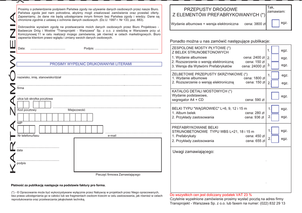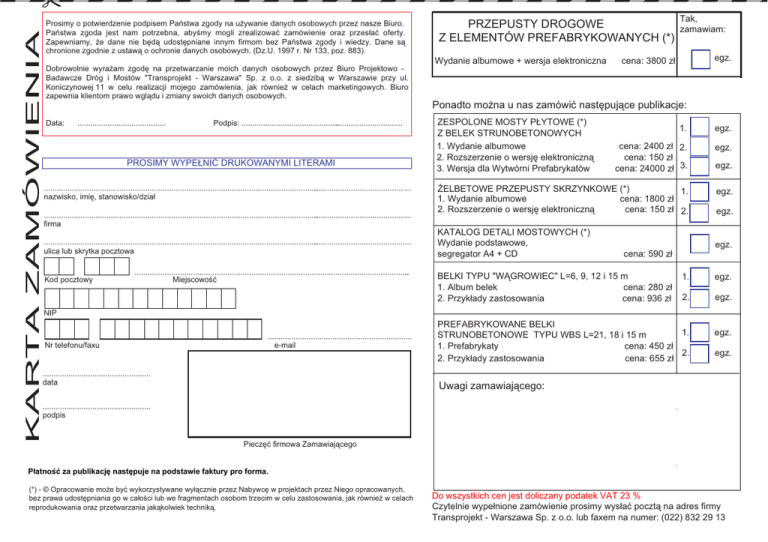 .$57$=$0Ï:,(1,$ 3URVLP\ R SRWZLHUG]HQLH SRGSLVHP 3DĔVWZD ]JRG\ QD XĪ\ZDQLH GDQ\FK RVRERZ\FK przez QDV]H %LXUR 3DĔVWZD ]JRGD MHVW QDP SRWU]HEQD DE\ĞP\ PRJOL ]UHDOL]RZDü ]DPyZLHQLH RUD] SU]HVáDü RIHUW\ =DSHZQLDP\ ĪH GDQH QLH EĊGą XGRVWĊSQLDQH LQQ\P ILUPRP bez 3DĔVWZD ]JRG\ L ZLHG]\ 'DQH Vą FKURQLRQH]JRGQLH]XVWDZąRRFKURQLHGDQ\FKRVRERZ\FK']8U1USR] 'REURZROQLH Z\UDĪDP ]JRGĊ QD SU]HWZDU]DQLH PRLFK GDQ\FK RVRERZ\FK przez %LXUR 3URMHNWRZR %DGDZF]H 'UyJ L 0RVWyZ 7UDQVSURMHNW - :DUV]DZD Sp. z RR z VLHG]LEą Z :DUV]DZLH przy ul. .RQLF]\QRZHM Z FHOX UHDOL]DFML PRMHJR ]DPyZLHQLD MDN UyZQLHĪ Z FHODFK PDUNHWLQJRZ\FK %LXUR ]DSHZQLDNOLHQWRPSUDZRZJOąGXL]PLDQ\VZRLFKGDQ\FKRVRERZ\FK 'DWD3RGSLV............................... 3526,0<:<3(à1,û'58.2:$1<0,/,7(5$0, ............................................................................................................................... ............................................. QD]ZLVNRLPLĊVWDQRZLVNRG]LDá ............................................................................................................................... ............................................. ILUPD ............................................................................................................................... ............................................. XOLFDOXEVNU\WNDSRF]WRZD ............................................................................................................................... .. .RGSRF]WRZ\0LHMVFRZRĞü 7DN 35=(3867<'52*2:( ]DPDZLDP =(/(0(17Ï:35()$%5<.2:$1<&+ :\GDQLHDOEXPRZHZHUVMDHOHNWURQLF]QDFHQD]á egz. 3RQDGWRPRĪQDXQDV]DPyZLüQDVWĊSXMąFHSXEOLNDFMH =(632/21(0267<3à<72:( 1. egz. =%(/(.675812%(7212:<&+ :\GDQLHDOEXPRZHFHQD]á 2. egz. 5R]V]HU]HQLHRZHUVMĊHOHNWURQLF]QąFHQD]á HJ] :HUVMDGOD:\WZyUQL3UHIDEU\NDWyZFHQD]á ĩ(/%(72:(35=(3867<6.5=<1.2:( 1. :\GDQLHDOEXPRZHFHQD]á 5R]V]HU]HQLHRZHUVMĊHOHNWURQLF]QąFHQD]á 2. .$7$/2*'(7$/,02672:<&+ :\GDQLHSRGVWDZRZH VHJUHJDWRU$&'FHQD]á %(/.,7<38:Ą*52:,(&/ LP 1. $OEXPEHOHNFHQD]á 3U]\NáDG\]DVWRVRZDQLDFHQD]á 2. egz. egz. egz. egz. egz. 1,3 ................................................................... 1UWHOHIRQXID[XHPDLO .................................................. GDWD 35()$%5<.2:$1(%(/., 1. 675812%(7212:(7<38:%6/ LP 3UHIDEU\NDW\FHQD]á 2. 3U]\NáDG\]DVWRVRZDQLDFHQD]á egz. egz. 8ZDJL]DPDZLDMąFHJR .................................................. SRGSLV 3LHF]ĊüILUPRZD=DPDZLDMąFHJR Płatność za publikację następuje na podstawie faktury pro forma. 3áDWQRĞü ]D SXEOLNDFMĊQDVWĊSXMH]D]DOLF]HQLHPSRF]WRZ\PSU]\RGELRU]HOXEQDSRGVWDZLHIDNWXU\SURIRUPD 2SUDFRZDQLHPRĪHE\üZ\NRU]\VW\ZDQHZ\áąF]QLHSU]H]1DE\ZFĊZSURMHNWDFKSU]H]1LHJRRSUDFRZDQ\FK EH]SUDZDXGRVWĊSQLDQLDJRZFDáRĞFLOXEZHIUDJPHQWDFKRVRERPWU]HFLPZFHOX]DVWRVRZDQLDMDNUyZQLHĪZFHODFK UHSURGXNRZDQLDRUD]SU]HWZDU]DQLDMDNąNROZLHNWHFKQLNą Do wszystkich cen jest doliczany podatek VAT 23 % 'RZV]\VWNLFKFHQMHVWGROLF]DQ\SRGDWHN9$7% &]\WHOQLHZ\SHáQLRQH]DPyZLHQLHSURVLP\Z\VáDüSRF]WąQDDGUHVILUP\ 7UDQVSURMHNW:DUV]DZD6S]RROXEID[HPQDQXPHU