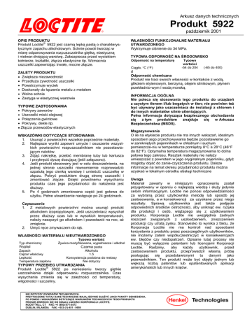 Arkusz danych technicznych Produkt 5922 październik 2001 OPIS PRODUKTU Produkt Loctite® 5922 jest czarną lepką pastą o charakterystycznym zapachu alkoholowym. Schnie powoli tworząc w miarę odparowywania rozpuszczalnika giętką, elastyczną i nietwar-dniejącą warstwę. Zabezpiecza przed wyciekiem kołnierze, kształtki, złącza elastyczne itp. Wzmacnia uszczelki zapewniając trwałe, mocne złącze. WŁASNOŚCI FUNKCJONALNE MATERIAŁU UTWARDZONEGO Wytrzymuje ciśnienie do 34 MPa. ZALETY PRODUKTU • Zwiększa niezawodność • Przedłuża żywotność uszczelki • Powstrzymuje wyciek • Doskonały do łączenia metalu z metalem • Wolno schnie • Zastyga w elastycznej warstwie d Odporność chemiczna Produkt nie traci swoich własności w kontakcie z wodą, glikolem etylenowym, benzyną, olejem silnikowym, płynem przekładnio-wym i wodą morską. TYPOWE ZASTOSOWANIA • Pokrywy zaworów • Uszczelki miski olejowej • Połączenia gwintowe • Pokrywy, dekle itp. • Złącza przewodów elastycznych WSKAZÓWKI DOTYCZĄCE STOSOWANIA 1. Usunąć z powierzchni wszelkie poprzednie materiały. 2. Najlepsze wyniki zapewni umycie i osuszenie wszystkich powierzchni rozpuszczalnikiem nie pozostawiającym nalotów. 3. Zdjąć nakrętkę, przebić membranę tuby lub kartusza i przykręcić dyszę dozującą (jeśli załączono). 4. Jeśli produkt stosowany jest w celu doszczelnienia, na jednej stronie uszczelki równomiernie rozprowadzić szpatułą jego cienką warstwę i umieścić uszczelkę w złączu. Pokryć produktem drugą stronę uszczelki i zmontować złącze. Dzięki powolnemu wysychaniu produktu czas jego przydatności do nałożenia jest dłuższy. 5. Po 4 godzinach zmontowana część jest gotowa do użytku. Pełne utwardzenie następuje po 24 godzinach. Czyszczenie 1. Z metalowych powierzchni można usunąć produkt alkoholem izopropylowym. Jeśli uszczelniacz wysychał przez dłuższy czas lub w wysokich temperaturach, należy nasączyć go alkoholem i pozostawić na noc, aż zmięknie. 2. Umyć ręce zmywaczem do rąk. WŁASNOŚCI MATERIAŁU NIEUTWARDZONEGO Typ chemiczny Wygląd Zapach Ciężar właściwy Lepkość Temperatura zapłonu Typowa wartość Żywica modyfikowana, wypełniacze i alkohol Czarna pasta Alkoholu 1.5 Konsystencja podobna do melasy Nie dotyczy TYPOWY PRZEBIEG UTWARDZANIA Produkt Loctite® 5922 po naniesieniu tworzy giętkie uszczelnienie dzięki odparowaniu rozpuszczalnika. Czas wysychania zmienia się w zależności od temperatury, wilgotności i szczeliny. TYPOWA ODPORNOŚĆ NA ŚRODOWISKO Odporność na temperaturę Ciągła, °C (°F) Typowe wartości -54 do 204 (-65 do 400) INFORMACJA OGÓLNA Nie poleca się stosowania tego produktu do urządzeń z czystym tlenem i/lub bogatych w tlen; nie powinien też być używany jako uszczelniacz do instalacji z chlorem i do innych materiałów silnie utleniających. Pełna informacja dotycząca bezpiecznego obchodzenia się z tym produktem znajduje się w Arkuszu Bezpieczeństwa (MSDS). Magazynowanie O ile na etykiecie produktu nie ma innych wskazań, idealnym sposobem jego przechowywania będzie pozostawienie go w zamkniętych pojemnikach w chłodnym i suchym pomieszcze-niu w temperaturze pomiędzy 8°C a 28°C (46°F do 82°F). Optymalna temperatura magazynowania to dolna połowa tego zakresu. Resztek materiału nie należy umieszczać z powrotem w jego oryginalnym pojemniku, gdyż mogłoby dojść do zanie-czyszczenia produktu. Dalsze informacje na temat okresu przydatności produktu można uzyskać w lokalnym ośrodku obsługi techniczne Uwaga Materiał zawarty w niniejszym opracowaniu został przygotowany w oparciu o najlepszą wiedzę i służy jedynie celom informacyjnym. Loctite nie ponosi odpowiedzialności za wybraną przez użytkownika metodę lub sposób jej zastosowania, a w konsekwencji za uzyskane przez niego rezultaty. Sprawą użytkownika jest także podjęcie odpowiednich środków ostrożności, aby uniknąć ew. ryzyka dla produkcji i osób, wiążącego się z użytkowaniem produktu. Korporacja Loctite nie uwzględnia żadnych roszczeń związanych z uszkodzeniem, zniszczeniem produkcji czy utratą zysku. Stanowisko to wynika z faktu, że Korporacja Loctite nie ma kontroli nad sposobami korzystania z produktu przez poszczególnych użytkowników, nie możemy zatem współuczestniczyć w konsekwencjach ew. błędów czy niedopatrzeń. Opisane tutaj procesy nie muszą być wyłącznie patentami lub licencjami Korporacji Loctite. Radzimy, aby każdy użytkownik, przed zastosowaniem produktu, przeprowadził własną próbę posługując się przedstawionymi tu danymi jako przewodnikiem. Ten produkt może być objęty jednym lub większą liczbą patentów lub opatentowanych aplikacji amerykańskich lub innych krajów. NIE DOTYCZY WYMOGÓW TECHNICZNYCH. PRZYTOCZONE TUTAJ DANE TECHNICZNE MAJĄ JEDYNIE SŁUŻYĆ JAKO PUNKTY ODNIESIENIA. PO POMOC I WSKAZÓWKI DOTYCZĄCE WARUNKÓW TECHNICZNYCH TEGO PRODUKTU PROSZĘ ZWRÓCIĆ SIĘ DO DZIAŁU JAKOŚCI KORPORACJI LOCTITE. ROCKY HILL, CT FAX: +1 (860)-571-5473 DUBLIN, IRLANDIA FAX: +353-(1)-451 - 9959