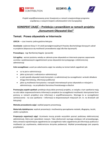 Projekt współfinansowany przez Szwajcarię w ramach szwajcarskiego programu współpracy z nowymi krajami członkowskimi Unii Europejskiej KONSPEKT ZAJĘĆ – Prelekcja z prawnikiem w ramach projektu „Konsument-Obywatel-Sieć” Temat: Prawa obywatela w Internecie LEKCJA – czas trwania: jedna godzina lekcyjna Uczniowie: wybrane klasy II i III szkół ponadgimnazjalnych Powiatu Bocheńskiego biorących udział w projekcie (dopuszcza się możliwość prowadzenia zajęć dla klas łączonych) Prowadzący: mgr Bartłomiej Gogola (prawnik) Cel ogólny: wzrost poziomu wiedzy w zakresie praw obywatela w Internecie poprzez zapoznanie uczniów z podstawowymi zagadnieniami praw obywatela korzystającego z elektronicznej administracji Cele szczegółowe: uczeń po zakończeniu zajęć ma wiedzę na temat takich zagadnień jak: co to jest e-administracja jakie są korzyści z wdrażania e-administracji w jaki sposób obywatel może korzystać z e-administracji (w szczególności: wnioski składane drogą internetową, informacja publiczna) jakie są możliwości korzystania z narzędzi internetowych przez obywatela w relacjach z administracją - na przykładzie Starostwa Powiatowego w Bochni Promocyjny aspekt spotkań: prelekcje służą także promocji projektu, w związku z tym spotkania mają na celu także rozpowszechnieniu informacji o projekcie (w szczególności możliwości skorzystania form pomocy w ramach projektu) oraz informacji o współfinansowaniu. Wymaga to w szczególności zamieszczenia - na czas spotkania – informacji w eksponowanych miejscach (m. in. na drzwiach sali lekcyjnej) Metoda prowadzenia zajęć: wykład poparty prezentacją. Materiały dydaktyczne: wydruk prezentacji z możliwością sporządzania notatek, długopisy, teczki, ulotki o projekcie. Propozycja organizacji zajęć: Uczniowie muszą przede wszystkim poznać podstawy elektronicznej administracji, która jest zjawiskiem nowym. Taka okoliczność wymaga wiodącej roli prowadzącego, który omawia najistotniejsze zagadnienia (w szczególności takie zagadnienia jak informacja publiczna i możliwości jej uzyskiwania, elektroniczna skrzynka podawcza). Wykład prowadzącego jest poparty przykładami. Projekt współfinansowany przez Szwajcarię w ramach szwajcarskiego programu współpracy z nowymi krajami członkowskimi Unii Europejskiej Przebieg lekcji: 1. Wykład jest poprzedzony informacją o celu spotkania z prawnikiem, projekcie, w ramach którego odbywa się spotkanie, adresatach, współfinansowaniu, otrzymanych materiałach (wcześniej uczniowie otrzymują materiały dydaktyczne), a także możliwości zadawania pytań. W tej części jest też przekazywana informacja o newsletterze, liście obecności oraz liście osób zamawiających otrzymywanie newslettera. 2. Prowadzący rozpoczyna zajęcia od wyjaśnienia definicji elektronicznej administracji 3. Nakreślona zostaje kwestia korzyści związanych z wdrażaniem e-administracji oraz jej perspektywy 4. Omawiana jest kwestia dostępu do informacji publicznej ze szczególnym uwzględnieniem zagadnień internetowych (w szczególności forma wniosku o udostępnienie informacji i jego załatwienie, rola Biuletynu Informacji Publicznej) 5. Omawiana jest kwestia praw obywatela załatwiającego sprawę w urzędzie przy pomocy narzędzi internetowych(w szczególności zagadnienie elektronicznej Platformy Usług Administracji Publicznej i podpisu elektronicznego, możliwości ustalenia stanu sprawy przez Internet, internetowych konsultacji z obywatelami) 6. Przedstawiona zostaje e-administracja na przykładzie Starostwa Powiatowego w Bochni 7. Przedstawione zostają możliwości skorzystania z pomocy w ramach projektu (informacja o stronie internetowej, forum z chatem, newsletterze, broszurach). 8. Uczniowie otrzymują formularze ankiety z prośbą o jej wypełnienie. 9. Następuje zebranie ankiet, listy obecności, listy zamawiających newsletter