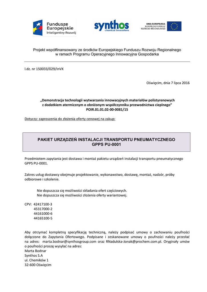 Projekt współfinansowany ze środków Europejskiego Funduszu Rozwoju Regionalnego w ramach Programu Operacyjnego Innowacyjna Gospodarka l.dz. nr 150033/029/InVX Oświęcim, dnia 7 lipca 2016 „Demonstracja technologii wytwarzania innowacyjnych materiałów polistyrenowych z dodatkiem atermicznym o obniżonym współczynniku przewodnictwa cieplnego” POIR.01.01.02-00-0081/15 Dotyczy: zaproszenia do złożenia oferty cenowej na zakup: PAKIET URZĄDZEŃ INSTALACJI TRANSPORTU PNEUMATYCZNEGO GPPS PU-0001 Przedmiotem zapytania jest dostawa i montaż pakietu urządzeń instalacji transportu pneumatycznego GPPS PU-0001. Zakres usług dostawcy obejmuje projektowanie, wykonawstwo, dostawę, montaż, nadzór, próby odbiorowe i szkolenie. Nie dopuszcza się możliwości składania ofert częściowych. Nie dopuszcza się możliwości złożenia oferty wariantowej. CPV: 42417100-3 45317000-2 44161000-6 44165100-5 Aby otrzymać kompletną specyfikację techniczną, należy podpisać umowy o zachowaniu poufności dołączone do Zapytania Ofertowego. Podpisane i zeskanowane umowy o poufności należy przesłać na adres: [email protected] oraz [email protected]. Oryginały umów o poufności proszę wysyłać na adres: Marta Bodnar Synthos S.A ul. Chemików 1 32-600 Oświęcim Projekt współfinansowany ze środków Europejskiego Funduszu Rozwoju Regionalnego w ramach Programu Operacyjnego Innowacyjna Gospodarka W sprawie umowy o poufności proszę o kontakt z p. Martą Bodnar, e-mail: [email protected], tel.: +48 33 847 47 52, kom.: +48 607 808 877 lub z p. Ritą Nadulską – Jonak, e-mail: [email protected], tel.: +48 22 326 03 34, kom.: +48 695 250 725. 1. Strony zaangażowane w postępowanie ofertowe: Zamawiający: Synthos Dwory 7 spółka z ograniczoną odpowiedzialnością spółka jawna ul. Chemików 1 32-600 Oświęcim Podmiot upoważniony do prowadzenia negocjacji handlowych w imieniu Zamawiającego: Prochem S.A. ul. Łopuszańska 95 02-457 Warszawa 2. Tryb udzielania zamówienia: Zamówienie realizowane będzie zgodnie z zasadą konkurencyjności określoną w „Wytycznych w zakresie kwalifikowalności wydatków w ramach Europejskiego Funduszu Rozwoju Regionalnego, Europejskiego Funduszu Społecznego oraz Funduszu Spójności na lata 2014-2020”. 3. Oferta winna zawierać: a) pełną nazwę oferenta, b) adres lub siedzibę oferenta, numer telefonu, NIP oraz aktualny odpis z KRS c) informacje techniczne o oferowanych urządzeniach, d) cenę, która powinna zawierać wszystkie elementy niezbędne do rozruchu oraz do właściwej eksploatacji. W ofercie powinny być ujęte również poniższe składniki: Cena transportu DAP lub DDP Oświęcim (wg incoterms 2010) wraz z rozładunkiem, Cena serwisu pogwarancyjnego, Cena przeglądów gwarancyjnych w rozbiciu na usługę oraz materiał (części nieobjęte gwarancją) wraz z informacją o częstotliwości wymaganych przeglądów, Cena części zamiennych na 2 lata eksploatacji z możliwością przedłużenia, Prace montażowe na budowie, Nadzór, próby odbiorowe i szkolenie. e) przewidywany termin dostawy i montażu (wymagany najpóźniejszy termin dostawy i montażu: I kwartał 2017), f) okres gwarancji i rękojmi (24 miesiące z możliwością przedłużenia licząc od daty podpisania protokołu odbioru końcowego), g) termin ważności oferty (60 dni od daty utworzenia oferty), h) warunki płatności – 30 dni po otrzymaniu faktury przez Zamawiającego, i) raport finansowy firmy z ostatnich dwóch lat, Projekt współfinansowany ze środków Europejskiego Funduszu Rozwoju Regionalnego w ramach Programu Operacyjnego Innowacyjna Gospodarka j) oferta musi być podpisana przez osobę lub osoby uprawnione do występowania w obrocie prawnym w imieniu oferenta. Podpis musi być czytelny lub opisany pieczęciami imiennymi. 4. Osoby uprawnione do kontaktu z oferentami: Kwestie handlowe: p. Rita Nadulska – Jonak: [email protected], tel. +48 22 326 03 34, kom. +48 695 250 725 p. Marta Bodnar, e-mail: [email protected], tel.: +48 33 847 47 52, kom. +48 607 808 877 Kwestie techniczne: Informacja zostanie podana po odesłaniu podpisanych umów o zachowaniu poufności będących Załącznikiem nr 1 do niniejszego Zapytania Ofertowego. 5. Ofertę – należy złożyć w terminie na adres e-mail: 2016-08-19 do godz. 23.59 w formie elektronicznej [email protected] [email protected] oraz w zamkniętej kopercie na adres: Prochem S.A. ul. Łopuszańska 95 02-457 Warszawa Rita Nadulska-Jonak z dopiskiem: „Zapytanie ofertowe nr 150033/029/InVX wraz z dopiskiem „oferta – nie otwierać‘’ Oferty złożone po wskazanym terminie nie będą rozpatrywane. Liczy się data i godzina wpłynięcia oferty do firmy. 6. Z udziału w postępowaniu wykluczone są podmioty powiązane osobowo i kapitałowo z Zamawiającym. Przez powiązania kapitałowe lub osobowe rozumie się wzajemne powiązania między Zamawiającym lub osobami upoważnionymi do zaciągania zobowiązań w imieniu Zamawiającego lub osobami wykonującymi w imieniu Zamawiającego czynności związane z przygotowaniem i przeprowadzaniem procedury wyboru wykonawcy, a Oferentem, polegające w szczególności na: uczestniczeniu w spółce, jako wspólnik spółki cywilnej lub spółki osobowej, posiadaniu co najmniej 10% udziałów lub akcji, Projekt współfinansowany ze środków Europejskiego Funduszu Rozwoju Regionalnego w ramach Programu Operacyjnego Innowacyjna Gospodarka pełnieniu funkcji członka organu nadzorczego lub zarządzającego, prokurenta, pełnomocnika, pozostawaniu w związku małżeńskim, w stosunku pokrewieństwa lub powinowactwa w linii prostej, pokrewieństwa drugiego stopnia lub powinowactwa drugiego stopnia w linii bocznej lub w stosunku przysposobienia, opieki lub kurateli. 7. Po rozpatrzeniu ofert o decyzji Zamawiającego oferenci zostaną powiadomieni pisemnie. 8. Zamawiający zastrzega sobie możliwość zmiany lub odwołania postępowania w dowolnym terminie bez podania pr