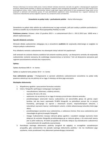 Niniejsza informacja nie stanowi źródła prawa. Autorzy dołożyli należytej staranności, aby była ona zgodna z obowiązującymi regulacjami prawnymi. Należy jednak pamiętać, że dotyczy ona typowych, mogących często występować przypadków i może nie w pełni odnosić się do poszczególnych spraw. Liczba i rodzaj dokumentów, których mogą żądać organy administracji w toku postępowania mogą różnić się do podanych w zależności od konkretnej sprawy. W razie jakichkolwiek wątpliwości należy skontaktować się z organem właściwym do rozpoznania indywidualnej sprawy względnie zapoznać się z przepisami prawa samodzielnie. Zezwolenie na pobyt stały – pochodzenie polskie - Karta informacyjna Zezwolenia na pobyt stały udziela się cudzoziemcowi na jego wniosek, jeśli jest osobą o polskim pochodzeniu i zamierza osiedlić się na terytorium Rzeczypospolitej Polskiej na stałe Podstawa prawna: Ustawa z dnia 12 grudnia 2013 r. o cudzoziemcach (Dz.U. z 30.12.2013 poz. 1650) wraz z aktami wykonawczymi. Sposób składania wniosku: Wniosek składa cudzoziemiec ubiegający się o zezwolenie osobiście do wojewody właściwego ze względu na miejsce pobytu cudzoziemca. Przy składaniu wniosku cudzoziemiec ma obowiązek złożyć odciski linii papilarnych Jeśli wniosek nie zostanie złożony osobiście lub zostanie wysłany pocztą – po doręczeniu wniosku do wojewody cudzoziemiec zostanie wezwany do osobistego stawiennictwa w terminie 7 dni od doręczenia wezwania pod rygorem pozostawienia wniosku bez rozpoznania. Opłaty: Opłata skarbowa 640 zł – nr. konta: Opłata za wydanie karty pobytu 50 zł – nr. konta: Czas załatwienia sprawy – Postępowanie w sprawie udzielenia cudzoziemcowi zezwolenia na pobyt stały powinno zakończyć się nie później niż w ciągu 3 miesięcy od dnia jego wszczęcia. Niezbędne dokumenty: 1. 2. 3. Wypełniony zgodnie z pouczeniem formularz wniosku Cztery fotografie spełniające następujące wymagania nieuszkodzone, kolorowe, o dobrej ostrości; wymiary 35 mm x 45 mm; wykonane nie wcześniej niż w ciągu 6 miesięcy przed dniem złożenia wniosku; przedstawiające wizerunek twarzy cudzoziemca od wierzchołka głowy do górnej części barków, tak aby twarz zajmowała 70-80% fotografii, na jednolitym jasnym tle, w pozycji frontalnej, patrzącego na wprost z otwartymi oczami, nieprzesłoniętymi włosami, z naturalnym wyrazem twarzy i zamkniętymi ustami, a także odwzorowują naturalny kolor jego skóry; przedstawiające wyraźnie oczy cudzoziemca, a zwłaszcza źrenice, linia oczu cudzoziemca jest równoległa do górnej krawędzi fotografii; Uwaga: Cudzoziemiec noszący nakrycie głowy zgodnie z zasadami swojego wyznania może dołączyć do wniosku fotografię przedstawiającą go w nakryciu głowy, o ile wizerunek twarzy jest w pełni widoczny. W takim przypadku do wniosku dołącza się oświadczenie cudzoziemca o przynależności do wspólnoty wyznaniowej. Kserokopia ważnego dokumentu podróży (oryginał do wglądu), w szczególnie uzasadnionym przypadku, gdy cudzoziemiec nie posiada ważnego dokumentu podróży i nie ma możliwości jego uzyskania, może przedstawić inny dokument potwierdzający tożsamość. Niniejsza informacja nie stanowi źródła prawa. Autorzy dołożyli należytej staranności, aby była ona zgodna z obowiązującymi regulacjami prawnymi. Należy jednak pamiętać, że dotyczy ona typowych, mogących często występować przypadków i może nie w pełni odnosić się do poszczególnych spraw. Liczba i rodzaj dokumentów, których mogą żądać organy administracji w toku postępowania mogą różnić się do podanych w zależności od konkretnej sprawy. W razie jakichkolwiek wątpliwości należy skontaktować się z organem właściwym do rozpoznania indywidualnej sprawy względnie zapoznać się z przepisami prawa samodzielnie. Uwaga: Brak, któregokolwiek z ww. dokumentów spowoduje wezwanie cudzoziemca do jego uzupełnienia w terminie 7 dni od doręczenia wezwania pod rygorem pozostawienia wniosku bez rozpoznania. Typowe dokumenty potwierdzające okoliczności wskazane we wniosku: Uwaga: Dołączenie wymienionych niżej dokumentów do wniosku przy jego składaniu może ograniczyć ilość korespondencji urzędowej i skrócić czas załatwienia sprawy. 1. 2. 3. Dokumenty potwierdzające że: a. co najmniej jedno z rodziców lub dziadków albo dwoje pradziadków cudzoziemca było narodowości polskiej lub b. posiadanie w przeszłości obywatelstwa polskiego przez cudzoziemca lub co najmniej jednego z jego rodziców lub dziadków albo obojga pradziadków Dokumenty potwierdzające związek z polskością, w szczególności przez pielęgnowanie polskiej mowy, polskich tradycji i zwyczajów Dokumenty potwierdzające zamiar pozostania w Polsce na stałe Uwaga: W przypadku potrzeby wyjaśnienia lub doprecyzowania posiadanych przez organ dowodów w sprawie w trakcie postępowania cudzoziemiec może być wzywany do dostarczenia innych dokumentów lub do składania zeznań potwierdzających okoliczności, o których mowa we wniosku.