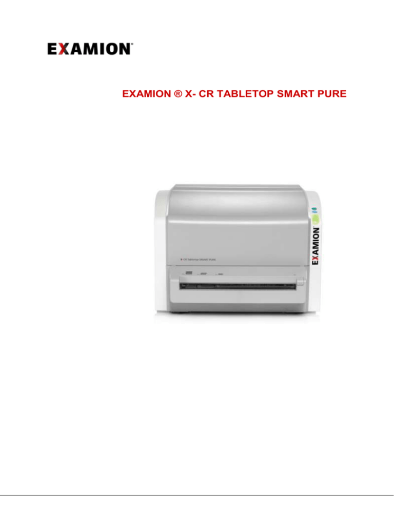 EXAMION ® X- CR TABLETOP SMART PURE Specyfikacja techniczna: Examion® X-CR TABLETOP SMART PURE Typ skanera: Obsługa pojedynczej kasety Wydajność: do 44 kaset / h Obsługiwane rozmiary kaset: - 35 x 43 cm (14” x 17”) Rozdzielczość przestrzenna: 10 pikseli / mm Rozmiar matrycy: 3480 x 4248 Wyświetlacz stanu LED: Informowanie o statusie urządzenia, błędy na monitorze PC Rozdzielczość w skali szarości: Akwizycja: 20 bitów na piksel Wyświetlanie: 16 bitów na piksel Wymiary urządzenia: 580 x 700 x 471 mm ( W x Sz x G ) Waga: 29 kg Konfiguracja systemu: Desktop, Z-Cart (opcjonalnie) Zasilanie: 200-240 V maks. prąd 2A 50/60 Hz Warunki pracy: Zakres temperatury: 15- 40 °C ( -23 – 76°C magazyn) Zakres wilgotność: 15- 75 % RH (bez kondensacji) Warunki przechowywania: Temperatura: 15-30°C (59-86°F) Wilgtność: 15-76 % RH (bez kondensacji) Zgodność z normami: Urządzenie składa się z: CE 0434 EXAMION® CR SMART stacja robocza EXAMION® monitor dotykowy 19” AQS oprogramowanie sterujące skanerem Oprogramowanie steruje systemem CR, pozwala na przeglądanie i optymalizację zdjęć, zawiera oprogramowanie DICOM Worklist, DICOM Send/Store, opcjonalnie: EXAMION® PACS