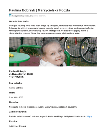 Paulina Bobrzyk | Marzycielska Poczta marzycielskapoczta.pl /paulina-bobrzyk/ Weronika Mazurkiewicz Poznajcie Paulinkę, która na co dzień zmaga się z miopatią, neuropatią oraz obustronnym niedosłuchem. Dziewczynka w 2014 roku przeszła bolesną operację, jednak ta nie przyniosła spodziewanych efektów. Mimo ogromnego bólu, jaki towarzyszy Paulinie każdego dnia, nie straciła ona pogody ducha. Z niecierpliwością czeka na Wasze listy, które na pewno dodadzą jej sił w dalszej walce. Paulina Bobrzyk ul. Budowlanych 43a/29 44-217 Rybnik Imię dziecka: Paulina Bobrzyk Wiek: 8 lat, 31.03.2006 Choroba: Neuropatia ruchowa, miopatia genetycznie uwarunkowana, niedosłuch obustronny Zainteresowania: Paulinka uwielbia rysować, malować, czytać i układać klocki Lego. Lubi pływać i kocha konie. Więcej... Rodzice: Katarzyna, Grzegorz Rodzeństwo: Młodsza siostra Amelka Paulinka urodziła się przez cesarskie cięcie, od urodzenia boryka się z niedosłuchem. Od 9. miesiąca życia nosi aparaty słuchowe. Co więcej, córka cierpi na neuropatię ruchową i miopatię genetyczną. To wyzwanie i walka do końca życia. Wszystko zaczęło się w wieku dwóch lat. Paulinka zaczynała coraz częściej chodzić na paluszkach. Trafialiśmy do różnych szpitali, gdzie podejmowano próbę zdiagnozowania jej choroby. Córka przeszła mnóstwo badań, ale cały czas nie było właściwej diagnozy. Dopiero w 2013 r. okazało się, że to miopatia genetyczna. Paulina dwukrotnie miała wykonaną operację wydłużenia ścięgien Achillesa, niestety bez rezultatu. Codziennie poddajemy ją rehabilitacji, jednak wciąż obserwujemy pogorszenie stanu zdrowia. Paulinka przede wszystkim ma wiele przykurczy. Przed operacją którą miała w 2014 roku chodziła właściwie na samych palcach. Po operacji wydłużenia ścięgien bardzo długo dochodziła do siebie. Nie chciała wstawać, ćwiczyć, płakała z bólu. Ortopeda radził, żeby Paulinka dużo ćwiczyła, chodziła i rozciągała się, ale mimo upływu czasu nadal nie ma efektów operacji. Paulinka ma także przykurcze w łokciach, barkach oraz biodrach. Jest bardzo szczupła, właściwie nie ma tkanki mięśniowej i siły aby iść na dłuższy spacer. Byliśmy z córką na konsultacjach w Niemczech, ponieważ mają tam odmienne metody leczenia. Lekarze z Niemiec nie zalecają kolejnych operacji tylko leczenie ortezami. Na dzień dzisiejszy jedyna nasza nadzieja to właśnie ortezy. Na neuropatię i miopatię nie ma lekarstwa, pozostaje tylko żmudna rehabilitacja. Najgorsze jest to, że Paulina ma także napadowe bóle głowy, które w ostatnim okresie bardzo się nasiliły. Pojawiają się w ciągu dnia o różnych porach dnia i nocy. Prawdopodobnie są to nerwobóle, często występujące w polineuropatiach. Zgłosiłam Paulinkę do Marzycielskiej Poczty po pierwsze dlatego, że Paulinka lubi pisać listy i wysyłać je na święta- w rodzinie tylko wysyłamy kartki, a nie smsy. Wszyscy bardzo się cieszą z tego powodu i nam dziękują. Po drugie nasz mały znajomy sam jest w Marzycielskiej Poczcie i jak pokazałam to Paulince to zaraz zapytała czy też mogłabym dołączyć.