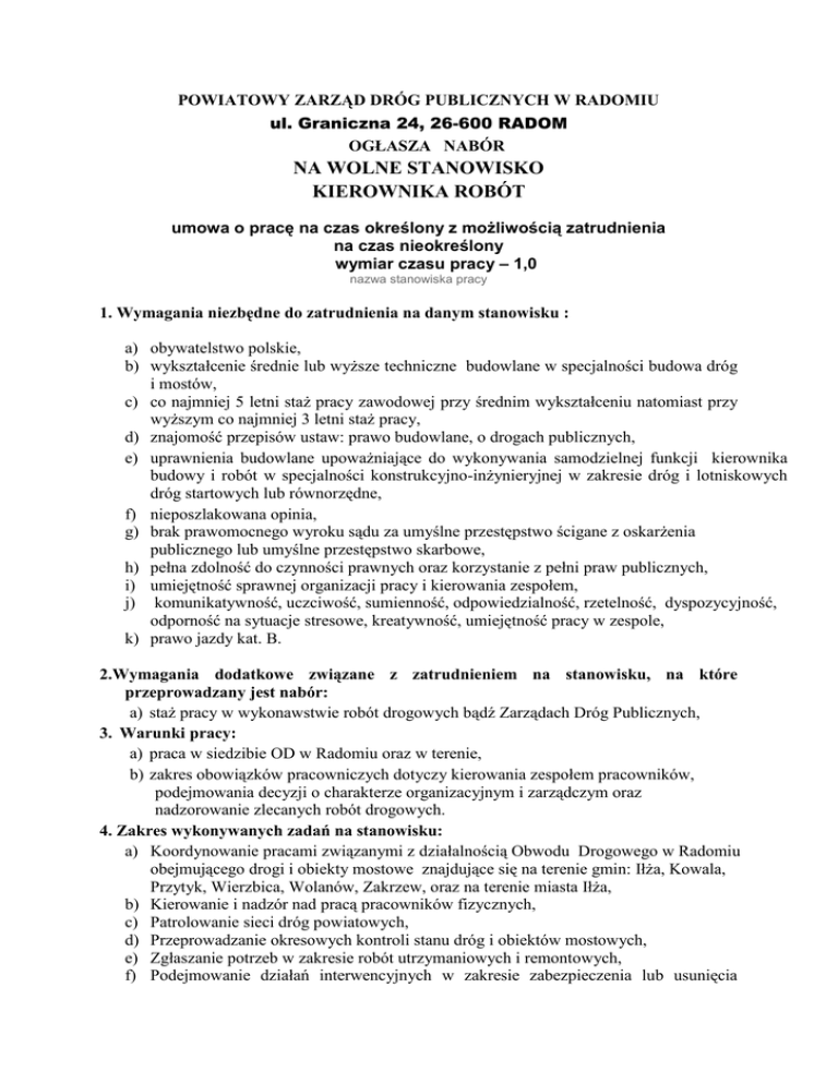 POWIATOWY ZARZĄD DRÓG PUBLICZNYCH W RADOMIU ul. Graniczna 24, 26-600 RADOM OGŁASZA NABÓR NA WOLNE STANOWISKO KIEROWNIKA ROBÓT umowa o pracę na czas określony z możliwością zatrudnienia na czas nieokreślony wymiar czasu pracy – 1,0 nazwa stanowiska pracy 1. Wymagania niezbędne do zatrudnienia na danym stanowisku : a) obywatelstwo polskie, b) wykształcenie średnie lub wyższe techniczne budowlane w specjalności budowa dróg i mostów, c) co najmniej 5 letni staż pracy zawodowej przy średnim wykształceniu natomiast przy wyższym co najmniej 3 letni staż pracy, d) znajomość przepisów ustaw: prawo budowlane, o drogach publicznych, e) uprawnienia budowlane upoważniające do wykonywania samodzielnej funkcji kierownika budowy i robót w specjalności konstrukcyjno-inżynieryjnej w zakresie dróg i lotniskowych dróg startowych lub równorzędne, f) nieposzlakowana opinia, g) brak prawomocnego wyroku sądu za umyślne przestępstwo ścigane z oskarżenia publicznego lub umyślne przestępstwo skarbowe, h) pełna zdolność do czynności prawnych oraz korzystanie z pełni praw publicznych, i) umiejętność sprawnej organizacji pracy i kierowania zespołem, j) komunikatywność, uczciwość, sumienność, odpowiedzialność, rzetelność, dyspozycyjność, odporność na sytuacje stresowe, kreatywność, umiejętność pracy w zespole, k) prawo jazdy kat. B. 2.Wymagania dodatkowe związane z zatrudnieniem na stanowisku, na które przeprowadzany jest nabór: a) staż pracy w wykonawstwie robót drogowych bądź Zarządach Dróg Publicznych, 3. Warunki pracy: a) praca w siedzibie OD w Radomiu oraz w terenie, b) zakres obowiązków pracowniczych dotyczy kierowania zespołem pracowników, podejmowania decyzji o charakterze organizacyjnym i zarządczym oraz nadzorowanie zlecanych robót drogowych. 4. Zakres wykonywanych zadań na stanowisku: a) Koordynowanie pracami związanymi z działalnością Obwodu Drogowego w Radomiu obejmującego drogi i obiekty mostowe znajdujące się na terenie gmin: Iłża, Kowala, Przytyk, Wierzbica, Wolanów, Zakrzew, oraz na terenie miasta Iłża, b) Kierowanie i nadzór nad pracą pracowników fizycznych, c) Patrolowanie sieci dróg powiatowych, d) Przeprowadzanie okresowych kontroli stanu dróg i obiektów mostowych, e) Zgłaszanie potrzeb w zakresie robót utrzymaniowych i remontowych, f) Podejmowanie działań interwencyjnych w zakresie zabezpieczenia lub usunięcia awarii powstałych w pasach dróg powiatowych, g) Kontrolowanie wykonania prac interwencyjnych związanych z likwidacją zagrożeń bezpieczeństwa ruchu, h) Koordynacja i kontrola prawidłowego prowadzenia robót realizowanych na podstawie zezwoleń na zajęcie pasa drogowego, i) Przestrzeganie przepisów porządkowych na drogach, j) Kontrola odpowiedniego oznakowania dróg i mostów, oraz robót drogowych i obcych, k) Kontrola jakości robót z zakresu utrzymania dróg i mostów, l) Prowadzenie okresowych pomiarów ruchu drogowego, m) Kontrola terminowości wykonywanych robót w pasach dróg powiatowych, n) Pełnienie funkcji nadzoru inwestorskiego w czasie realizacji zadań na drogach powiatowych, 6. Wymagane dokumenty: a) Życiorys (c.v.), b) kwestionariusz osobowy dla osoby ubiegającej się o zatrudnienie - według wzoru dostępnego na stronie http://pzd-radom.finn.pl lub pobranego w siedzibie Powiatowego Zarządu Dróg Publicznych, c) list motywacyjny, d) kserokopie dokumentów potwierdzających wykształcenie, e) kserokopia nowego dowodu osobistego, f) własnoręcznie podpisane oświadczenie kandydata o pełnej zdolności do czynności prawnych i korzystaniu z pełni praw publicznych, g) własnoręcznie podpisane oświadczenie kandydata o wyrażeniu zgody na przetwarzanie danych osobowych do celów rekrutacji, h) kserokopie świadectw pracy lub zaświadczenie w przypadku trwającego stosunku pracy celem udokumentowania stażu pracy, i) kserokopie dokumentów potwierdzających uprawnienia zawodowe. Kandydat wyłoniony w drodze naboru przed zawarciem umowy o pracę zobowiązany będzie przedłożyć zaświadczenie o niekaralności prawomocnym wyrokiem sądu za umyślne przestępstwo ścigane z oskarżenia publicznego lub umyślne przestępstwo skarbowe uzyskane z Krajowego Rejestru Karnego na własny koszt. Inne dokumenty poza wskazanymi powyżej nie będą przyjmowane i nie mają wpływu na procedurę rekrutacyjną . Wymagane dokumenty aplikacyjne należy składać w zaklejonej kopercie osobiście w siedzibie Powiatowego Zarządu Dróg Publicznych w Radomiu, ul. Graniczna 24 pok. 104, lub pocztą na adres: Powiatowy Zarząd Dróg Publicznych w Radomiu, 26-600 Radom, ul. Graniczna24 z dopiskiem: “dotyczy naboru na stanowisko „Kierownika Robót”, w terminie do dnia 12.02.2013 r. Inne informacje: a) Dokumenty osób, które się nie zakwalifikowały zostaną komisyjnie zniszczone. b) Informacja o wyniku naboru będzie umieszczona na stronie internetowej: http://pzd-radom.finn.pl oraz na tablicy ogłoszeń Powiatowego Zarządu Dróg Publicznych w Radomiu przy ul. Granicznej 24.