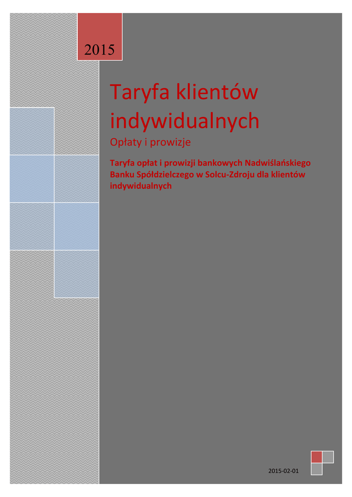 Załącznik do Uchwały Nr 59/08/AB/DZS/2014 Zarządu Banku BPS S.A. z dnia 30 października 2014 roku. 2015 Taryfa klientów indywidualnych Opłaty i prowizje Taryfa opłat i prowizji bankowych Nadwiślańskiego Banku Spółdzielczego w Solcu-Zdroju dla klientów indywidualnych Solec-Zdrój, styczeń 2015 r. 2015-02-01 Spis treści: Zasady pobierania opłat i prowizji bankowych ...........................................................................3 RACHUNKI .................................................................................................................................................4 TAB. 1 Konta osobiste ................................................................................................................................4 TAB. 2 Pozostałe rachunki bankowe.........................................................................................................6 TAB. 3 Rachunek płatny na każde żądanie w złotych potwierdzony książeczką oszczędnościową ....7 OSZCZĘDNOŚCI .......................................................................................................................................8 TAB. 4 Rachunki terminowych lokat oszczędnościowych w złotych i walutach obcych .....................8 KARTY BANKOWE....................................................................................................................................9 TAB. 5 Karty kredytowe ............................................................................................................................9 KREDYTY ..................................................................................................................................................10 TAB. 6 Kredyty gotówkowe .....................................................................................................................10 TAB. 7 Kredyty hipoteczne ......................................................................................................................10 TAB. 8 Kredyty pozostałe ........................................................................................................................11 INNE USŁUGI ..........................................................................................................................................12 TAB. 9 Ubezpieczenia ...............................................................................................................................12 TAB. 10 Czeki w obrocie dewizowym.....................................................................................................12 TAB. 11 Przekaz w obrocie dewizowym.................................................................................................13 TAB. 12 Usługi różne ...............................................................................................................................13 TAB. 13 Czynności kasowe ................................................................................................................14 PRODUKTY WYCOFANE Z OFERTY ..................................................................................................15 TAB. 14 Rachunek oszczędnościowo – rozliczeniowy w ofercie Banku do 14.06.2010r. ....................15 TAB. 15 Rachunek dla osób fizycznych będących członkami rad rodziców w złotych w ofercie Banku do 24.10.2012 ..................................................................................................................................16 TAB. 16 Karty płatnicze do rachunku oszczędnościowo-rozliczeniowego w ofercie Banku do 14.06.2010 ...................................................................................................................................................16 TAB. 17 Hipoteczne kredyty konsumpcyjne/kredyty mieszkaniowe w ofercie Banku do 14.06.2010 .....................................................................................................................................................................17 TAB. 18 Kredyty pozostałe wycofane z oferty banku ...........................................................................17 2 2 Zasady pobierania opłat i prowizji bankowych 1. „Taryfa opłat i prowizji bankowych Nadwiślańskiego Banku Spółdzielczego w Solcu-Zdroju dla klientów indywidualnych” zwana dalej Taryfą ma zastosowanie do usług bankowych świadczonych w placówkach Nadwiślańskiego Banku Spółdzielczego w Solcu-Zdroju, zwanego dalej Bankiem. 2. Opłaty i prowizje pobierane są: 1) po wykonaniu usługi lub na koniec dnia, w którym Klient złożył dyspozycję wykonania usługi; 2) miesięcznie lub w innych okresach rozliczeniowych; 3) zbiorczo - za wykonane usługi w trakcie okresu rozliczeniowego; 4) zgodnie z zawartą umową. 3. Bank nie realizuje wpłat i wypłat w walutach obcych w bilonie. W przypadku konieczności wypłat bilonu, Bank przelicza kwotę na złote polskie i wydaje Klientowi równowartość tej kwoty. 4. W przypadku, gdy Taryfa określa wysokość prowizji i opłat w granicach „od”, „do” oraz „od…do…” wysokość pobieranych opłat i prowizji ustalana jest indywidualnie w podanych granicach. 5. Wszelkie opłaty i prowizje bankowe pokrywa zleceniodawca transakcji chyba, że zawarte umowy stanowią inaczej. 6. Kwoty pobieranych prowizji i opłat podlegają zaokrągleniu do jednego grosza na zasadach ogólnych. Dotyczy to również kwot prowizji i opłat pobieranych w złotych od transakcji dokonywanych w obrocie dewizowym. Kwoty pobierane w walucie obcej są zaokrąglane wg analogicznych zasad. 7. Za operacje dewizowe zlecone przez rezydentów i nierezydentów pobiera się dodatkowo opłaty i prowizje lub koszty podane przez banki pośredniczące i inne podmioty finansowe przy wykonaniu zlecenia oraz poniesione przez Bank koszty kurierskie i telekomunikacyjne. 8. W przypadku transakcji realizowanych w walucie obcej, lub gdy podstawę naliczania prowizji stanowi kwota w waluci