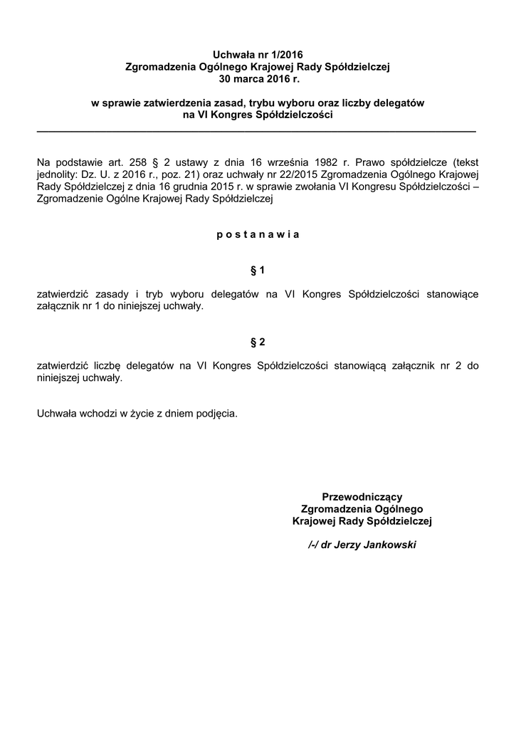 Uchwała nr 1/2016 Zgromadzenia Ogólnego Krajowej Rady Spółdzielczej 30 marca 2016 r. w sprawie zatwierdzenia zasad, trybu wyboru oraz liczby delegatów na VI Kongres Spółdzielczości ____________________________________________________________________________ Na podstawie art. 258 § 2 ustawy z dnia 16 września 1982 r. Prawo spółdzielcze (tekst jednolity: Dz. U. z 2016 r., poz. 21) oraz uchwały nr 22/2015 Zgromadzenia Ogólnego Krajowej Rady Spółdzielczej z dnia 16 grudnia 2015 r. w sprawie zwołania VI Kongresu Spółdzielczości – Zgromadzenie Ogólne Krajowej Rady Spółdzielczej postanawia §1 zatwierdzić zasady i tryb wyboru delegatów na VI Kongres Spółdzielczości stanowiące załącznik nr 1 do niniejszej uchwały. §2 zatwierdzić liczbę delegatów na VI Kongres Spółdzielczości stanowiącą załącznik nr 2 do niniejszej uchwały. Uchwała wchodzi w życie z dniem podjęcia. Przewodniczący Zgromadzenia Ogólnego Krajowej Rady Spółdzielczej /-/ dr Jerzy Jankowski Załącznik nr 1 do uchwały nr 1/2016 Zgromadzenia Ogólnego Krajowej Rady Spółdzielczej z dnia 30 marca 2016 r. Zasady i tryb wyboru delegatów na VI Kongres Spółdzielczości 1. W VI Kongresie Spółdzielczości – zwanym dalej „Kongresem” – uczestniczą delegaci spółdzielni i związków spółdzielczych wybrani według niniejszych zasad i trybu wyboru delegatów na VI Kongres zwanych dalej „zasadami”. 2. Wybór delegatów na Kongres, zgodnie z uchwałą nr 1/2016 Zgromadzenia Ogólnego Krajowej Rady Spółdzielczej z dnia 30 marca 2016 r. dokonywany jest podczas zjazdów przedkongresowych, w których mają prawo uczestniczyć przedstawiciele: a) spółdzielni, z wyjątkiem spółdzielni w likwidacji i upadłości. b) związków spółdzielczych. Spółdzielnie i związki spółdzielcze są reprezentowane podczas zjazdów przedkongresowych przez dwóch swoich przedstawicieli z zachowaniem zasady, iż każdej spółdzielni lub związkowi spółdzielczemu przysługuje tylko jeden głos. Przedstawicieli reprezentujących spółdzielnię lub związek spółdzielczy w obradach zjazdu przedkongresowego wybiera Rada Nadzorcza chyba, że statut spółdzielni lub związku stanowi inaczej. 3. Zjazdy przedkongresowe organizowane są dla przedstawicieli spółdzielni i związków spółdzielczych reprezentujących spółdzielnie i związki spółdzielcze według układów branżowych określonych w załączniku do niniejszych zasad. W zależności od liczby przedstawicieli – uczestników obrad zjazdy przedkongresowe mogą być organizowane jako: a) zjazdy krajowe – w których uczestniczą przedstawiciele wszystkich spółdzielni i związków spółdzielczych występujących w danej branży, b) zjazdy regionalne – w których uczestniczą przedstawiciele spółdzielni i związków spółdzielczych danej branży, mających swoje siedziby w ustalonym regionie. Region może obejmować teren województwa lub kilku województw. 4. Organizatorami zjazdów przedkongresowych są spółdzielcze związki rewizyjne we współdziałaniu z Krajową Radą Spółdzielczą. Krajowa Rada Spółdzielcza udziela pełnomocnictw do zorganizowania zjazdów przedkongresowych spółdzielczym związkom rewizyjnym zrzeszającym w danej branży największą liczbę spółdzielni. Związki te w dalszej części niniejszych zasad zwane są „organizatorami wiodącymi”. 5. Pełnomocnictwo udzielone organizatorowi wiodącemu określa: liczbę delegatów na Kongres stanowiących reprezentację danej branży, termin zakończenia zjazdów przedkongresowych, szczegółowe obowiązki organizatora wiodącego związane ze zwołaniem zjazdów i przeprowadzeniem wyborów oraz współdziałaniem z Krajową Radą Spółdzielczą w pracach dotyczących organizacji i obrad Kongresu. Organizator wiodący wykonuje swoje obowiązki określone w pełnomocnictwie w stosunku do wszystkich spółdzielni i związków spółdzielczych danej branży. 6. Każdy zjazd przedkongresowy organizowany na podstawie niniejszych zasad jest zjazdem dokonującym bezpośrednio wyborów delegatów na Kongres w liczbie określonej przez organizatora wiodącego. Jeżeli zjazd przedkongresowy jest zjazdem regionalnym - podstawę do ustalenia liczby wybieranych delegatów stanowi wskaźnik udziału liczby spółdzielni w regionie w ogólnej liczbie spółdzielni danej branży w Kraju – z uwzględnieniem postanowień punktu 2 niniejszych zasad. 7. Organizator wiodący jest odpowiedzialny za przeprowadzenie wyborów delegatów na Kongres spośród przedstawicieli wszystkich spółdzielni i związków spółdzielczych danej branży. W okresie poprzedzającym wybory organizator wiodący organizuje spotkanie z udziałem przedstawicieli wszystkich związków rewizyjnych danej branży. Celem tego spotkania jest określenie roli i miejsca pozostałych związków rewizyjnych w organizacji wyborów delegatów na Kongres oraz zasad ich współdziałania z organizatorem wiodącym. Uczestnicy spotkania powinni także dokonać rozdziału mandatów przyznanych do wyboru przez poszczególne zjazdy przedkongresowe. Formą organizacyjną koordynującą działania związane z wyborem delegatów spółdzielni i realizacją zadań związanych z przygotowaniem Kongresu w układzie branżowym może być branżowy Komitet Organizacyjny Kongresu powołany przy organizatorze wiodącym z udziałem przedstawicieli pozostałych związków rewizyjnych danej branży spółdzielczej. 8. Organizatorowi wiodącemu przysługuje prawo wyboru – w ramach ustalonej dla danej branży liczby mandatów – trzech delegatów na Kongres, których wybiera zjazd tego związku lub rada nadzorcza. W przypadku skorzystania z tego prawa organizator wiodący nie wybiera swoich przedstawicieli reprezentujących w tym charakterze związek w zjazdach przedkongresowych, o których mowa w punkcie 2 niniejszych zasad. 9. W celu usprawnienia prac przygotowawczych do zjazdów przedkongresowych Krajowa Rada S