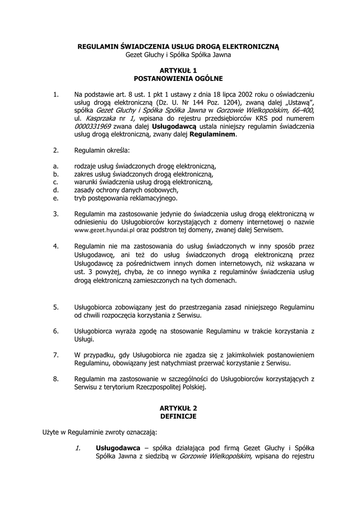 REGULAMIN ŚWIADCZENIA USŁUG DROGĄ ELEKTRONICZNĄ Gezet Głuchy i Spółka Spółka Jawna ARTYKUŁ 1 POSTANOWIENIA OGÓLNE 1. Na podstawie art. 8 ust. 1 pkt 1 ustawy z dnia 18 lipca 2002 roku o oświadczeniu usług drogą elektroniczną (Dz. U. Nr 144 Poz. 1204), zwaną dalej „Ustawą”, spółka Gezet Głuchy i Spółka Spółka Jawna w Gorzowie Wielkopolskim, 66-400, ul. Kasprzaka nr 1, wpisana do rejestru przedsiębiorców KRS pod numerem 0000331969 zwana dalej Usługodawcą ustala niniejszy regulamin świadczenia usług drogą elektroniczną, zwany dalej Regulaminem. 2. Regulamin określa: a. b. c. d. e. rodzaje usług świadczonych drogę elektroniczną, zakres usług świadczonych drogą elektroniczną, warunki świadczenia usług drogą elektroniczną, zasady ochrony danych osobowych, tryb postępowania reklamacyjnego. 3. Regulamin ma zastosowanie jedynie do świadczenia usług drogą elektroniczną w odniesieniu do Usługobiorców korzystających z domeny internetowej o nazwie www.gezet.hyundai.pl oraz podstron tej domeny, zwanej dalej Serwisem. 4. Regulamin nie ma zastosowania do usług świadczonych w inny sposób przez Usługodawcę, ani też do usług świadczonych drogą elektroniczną przez Usługodawcę za pośrednictwem innych domen internetowych, niż wskazana w ust. 3 powyżej, chyba, że co innego wynika z regulaminów świadczenia usług drogą elektroniczną zamieszczonych na tych domenach. 5. Usługobiorca zobowiązany jest do przestrzegania zasad niniejszego Regulaminu od chwili rozpoczęcia korzystania z Serwisu. 6. Usługobiorca wyraża zgodę na stosowanie Regulaminu w trakcie korzystania z Usługi. 7. W przypadku, gdy Usługobiorca nie zgadza się z jakimkolwiek postanowieniem Regulaminu, obowiązany jest natychmiast przerwać korzystanie z Serwisu. 8. Regulamin ma zastosowanie w szczególności do Usługobiorców korzystających z Serwisu z terytorium Rzeczpospolitej Polskiej. ARTYKUŁ 2 DEFINICJE Użyte w Regulaminie zwroty oznaczają: 1. Usługodawca – spółka działająca pod firmą Gezet Głuchy i Spółka Spółka Jawna z siedzibą w Gorzowie Wielkopolskim, wpisana do rejestru przedsiębiorców Krajowego Rejestru Sądowego pod numerem 0000331969, świadcząca usługi drogą elektroniczną z wykorzystaniem Serwisu. 2. Usługobiorca – każda osoba fizyczna, prawna bądź jednostka organizacyjna nieposiadającą osobowości prawnej, która korzysta z usługi świadczonej przez Usługodawcę z wykorzystaniem Serwisu. 3. Adres Poczty Elektronicznej – oznaczenie systemu teleinformatycznego umożliwiającego porozumiewanie się za pomocą poczty elektronicznej (email), 4. System Teleinformatyczny – zespół współpracujących ze sobą urządzeń informatycznych i oprogramowania, zapewniający przetwarzanie i przechowywanie, także wysyłanie i odbieranie danych przez sieci telekomunikacyjne za pomocą właściwego dla danego rodzaju sieci urządzenia końcowego w rozumieniu przepisów Prawa telekomunikacyjnego. 5. Usługa – usługa świadczona drogą elektroniczną w rozumieniu przepisów Ustawy, przez Usługodawcę. ARTYKUŁ 3 ROZPOCZĘCIE I ZAKOŃCZENIE KORZYSTANIA Z USŁUGI 1. Usługobiorca rozpoczyna korzystanie z Usługi z chwilą rozpoczęcia odbierania danych dostarczanych przez Usługodawcę za pomocą Serwisu. 2. Natychmiast po wyświetleniu się strony głównej Serwisu na monitorze Usługobiorcy, Usługobiorca powinien zapoznać się z treścią Regulaminu, do którego dostęp możliwy jest przy użyciu odpowiedniego odnośnika (linku). 3. Usługobiorca kończy korzystanie z Usługi wraz z zakończeniem odbierania danych dostarczanych przez Usługodawcę za pomocą Serwisu, chyba, że korzysta z usługi „Zapytanie o broszurę”. 4. Usługobiorca może w każdej, dowolnie obranej przez siebie chwili zakończyć korzystanie z Usługi. ARTYKUŁ 4 RODZAJE I ZAKRES USŁUG. 1. W ramach korzystania z Serwisu Usługodawca świadczy następujące usługi: (i) Usługi Informacyjne - polegające na udostępnieniu na indywidualne żądanie Usługobiorcy danych znajdujących się w Serwisie w ten sposób, iż następuje ich wyświetlenie w formie przygotowanej przez Usługodawcę i przetworzonej przez system komputerowy Usługobiorcy, a także zapisaniu tych danych na dysku twardym lub innych nośnikach Usługobiorcy, a dotyczących w szczególności: (a) informacji o produktach, w tym modelach samochodów, wersjach wyposażania, cenach, promocjach, danych technicznych, (b) informacji o usługach serwisowych oferowanych przez Usługodawcę w miejscu prowadzenia działalności, (c) informacji o produktach finansowych i ubezpieczeniowych oferowanych nabywcom samochodów Hyundai, (d) informacji o głównych zasadach gwarancji, (e) informacji o dostępnych akcesoriach do samochodów, (f) informacji o działalności Usługodawcy, (g) informacji o dostępnych do nabycia samochodach używanych w ramach programu Hyundai i-BEST, (ii) Zapytanie o ofertę – umożliwienie nawiązania kontaktu między Usługobiorcą a Usługodawcą w celu prezentacji Usługobiorcy informacji o możliwości nabycia samochodu marki Hyundai, (iii) Jazda Testowa (Jazda Próbna) – umożliwienie nawiązania kontaktu między Usługobiorcą a Usługodawcą w celu umożliwienia obydwu tym podmiotom ustalenia czasu i miejsca odbycia przez Usługobiorcę jazdy testowej (próbnej) dostępnym samochodem marki Hyundai, (iv) Zapytanie o broszurę - udostępnienie Usługobiorcy, na jego życzenie, możliwości pobrania z Serwisu broszury (katalogu) z wykorzystaniem unikalnego linku wygenerowanego na skutek zapytania Usługobiorcy i przesłanego mu na Adres Poczty Elektronicznej. (v) Konfigurator - umożliwienie Usługobiorcy w ramach wyboru spośród dostępnych w Serwisie opcji preferowanej przez Usługobiorcę konfiguracji samochodu, w tym dobrania rodzaju silnika, wyposażenia dodatkowego, skorzystania z dostępnych akcji promocyjnych, akcesoriów, (vi) Kontakt – umożliwienie Us