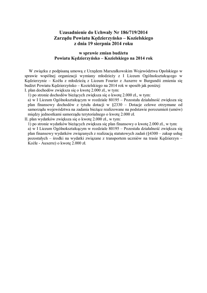 Uzasadnienie do Uchwały Nr 186/719/2014 Zarządu Powiatu Kędzierzyńsko – Kozielskiego z dnia 19 sierpnia 2014 roku w sprawie zmian budżetu Powiatu Kędzierzyńsko – Kozielskiego na 2014 rok W związku z podpisaną umową z Urzędem Marszałkowskim Województwa Opolskiego w sprawie wspólnej organizacji wymiany młodzieży z I Liceum Ogólnokształcącego w Kędzierzynie – Koźlu z młodzieżą z Liceum Fourier z Auxerre w Burgundii zmienia się budżet Powiatu Kędzierzyńsko – Kozielskiego na 2014 rok w sposób jak poniżej: I. plan dochodów zwiększa się o kwotę 2.000 zł., w tym: 1) po stronie dochodów bieżących zwiększa się o kwotę 2.000 zł., w tym: a) w I Liceum Ogólnokształcącym w rozdziale 80195 – Pozostała działalność zwiększa się plan finansowy dochodów z tytułu dotacji w §2330 – Dotacje celowe otrzymane od samorządu województwa na zadania bieżące realizowane na podstawie porozumień (umów) między jednostkami samorządu terytorialnego o kwotę 2.000 zł. II. plan wydatków zwiększa się o kwotę 2.000 zł., w tym: 1) po stronie wydatków bieżących zwiększa się plan finansowy o kwotę 2.000 zł., w tym: a) w I Liceum Ogólnokształcącym w rozdziale 80195 – Pozostała działalność zwiększa się plan finansowy wydatków związanych z realizacją statutowych zadań (§4300 – zakup usług pozostałych – środki na wydatki związane z transportem uczniów na trasie Kędzierzyn – Koźle - Auxerre) o kwotę 2.000 zł.