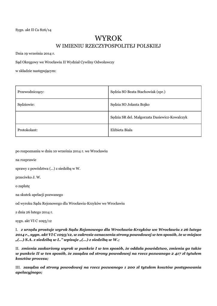 Sygn. akt II Ca 826/14 WYROK W IMIENIU RZECZYPOSPOLITEJ POLSKIEJ Dnia 19 września 2014 r. Sąd Okręgowy we Wrocławiu II Wydział Cywilny Odwoławczy w składzie następującym: Przewodniczący: Sędzia SO Beata Stachowiak (spr.) Sędziowie: Sędzia SO Jolanta Bojko Sędzia SR del. Małgorzata Dasiewicz-Kowalczyk Protokolant: Elżbieta Biała po rozpoznaniu w dniu 10 września 2014 r. we Wrocławiu na rozprawie sprawy z powództwa (...) z siedzibą w W. przeciwko J. W. o zapłatę na skutek apelacji pozwanego od wyroku Sądu Rejonowego dla Wrocławia-Krzyków we Wrocławiu z dnia 26 lutego 2014 r. sygn. akt VI C 1093/12 I. z urzędu prostuje wyrok Sądu Rejonowego dla Wrocławia-Krzyków we Wrocławiu z 26 lutego 2014 r., sygn. akt VI C 1093/12, w zakresie oznaczenia strony powodowej w ten sposób, że w miejsce „(...) S.A. z siedzibą w L.” wpisuje „(...) z siedzibą w W.; II. zmienia zaskarżony wyrok w punkcie I w ten sposób, że oddala powództwo, zmienia go także w punkcie II w ten sposób, że zasądza od strony powodowej na rzecz pozwanego 2 417 zł tytułem kosztów procesu; III. zasądza od strony powodowej na rzecz pozwanego 1 200 zł tytułem kosztów postępowania apelacyjnego; IV. nakazuje stronie powodowej, aby uiściła na rzecz Skarbu Państwa – Sądu Rejonowego dla Wrocławia-Krzyków we Wrocławiu opłatę od apelacji w kwocie 1 713 zł od ponoszenia, której pozwany był zwolniony. Sygn. akt II Ca 826/14 UZASADNIENIE Sąd Rejonowy dla Wrocławia-Krzyków we Wrocławiu w wyroku z dnia 26 lutego 2014 r. w punkcie I zasądził od pozwanego J. W. na rzecz strony powodowej (...) S.A. z siedzibą w L. 39 243,26 zł z ustawowymi odsetkami od dnia 9 marca 2011 r. do dnia zapłaty, w punkcie II zasądził od pozwanego na rzecz strony powodowej 2 908 zł kosztów procesu. Sąd pierwszej instancji ustalił, że w dniu 22 grudnia 1999 r. J. W. i M. W. zawarli z (...) Bank S.A. w P. Oddziałem (...)we W. umowę o kredyt na podstawie ,której otrzymali kwotę kredytu 23 030,30 zł. Kredyt został udzielony na finansowanie zakupu pojazdu marki C. (...), a dla zabezpieczenia spłaty kredytu w dniu 22 grudnia 1999 r. została zawarta umowa przewłaszczenia rzeczy ruchomej na podstawie, której kredytobiorcy przenieśli na rzecz (...) Bank S.A. w P. udział w prawie własności pojazdu marki C. (...) z 1991 r. w części 49/100. Strony postanowiły, że jeżeli kredyt z odsetkami i innymi kosztami zostanie spłacony w terminie określonym w umowie kredytowej, udział w prawie własności pojazdu w 49/100 części przysługujący bankowi przejdzie z powrotem na kredytobiorcę, natomiast, jeżeli bank złoży oświadczenie o wypowiedzeniu umowy o kredyt, na bank przejdzie pozostała część udziału w prawie własności pojazdu wynosząca 51/100 i przysługująca kredytobiorcy. Prawo użytkowania samochodu pozostało po stronie kredytobiorców. Pismem z 22 sierpnia 2000 r. (...) Bank S.A. wypowiedział kredytobiorcom umowę ze skutkiem na dzień 15 października 2000 r. z powodu zaległości ze spłatą kredytu w kwocie 1 355,56 zł. W chwili rozwiązania umowy zadłużenie wynosiło 22 055,51 zł wraz z dalszymi odsetkami przeterminowanymi naliczanymi od dnia 16 października 2000 r. do dnia 14 stycznia 2001 r. W dniu 22 listopada 2001 r. windykatorzy działający na zlecenie (...) Bank S.A. odebrali J. W. samochód C. (...). W dniu 18 czerwca 2003 r. na poczet spłaty kredytu zaliczona została przez (...) Bank S.A. kwota 4 180,33 zł, jako wartość przejętego pojazdu. J. W. po odebraniu pojazdu był przekonany, że wartość samochodu znacznie przewyższa kwotę zadłużenia w wyniku, czego bank został w pełni zaspokojony. W tamtym okresie J. W. brał udział w sprawie o rozwód oraz podział majątku z byłą żoną, przez co przestał zajmować się sprawą kredytu oraz pojazdu C. (...). W dniu 15 listopada 2002 r. (...) Bank S.A. w P. Oddział (...) we W. uzyskał klauzulę wykonalności nadaną bankowemu tytułowi egzekucyjnemu wystawionemu przeciwko pozwanemu i jego małżonce M. W. na kwotę 25 994,95 zł z ustawowymi odsetkami liczonymi od kwoty 19 492,07 zł od dnia 7 marca 2002 r. do dnia zapłaty. W dniu 30 grudnia 2010 r. (...) Bank S.A. w P. przelał wierzytelność przysługującą od J. W. z tytułu wypowiedzianej umowy kredytowej na rzecz (...) w W.. Wyciągiem z ksiąg rachunkowych nr (...) z 9 marca 2011 r. (...) w W. stwierdził, że przysługuje mu od J. W. wierzytelność z tytułu umowy nr (...) z dnia 22 grudnia 1999 r. z (...) Bank S.A. w wysokości 39 243, 26 zł, nabytej w drodze umowy przelewu wierzytelności z 30 grudnia 2010 r. Na kwotę wymagalnego zadłużenia składać się miały kwoty: 11 100, 57 zł z tytułu kapitału, 27 950, 69 zł – odsetek oraz 192 zł – kosztów. Zdaniem Sądu Rejonowego, w świetle zgromadzonego materiału dowodowego, powództwo w całości zasługiwało na uwzględnienie. Istotne okoliczności w sprawie były między stronami bezsporne i wynikały w sposób niewątpliwy z załączonej dokumentacji w postaci umowy o kredyt, umowy o przewłaszczeniu, pisma banku wypowiadającego umowę kredytową, protokołu odbioru pozwanemu samochodu przez windykatorów banku oraz umowy przelewu wierzytelności. Żadna ze stron nie kwestionowała zgromadzonej dokumentacji, Sąd pierwszej instancji również nie znalazł podstaw, by odmówić jej wiarygodności, wobec czego stanowiła podstawę ustaleń faktycznych w sprawie. Tak zgromadzony materiał dowodowy w postaci dokumentów uzupełniło przesłuchanie J. W., które Sąd Rejonowy uznał za w pełni wiarygodne, jednak okoliczności podnoszone przez pozwanego miały drugorzędne znaczenie dla rozstrzygnięcia sprawy. J. W. przyznał, że nie spłacił wszystkich rat kredytu w wyniku, czego umowa została skutecznie wypowiedziana przez (...) Bank S.A, nie był w stanie wskazać, jaką część kredytu spłacił. W zasadzie jedynym argumentem pozwanego był zarzut spłaty