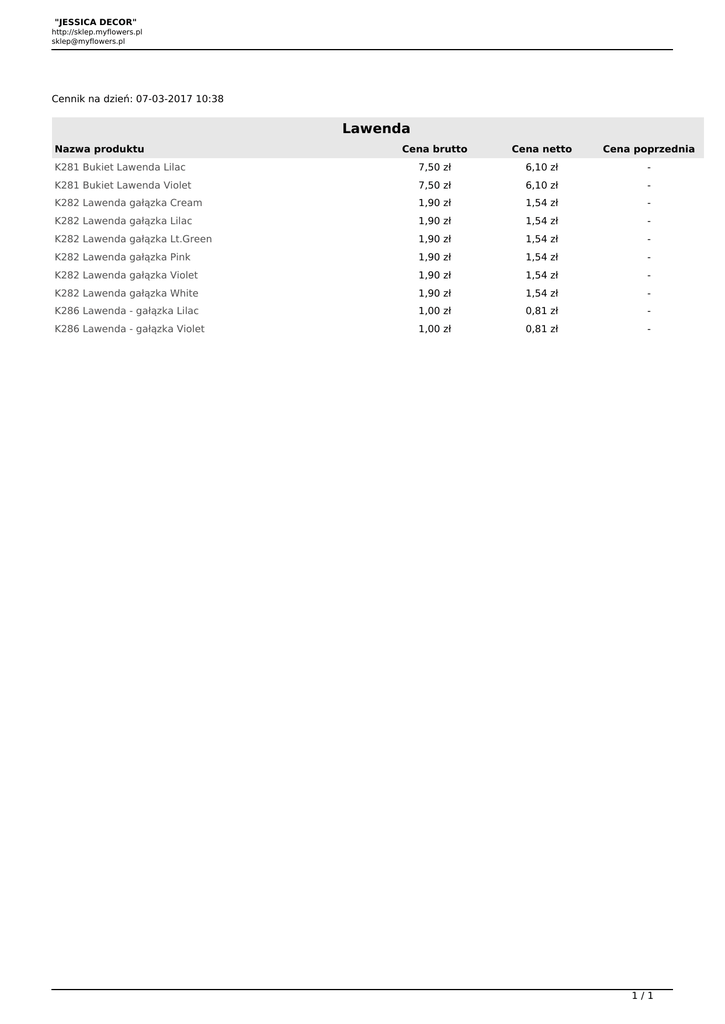"JESSICA DECOR" http://sklep.myflowers.pl [email protected] Cennik na dzień: 07-03-2017 10:38 Lawenda Nazwa produktu Cena brutto Cena netto Cena poprzednia K281 Bukiet Lawenda Lilac 7,50 zł 6,10 zł - K281 Bukiet Lawenda Violet 7,50 zł 6,10 zł - K282 Lawenda gałązka Cream 1,90 zł 1,54 zł - K282 Lawenda gałązka Lilac 1,90 zł 1,54 zł - K282 Lawenda gałązka Lt.Green 1,90 zł 1,54 zł - K282 Lawenda gałązka Pink 1,90 zł 1,54 zł - K282 Lawenda gałązka Violet 1,90 zł 1,54 zł - K282 Lawenda gałązka White 1,90 zł 1,54 zł - K286 Lawenda - gałązka Lilac 1,00 zł 0,81 zł - K286 Lawenda - gałązka Violet 1,00 zł 0,81 zł - 1/1 Powered by TCPDF (www.tcpdf.org)