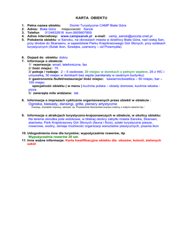 KARTA OBIEKTU 1. 2. 3. 4. 5. Pełna nazwa obiektu Domki Turystyczne CAMP Biała Góra Adres: Biała Góra miejscowość Sanok 0134632818 kom.0605607855 Telefon Adres internetowy: www.campsanok.pl e-mail: [email protected] Położenie obiektu: w Sanoku, na obrzeżach miasta w dzielnicy Biała Góra, nad rzeką San, przy drodze do Skansenu, w sąsiedztwie Parku Krajobrazowego Gór Słonych, przy szlakach turystycznych (Szlak Ikon, Szwejka, czerwony – od Przemyśla) 6. Dojazd do obiektu: dobry 7. Informacje o obiekcie: 1/ rezerwacja: email, telefoniczna, fax 2/ ilość miejsc: 75 3/ pokoje / rodzaje: 2 – 5 osobowe; 20 miejsc w domkach z pełnym węzłem, 25 z WC i umywalką, 30 miejsc w domkach bez węzła (sanitariaty w osobnym budynku) 4/ gastronomia /bufet/restauracja/ ilość miejsc: kawiarnio/świetlica – 50 miejsc, bar – 100 miejsc specjalność obiektu ( w menu ) kuchnia polska – obiady domowe, kuchnia włoska pizza 5/ zwierzęta mile widziane: tak 8. Informacja o imprezach cyklicznie organizowanych przez obiekt/ w obiekcie : Ogniska, biesiady, dansingi, grille, plenery artystyczne /miesiąc, charakter imprezy, adresat: np. Przedszkole Narciarskie-marzec-rodziny z małymi dziećmi itp./ 9. Informacje o atrakcjach turystyczno-krajoznawczych w obiekcie, w okolicy obiektu: Na terenie ośrodka pole widokowe, w bliskiej okolicy zabytki miasta Sanoka, Skansen, starówka, Park Krajobrazowy Gór Słonych (fauna i flora), szlaki turystyczne piesze, rowerowe, wodny, istnieje możliwość organizacji warsztatów plastycznych, pisania ikon 10. Udogodnienia inne dla turystów; wypożyczalnie rowerów, itp Wypożyczalnia rowerów 20 szt. 11. Inne ważne informacje: Karta kwalifikacyjna obiektu dla obozów, kolonii, zielonych szkół