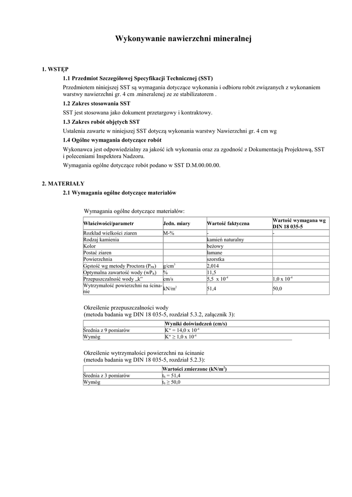 Wykonywanie nawierzchni mineralnej 1. WSTĘP 1.1 Przedmiot Szczegółowej Specyfikacji Technicznej (SST) Przedmiotem niniejszej SST są wymagania dotyczące wykonania i odbioru robót związanych z wykonaniem warstwy nawierzchni gr. 4 cm .mineralenej ze ze stabilizatorem . 1.2 Zakres stosowania SST SST jest stosowana jako dokument przetargowy i kontraktowy. 1.3 Zakres robót objętych SST Ustalenia zawarte w niniejszej SST dotyczą wykonania warstwy Nawierzchni gr. 4 cm wg 1.4 Ogólne wymagania dotyczące robót Wykonawca jest odpowiedzialny za jakość ich wykonania oraz za zgodność z Dokumentacją Projektową, SST i poleceniami Inspektora Nadzoru. Wymagania ogólne dotyczące robót podano w SST D.M.00.00.00. 2. MATERIAŁY 2.1 Wymagania ogólne dotyczące materiałów Wymagania ogólne dotyczące materiałów: Właściwości/parametr Jedn. miary Rozkład wielkości ziaren M-% Rodzaj kamienia Kolor Postać ziaren Powierzchnia Gęstość wg metody Proctora (PPR) g/cm3 Optymalna zawartość wody (wP R) % Przepuszczalność wody „k” cm/s Wytrzymałość powierzchni na ścinakN/m2 nie Wartość faktyczna kamień naturalny beżowy łamane szorstka 2,014 11,5 5,5 x 10-4 1,0 x 10-4 51,4 50,0 Określenie przepuszczalności wody (metoda badania wg DIN 18 035-5, rozdział 5.3.2, załącznik 3): Średnia z 9 pomiarów Wymóg Wyniki doświadczeń (cm/s) Kw = 14,0 x 10-4 Kw ≥ 1,0 x 10-4 Określenie wytrzymałości powierzchni na ścinanie (metoda badania wg DIN 18 035-5, rozdział 5.2.3): Średnia z 3 pomiarów Wymóg Wartość wymagana wg DIN 18 035-5 - Wartości zmierzone (kN/m2) tS = 51,4 tS ≥ 50,0 Uwaga: . Materiały do wykonania Nawierzchni dostarczane są zawsze w stanie, którego wilgotność zbliżona jest do wilgotności ziemi, i charakteryzują się wysoką jakością. - Nawierzchnię można wykonać przy pomocy układarki, belki profilującej, piaskarki bądź ręcznie. - Pochylenie podłużne drogi z Nawierzchnią, może w zasadzie wynosić dwukrotność pochylenia poprzecznego. Dla wyjaśnienia: Pochylenie podłużne 10% powinno mieć pochylenie poprzeczne 5%. Od 3% pochylenia poprzecznego musi koniecznie być stosowany profil daszkowy. - Warstwa wierzchnia Nawierzchni ubijana jest statycznie przy użyciu dostatecznie ciężkiego walca. - Do mniejszych powierzchni nadaje się również ubijarka ręczna. - Po wywalcowaniu warstwę zamykającą należy lekko wzruszyć za pomocą grabi bądź miotły. Dzięki temu nawierzchnia będzie chłonąć wodę. - W czasie silnego nasłonecznienia nawierzchnię należy dodatkowo nawadniać. - Po wykończeniu wskazane jest chodzenie bądź jeżdżenie po warstwie wierzchniej. - Ewentualne uszkodzenia będące wynikiem wandalizmu należy zagrabić oraz ponownie ubić nawierzchnię. - Ostateczne ubicie nawierzchni uzyskuje się z reguły po trzykrotnej zmianie warunków pogodowych (słońce – deszcz – słońce itd.) - Nawierzchni nie wykonywać podczas mrozów ani w temperaturze zbliżonej do temperatury zamarzania. Materiały do wykonania warstwy: Opis produktu: Nawierzchnia jest przeznaczona dla ścieżek spacerowych i alei w parkach, Składniki: Nawierzchnia składa się z czystego materiału budowlanego z wysokogatunkowych surowców, takich jak; łupki wysokogórskie, specjalny wiążący żwir i kamień naturalny. Oraz stabilizatora mineralnego Właściwości: Nawierzchnia nie kruszy i nie pyli się, jest odporny na działanie zewnętrznych warunków atmosferycznych oraz łatwy w obróbce. Posiada wysoką odporność na ciężar, ścieranie i jest nie brudzący. Nawierzchnia nadaje się na powierzchnie przeznaczone dla wózków inwalidzkich. Dane techniczne: Nawierzchnia posiada grubość ziarna od 0 do 11 mm, waga wynosi 2,00 tony/m3. Wskazówki eksploatacyjne: Nawierzchnia jest osadzany na głębokość 6cm Nachylenie powierzchni powinno wynosić 2-3 % (zgodnie z rysunkami zawartymi w dokumentacji technicznej). Wskazówki dotyczące pielęgnacji W przypadku ewentualnych obniżeń wbudowanego materiału Nawierzchni należy: - poluzować powierzchnię po ok. 4-6 tygodniach na głębokość ok. 2 cm, - nanieść nową warstwę Nawierzchni i wielokrotnie walcować. Każdej wiosny należy przeprowadzić mechaniczną pielęgnację, a w przypadku intensywniejszego użytkowania dwa razy w roku: - lekkie poluzowanie za pomocą grabi, - w razie potrzeby nanieść nową warstwę Nawierzchni; materiał powinien mieć niewielką wilgotność, - powierzchnię przewalcować, - na koniec ściągnąć lub wyrównać urządzeniem do pielęgnacji o szerokości minimum 2 m. 3.SPRZĘT 3.1 Ogólne wymagania dotyczące sprzętu. Ogólne wymagania dotyczące sprzętu podano w SST-D-M-00.00.00 „Wymagania ogólne” pkt. 3. 3.2 Sprzęt do wykonania nawierzchni żwirowej Wykonawca przystępujący do wykonania nawierzchni powinien wykazać się możliwością korzystania z następującego sprzętu: - koparek i ładowarek, - spychaczy i równiarek do spulchniania, rozkładania, profilowania, - przewoźnych zbiorników na wodę do zwilżania kruszywa, wyposażonych w urządzenia do dozowania wody, - walców statycznych lekkich i średnich, 4. TRANSPORT 4.1 Ogólne wymagania dotyczące transportu. Ogólne wymagania dotyczące transportu podano w SST-D-M-00.00.00 „Wymagania ogólne” pkt.4. 4.2 Transport kruszywa Kruszywo można przewozić dowolnymi środkami transportu w warunkach zabezpieczających je przed zanieczyszczeniem, nadmiernym wysuszeniem i zawilgoceniem. 5. WYKONANIE ROBÓT 5.1.Ogólne zasady wykonywania robót. Wykonawca przedstawi Inspektorowi Nadzoru do akceptacji projekt organizacji i harmonogram robót, uwzględniające warunki w jakich wykonywana będzie nawierzchnia. Warunki wykonania zgodnie z wytycznymi Producenta. 6. KONTROLA JAKOŚCI W TRAKCIE WBUDOWYWANIA KRUSZYWA 6.1. Badanie właściwości materiałów Sprawdzenie właściwości materiałów polega na zbadaniu i porównaniu wyników z wymaganiami Producenta. 6.2. Sprawdzenie prawid