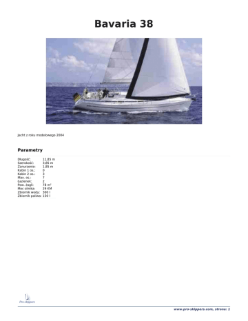 Bavaria 38 Jacht z roku modelowego 2004 Parametry Długość: 11,85 m Szerokość: 3,85 m Zanurzenie: 1,85 m Kabin 1 os.: 0 Kabin 2 os.: 3 Max. os.: 7 Łazienek: 2 Pow. żagli: 78 m2 Moc silnika: 29 KM Zbiornik wody: 300 l Zbiornik paliwa: 150 l www.pro-skippers.com, strona: 1 www.pro-skippers.com, strona: 2