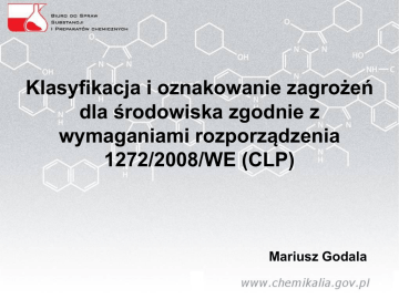 Klasyfikacja i oznakowanie zagrożeń dla środowiska zgodnie z wymaganiami rozporządzenia 1272/2008/WE (CLP) Mariusz Godala Kryteria klasyfikacji środowiskowej - zagrożenie dla środowiska wodnego, - zagrożenie dla warstwy ozonowej Zagrożenie dla środowiska wodnego: Substancje klasyfikuje się zwykle na podstawie danych: doświadczalnych dotyczących toksyczności ostrej substancji dla organizmów wodnych (wyniki badań na rybach, rozwielitkach glonach lub innych organizmach wodnych), rozkładu substancji, wartości odpowiednich współczynników: log współczynnika Kow lub wspłóczynnik BCF log Kow 4 lub BCF 500: substancja może mieć wysoką zdolność do bioakumulacji Substancje łatwo ulegające degradacji: biodegradacja: test trwający 28 dni. Poziom degradacji 70% - DOC lub 60% - ubytek tlenu lub generacja CO2 BZT5/ChZT 0,5, dostępne są inne przekonujące naukowe dowody, wykazujące że substancje lub mieszaniny mogą ulec rozkładowi (biotycznemu lub abiotycznemu) w środowisku wodnym do poziomu > 70% w okresie 28 dni Kryteria klasyfikacji środowiskowej (toksyczność ostra) Zagrożenie dla środowiska wodnego: Toksyczność ostra: kategoria 1 96 godzin CL50 (dla ryb) ≤ 1 mg/l, lub 48 godzin CE50 (dla skorupiaków) ≤ 1 mg/l, lub 72 godziny lub 96 godzin CEr50 (dla glonów lub innych organizmów wodnych)≤ 1 mg/l Kryteria klasyfikacji środowiskowej (toksyczność przewlekła) Zagrożenie dla środowiska wodnego Toksyczność przewlekła: kategoria 1 96 godzin CL50 (dla ryb) ≤ 1 mg/l, lub 48 godzin CE50 (dla skorupiaków) ≤ 1 mg/l, lub 72 godziny lub 96 godzin CEr50 (dla glonów lub innych organizmów wodnych)≤ 1 mg/l i substancja nie ulega łatwo rozkładowi lub określony doświadczalnie współcynnik BCF 500 (lub w razie jego braku, wartość log współczynnik podziału oktanol/woda log Kow 4) Kryteria klasyfikacji środowiskowej (toksyczność przewlekła) Zagrożenie dla środowiska wodnego Toksyczność przewlekła: kategoria 2 96 godzin CL50 (dla ryb): 1 mg/l <CL50 ≤ 10 mg/l, lub 48 godzin CE50 (dla skorupiaków): 1 mg/l <CL50 ≤ 10 mg/l , lub 72 godziny lub 96 godzin CEr50 (dla glonów lub innych organizmów wodnych): 1 mg/l <CL50 ≤ 10 mg/l i substancja nie ulega łatwo rozkładowi lub określony doświadczalnie współcynnik BCF 500 (lub w razie jego braku, wartość log współczynnik podziału oktanol/woda log Kow 4), chyba że NOEC (stężenie bez obserwowanego działania) wyznaczony w badaniach toksyczności w narażeniu przewlekłym >1 Kryteria klasyfikacji środowiskowej (toksyczność przewlekła) Zagrożenie dla środowiska wodnego Toksyczność przewlekła: kategoria 3 96 godzin CL50 (dla ryb): 10 mg/l <CL50 ≤ 100 mg/l, lub 48 godzin CE50 (dla skorupiaków): 10 mg/l <CL50 ≤ 100 mg/l , lub 72 godziny lub 96 godzin CEr50 (dla glonów lub innych organizmów wodnych): 10 mg/l <CL50 ≤ 100 mg/l i substancja nie ulega łatwo rozkładowi lub określony doświadczalnie współcynnik BCF 500 (lub w razie jego braku, wartość log współczynnik podziału oktanol/woda log Kow 4), chyba że NOEC (stężenie bez obserwowanego działania) wyznaczony w badaniach toksyczności w narażeniu przewlekłym >1 Kryteria klasyfikacji środowiskowej (toksyczność przewlekła) Zagrożenie dla środowiska wodnego Toksyczność przewlekła: kategoria 4 Przypadki, w których dane nie umożliwiają klasyfikacji zgodnie z powyższymi kryteriami, ale istnieją niemniej jednak powody do obaw. Obejmują one: słabo rozpuszczalne substancje, w przypadku których nie odnotowuje się toksyczności ostrej na poziomie do rozpuszczalności w wodzie i które nie ulegają szybko rozkładowi i mają określony doświadczalnie współczynnik BCF 500 (lub w razie jego braku, wartość log współczynnika podziału oktanol/woda log Kow ≥4) wskazujący na potencjał do bioakumulacji – będą klasyfikowane tej kategorii, o ile inne dowody naukowe nie wskazują, że klasyfikacja jest niepotrzebna. Dowody takie obejmują: NOEC toksyczności przewlekłej > rozpuszczalności w wodzie lub >1 mg/l, Informacje o szybkim rozkładzie w środowisku. Kryteria klasyfikacji środowiskowej (zagrożenie dla warstwy ozonowej) Substancje stwarzające zagrożenie dla warstwy ozonowej – substancje, które na podstawie dostępnych dowodów określających ich właściwości oraz prognozowane lub znane szlaki i zachowanie w środowisku mogą stwarzać zagrożenie dla struktury lub funkcji stratosferycznej warstwy ozonu. Obejmuje to substancje wymienione w załączniku I do rozporządzenia (WE) nr 2037/2000 (zmienione rozporządzeniem 1005/2009) Parlamentu Europejskiego w sprawie substancji zubożających warstwę ozonową. Tabela przełożenia klasyfikacji w przypadku substancji/mieszanin stwarzających zagrożenie dla środowiska Tabela przełożenia – tabela 1.1 z załącznika VII Klasyfikacja na mocy dyrektywy 67/548/EWG N; R50 Klasyfikacja na mocy rozporządzenia 1272/2008/WE Aquatic Acute 1 H400 N; R50/53 Aquatic Acute 1 H400 Aquatic Chronic 1 H410 Aquatic Chronic 2 H411 Aquatic Chronic 3 H412 Aquatic Chronic 4 H413 Ozone EUH059 N; R51/53 R 52/53 R 53 N; R 59 Współczynnik M Współczynnik M – zależny od wartości toksyczności ostrej substancji dla organizmów wodnych, stosowany przy klasyfikacji mieszanin, metodą obliczeniową, zawierających w swoim składzie substancje zaklasyfikowane jako stwarzające zagrożenie dla środowiska toksyczność ostra kategoria 1 lub toksyczność przewlekła kategoria 1. Załącznik VI do CLP – Tabela 3.1 Nazwa Klasyfikacja Oznakowanie karbaryl (PN) Carc. 2 H351 Acute Tox. 4* H302 Aquatic Acute 1 H400 GHS08 GHS07 GHS09 Wng H351 H302 H400 izoproturon (PN) Carc. 2 H351 Aquatic Acute 1; H400 Aquatic Chronic 1 H410 GHS08 GHS09 Wng H351 H410 Oznakowanie: dodatkowe zwroty wskazujące rodzaj zagrożenia Stężenia graniczne / współczynnik M M=10 Współczynnik M wartość CL50 lub CE50 0,1<CL(E)50 ≤1 0,01<CL(E)50 ≤0,1 0,001<CL(E)50 ≤0,01