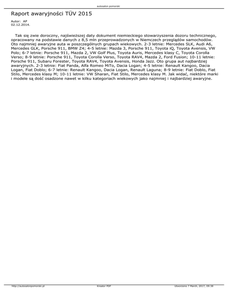 autosalon pomorski Raport awaryjności TÜV 2015 Autor: AP 02.12.2014. Tak się zwie doroczny, najświeższej daty dokument niemieckiego stowarzyszenia dozoru technicznego, opracowany na podstawie danych z 8,5 mln przeprowadzonych w Niemczech przeglądów samochodów. Oto najmniej awaryjne auta w poszczególnych grupach wiekowych. 2-3 letnie: Mercedes SLK, Audi A6, Mercedes GLK, Porsche 911, BMW Z4; 4-5 letnie: Mazda 3, Porsche 911, Toyota iQ, Toyota Avensis, VW Polo; 6-7 letnie: Porsche 911, Mazda 2, VW Golf Plus, Toyota Auris, Mercedes klasy C, Toyota Corolla Verso; 8-9 letnie: Porsche 911, Toyota Corolla Verso, Toyota RAV4, Mazda 2, Ford Fusion; 10-11 letnie: Porsche 911, Subaru Forester, Toyota RAV4, Toyota Avensis, Honda Jazz. Oto grupa aut najbardziej awaryjnych. 2-3 letnie: Fiat Panda, Alfa Romeo MiTo, Dacia Logan; 4-5 letnie: Renault Kangoo, Dacia Logan, Fiat Doblo; 6-7 letnie: Renault Kangoo, Dacia Logan, Renault Laguna; 8-9 letnie: Fiat Doblo, Fiat Stilo, Mercedes klasy M; 10-11 letnie: VW Sharan, Fiat Stilo, Mercedes klasy M. Jak widać, niektóre marki i modele są dość osadzone nawet w kilku kategoriach wiekowych jako najmniej i najbardziej awaryjne. http://autosalonpomorski.pl Kreator PDF Utworzono 7 March, 2017, 09:38
