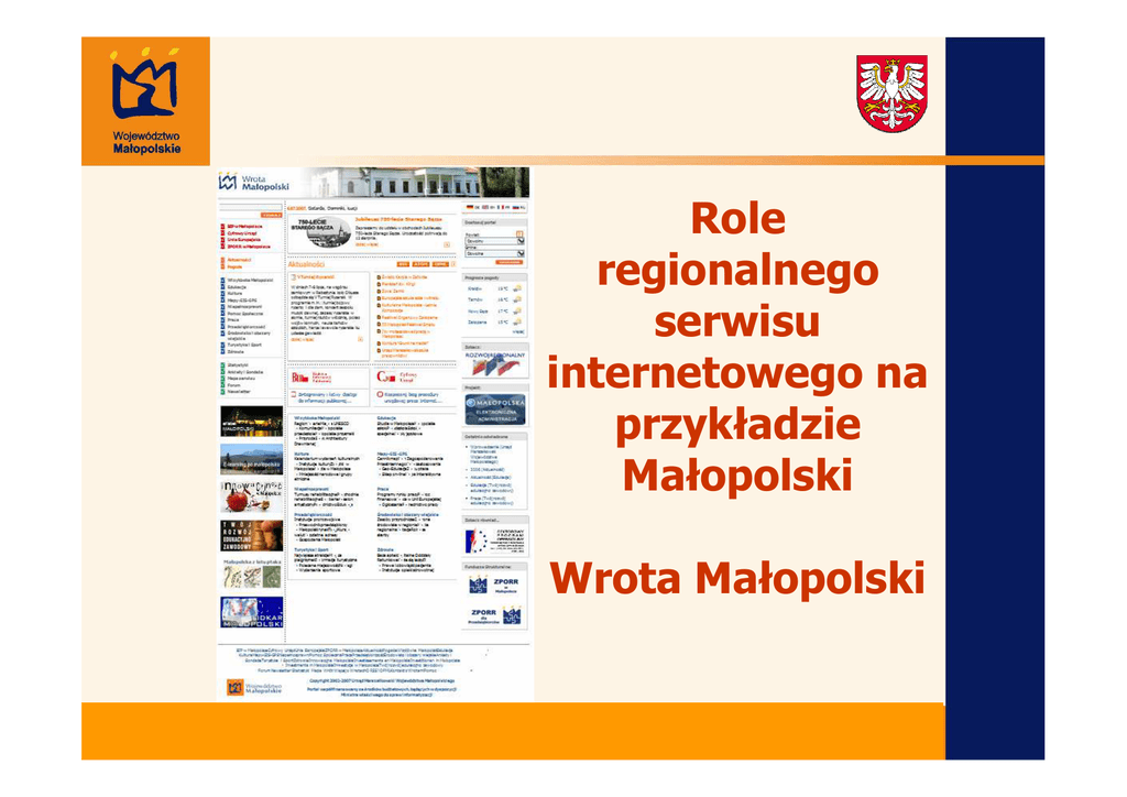 Role regionalnego serwisu internetowego na przykładzie Małopolski Wrota Małopolski Wrota Malopolski –regionalny portal Kraków, 2 e-Government kwietnia 2004 r. Cele dla e-administracji Czego oczekujemy od e- administracji? E-administracja – uŜywanie technologii informacyjnych i Internetu dla obywateli, biznesu i interakcji pomiędzy administracją Redukowanie odwiedzin obywateli w urzędach, migracja tego typu kontaktów do Internetu i prosty dostęp do informacji publicznych. Tańsze koszty administracji publicznej Łatwy i prosty dostęp do danych w dyspozycji administracji publicznej Wrota Malopolski –regionalny portal e-Government Serwisy www Małopolski www.malopolskie.pl – serwis urzędowy prezentujący działania Sejmiku, Zarządu i Urzędu Województwa Małopolskiego Intranet – serwis roboczy dla pracowników urzędu – niezbędne kompendium wiedzy na temat wewnętrznych regulacji pracy urzędu oraz vademecum (komunikaty, telefony, katalogi plików, ogłoszenia pracowników etc) Wrota Małopolski – Regionalny Portal Internetowy wraz z subserwisami np. Małopolską Biblioteką Cyfrową Dlaczego? Wrota Malopolski –regionalny portal e-Government WROTA MAŁOPOLSKI www.malopolska.pl Wrota Małopolski to: Platforma informacyjna zapewniająca obywatelom i podmiotom prawnym dostęp do regionalnych zasobów informacyjnych. Wrota Małopolski stanowią elektroniczną platformę umoŜliwiającą świadczenie mieszkańcom regionu usług przez urzędy administracji publicznej. Celami portalu Wrota Małopolski jest: • Dostarczanie w przystępnej i atrakcyjnej formie informacji na temat regionu i jego promowanie, integracja tych zasobów • Zapewnienie dostępu do zasobów informacyjnych instytucji publicznych regionu • Świadczenie usług przez urzędy administracji publicznej regionu • UmoŜliwienie kontaktu z tymi instytucjami Wrota Malopolski –regionalny portal e-Government Historia 2001 – start projektu, 2002 – porozumienie z Wojewodą, październik, 2003 – 18 czerwca – 2 edycja WM, nowa technologia (.NET, CMS 2002 etc.) 2004 – 2 kwietnia – 2 edycja WM, nowy Department UMWM, 2005 – 3 edycja, cyfrowy podpis we Wrotach 2006 - 4 edycja, online 50 nowych formularzy 2007 – następna edycja WM, 50 nowych form, e-elarning (Moodle), e-szkoła Wrota Malopolski –regionalny portal e-Government Wyzwania podczas wdroŜenia Wrota jako integrator regionu 1. Nowe kanały komunikacji, 2. Nowa parasolowa organizacja 3. Cykle szkoleń (1000 uŜytkowników) Wrota Malopolski –regionalny portal e-Government Wrota jako baza wiedzy (1) • Aktualności • Pogoda • Wizytówka Małopolski • Edukacja • Kultura • Mapy GIS – GPS • Niepełnosprawni • Praca • Przedsiębiorczość • Środowisko i obszary wiejskie • Turystyka i sport • Zdrowie • Statystyki • Newsletter • Forum • Unia Europejska • ZPORR Wrota Malopolski –regionalny portal e-Government Wrota jako baza wiedzy (2) Bazy danych • Edukacja • Kultura • Niepełnosprawni • Praca • Przedsiębiorczość • Środowisko i obszary wiejskie • Turystyka i sport • Zdrowie Sposoby udostępniania i aktualizacji: • webservices, • import i eksport plików baz danych, • aktualizacja poszczególnych rekordów przez www • Współdzielenie z innym stronami www (w trakcie realizacji) Wrota Malopolski –regionalny portal e-Government Wrota jako hub serwisów • Małopolski szlak UNESCO • Szlak architektury drewnianej • Smaki Małopolska • Małopolskie Przedszkole • Małopolska z lotu ptaka • Visit.Malopolska.pl • Małopolska Blblioteka Cyfrowa • E-szkoła • Platforma e-learning (moodle) • …. Wrota Malopolski –regionalny portal e-Government Wrota Małopolski jako narzędzie promocji na zewnątrz 1. Serwis promujący region i jego atrakcje na zewnątrz: visit. malopolska.pl, smaki małopolski, Małopolski Szlak UNESCO … 2. Promocja dla turystów: mieszkańców regionu, Polski i obywateli innych krajów 3. Konieczność reorientacji serwisów www - rola indeksowania w wyszukiwarkach np. w Google. Wrota Malopolski –regionalny portal e-Government Wrota jako narzędzie informacji i współpracy z podmiotami w Małopolsce • Publikowanie rocznego kalendarium wydarzeń kulturalnych oraz turystycznych w Małopolsce z moŜliwością jego aktualizacji przez internautów • Bezpłatne promowanie zbliŜających się wydarzeń w aktualnościach Wrót • Promowanie wydarzeń na 1 stronie portalu • Promowanie wydarzeń w newsletterze • Publikowanie informacji w publikacjach UMWM Metoda: kontakt elektroniczny (maile z treścią ogłoszeń przeznaczonych do publikacji, formularze na stronach www, automatyczne aktualizowanie baz danych) Wrota Malopolski –regionalny portal e-Government Wrota jako baza wiedzy o administracji Obowiązki administracji publicznej – dostęp do informacji publicznej Ustawa o dostępie do informacji publicznej (2001) Wszystkie informacje dotyczące spraw publicznych są publikowane w internecie w BIP - strona www o specyficznej baz BIP – specyficzna część Wrót Wrota Malopolski –regionalny portal e-Government BIP • Pełny dostęp przez jedno miejsce • Jedno narzędzie, zdecentralizowane uprawnienia • 280 jednostek administracji publicznej. Wrota Malopolski –regionalny portal e-Government Wrota jako narzędzie do nauczania Kursy E-learning: Szlaki Małopolski Tatry bez tajemnic Samorządowe ABC Finansowanie organizacji pozarządowych Urzędnik Europejski Zarządzanie kryzysowe i obrona cywilna E- Szkoła we wrotach Małopolski Wrota Malopolski –regionalny portal e-Government Wrota Małopolski jako narzędzie komunikacji 1. Serwis zawierający moduł do ankiet i sondaŜy 2. Forum dla wszystkich 3. Zamknięte grupy dyskusyjne – fora dla zalogowanych Wrota Malopolski –regionalny portal e-Government Wrota jako Cyfrowy Urząd OfficeObject DocMan Serwisy zewnętrzne wysyłanie Odpowiedź Potwierdzenie przesłania Wywoła