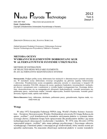 Nauka Przyroda Technologie ISSN 1897-7820 http://www.npt.up-poznan.net 2012 Tom 6 Zeszyt 3 Dział: Zootechnika Copyright ©Wydawnictwo Uniwersytetu Przyrodniczego w Poznaniu ZBIGNIEW DOMAGALSKI, JOANNA SOBCZAK Zakład Inżynierii Produkcji Zwierzęcej i Dobrostanu Zwierząt Instytut Technologiczno-Przyrodniczy Oddział w Poznaniu METODA OCENY WYBRANYCH ELEMENTÓW DOBROSTANU KUR W ALTERNATYWNYM SYSTEMIE UTRZYMANIA METHOD OF ESTIMATION OF SELECTED HENS WELFARE ELEMENTS IN AN ALTERNATIVE MAINTENANCE SYSTEM Streszczenie. Podjęto próbę oceny dobrostanu kur nieśnych w alternatywnym systemie utrzymania. W metodach oceny dobrostanu zwierząt uwzględnia się głównie aspekty behawioralne i zdrowotne. Przedstawiona ocena uwzględnia zalecenia zawarte w stosowanej w krajach UE punktowej metodzie TGI-200, służącej do oceny zgodności budynków inwentarskich i technologii chowu z przepisami oraz z ustalonymi w wyniku badań wymaganiami kur. Oceniając dobrostan, skoncentrowano się na następujących obszarach funkcjonalnych: warunki poruszania się, pobieranie paszy, zachowania stadne, warunki odpoczynku, komfort bytowania, warunki gniazdowania, higiena stada, opieka nad stadem. Słowa kluczowe: kury, dobrostan, dziobanie, pobieranie paszy, gniazdowanie, higiena stada, wysiadywanie jaj Wstęp W roku 1972 Europejska Federacja WPSA (ang. World’s Poultry Science Association – Światowe Stowarzyszenie Wiedzy Drobiarskiej) utworzyła IX Grupę Roboczą do spraw „welfare”, czyli komfortowych warunków utrzymania ptaków w systemie intensywnego chowu. Zadaniem Grupy było opracowanie dla producentów drobiu i jaj norm technologicznych dotyczących wychowalni i kurników. W 1976 roku HUGHES (1976) wprowadził pojęcie „welfare” jako stanu pełnego psychicznego i fizycznego zdrowia, wynikającego z harmonii ptaka z otaczającym go środowiskiem, który można ocenić po sposobie zachowania. Na znaczenie obserwacji zachowań ptaków w ocenie warunków 2 Domagalski Z., Sobczak J., 2012. Metoda oceny wybranych elementów dobrostanu kur w alternatywnym systemie utrzymania. Nauka Przyr. Technol. 6, 3, #40. bytowania zwrócił uwagę DUNCAN (1980), sugerując, że w przypadku możliwości swobodnego wyboru ptaki zawsze wybiorą optymalne środowisko, a wszelkie odmienne od normalnego lub niewłaściwe zachowania świadczą o pogorszeniu się warunków chowu i o stresie. Producenci powinni brać pod uwagę odmienności zachowań kur w stosunku do typowych zachowań ptaków. Kury są ptakami wymagającymi przestrzeni – potrzebują miejsca na składanie jaj (gniazda) i swobodnego dostępu do paszy i wody. Naturalna potrzeba przestrzeni znalazła też wyraz w normach Unii Europejskiej, które dopuszczają maksymalną obsadę do 9 kur na 1 m2 na powierzchni użytkowej w kurnikach z chowem alternatywnym. Obserwacje kur wykazują wiele istotnych i typowych zachowań, kształtujących się jeszcze w okresie pisklęcym, dlatego istotne jest, aby nie wprowadzać do stada z ustaloną już hierarchią nowych osobników, gdyż w znacznym stopniu wzmaga to walki o przywództwo w stadzie. W trakcie przeprowadzonych badań stwierdzono potrzebę dokładnej oceny rozwiązań technicznych i technologicznych, reakcji behawioralnych oraz stanu zdrowia, tj. czynników mających wpływ na dobrostan ptaków. Stanowisko badawcze stanowił kojec o powierzchni użytkowej 36 m2, wyposażony zgodnie zasadami przestrzennego chowu alternatywnego, w którym wszystkie zabiegi technologiczne zostały zmechanizowane i zautomatyzowane (rys. 1). W stanowisku na podłożu z rusztu metalowego umieszczono 270 młodych kurek nieśnych (rys. 2). Ptaki miały do dyspozycji 6 m2 korytarza ze żwirem, służącego jako grzebielisko. Ptaki ży- Rys. 1. Widok ogólny stanowiska badawczego: 1 – ruszt siatkowy, 2 – przestrzeń pielęgnacyjna wypełniona żwirkiem, 3 – kanał nawozowy, 4 – zgarniak pomiotu, 5 – przenośnik do jaj, 6 – gniazda, 7 – kierunki przepływu powietrza, 8 – grzędy, 9 – karmidła, 10 – poidła Fig. 1. Research station, general view: 1 – mesh grill, 2 – nursing space filled up with grit, 3 – fertilizer channel, 4 – manure scraper, 5 – transporter to eggs, 6 – nests, 7 – directions of the air flow, 8 – roosts, 9 – feeders, 10 – drinkers 3 Domagalski Z., Sobczak J., 2012. Metoda oceny wybranych elementów dobrostanu kur w alternatywnym systemie utrzymania. Nauka Przyr. Technol. 6, 3, #40. Rys. 2. Elementy stanowiska badawczego: 1 – gniazda, 2 – naskocznie, 3 – grzędy, 4 – przewód paszowy przenośnika linowo-krążkowego, 5 – lampa systemu oświetleniowego Fig. 2. Elements of research station: 1 – nesting, 2 – roost places for jumping, 3 – roosts, 4 – feed wire of rope-pulley conveyor, 5 – lamp of lighting system wiono pełnoporcjową granulowaną mieszanką paszową. Stanowisko ogrzewane przez nadmuch ciepłego powietrza miało sztuczne oświetlenie ze sterowaną długością dnia świetlnego. Wymiana powietrza odbywała się grawitacyjnie, kominem wentylacyjnym z ciepłowodami. Metoda Dla oceny dobrostanu kur opracowano metodykę badań, uwzględniając wzorcowe zalecenia zawarte w stosowanej w krajach UE punktowej metodzie TGI-200 (SUNDRUM i IN. 1994), służącej do oceny zgodności technologii chowu z przepisami. Korzystając ze zmodyfikowanej metodyki, przeprowadzono badania w celu określenia wskaźnika dobrostanu dla niosek (DN). Obszary funkcjonalne oceniono, przyznając odpowiednią liczbę punktów w zależności od stopnia spełnienia określonych ośmiu kryteriów: – warunków poruszania się, – pobierania paszy, – zachowań stadnych, – warunków odpoczynku, – komfortu bytowania, – warunków gniazdowania, – higieny stada, – opieki nad stadem. Osiem kryteriów oceniano według tabel 1-8, uwzględniających istotne dla dobrostanu kur czynniki technologiczne. 4 Domagalski Z., Sobczak J., 2012. Metoda oceny wybranych elementów dobros