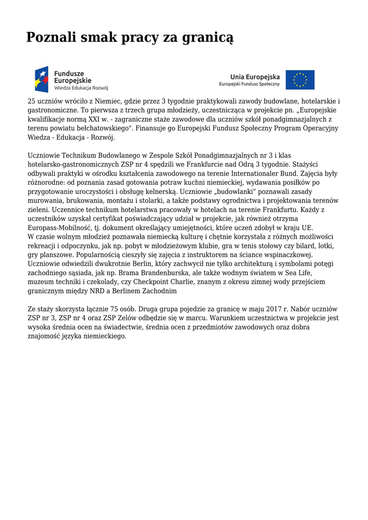 Poznali smak pracy za granicą 25 uczniów wróciło z Niemiec, gdzie przez 3 tygodnie praktykowali zawody budowlane, hotelarskie i gastronomiczne. To pierwsza z trzech grupa młodzieży, uczestnicząca w projekcie pn. „Europejskie kwalifikacje normą XXI w. - zagraniczne staże zawodowe dla uczniów szkół ponadgimnazjalnych z terenu powiatu bełchatowskiego". Finansuje go Europejski Fundusz Społeczny Program Operacyjny Wiedza - Edukacja - Rozwój. Uczniowie Technikum Budowlanego w Zespole Szkół Ponadgimnazjalnych nr 3 i klas hotelarsko-gastronomicznych ZSP nr 4 spędzili we Frankfurcie nad Odrą 3 tygodnie. Stażyści odbywali praktyki w ośrodku kształcenia zawodowego na terenie Internationaler Bund. Zajęcia były różnorodne: od poznania zasad gotowania potraw kuchni niemieckiej, wydawania posiłków po przygotowanie uroczystości i obsługę kelnerską. Uczniowie „budowlanki” poznawali zasady murowania, brukowania, montażu i stolarki, a także podstawy ogrodnictwa i projektowania terenów zieleni. Uczennice technikum hotelarstwa pracowały w hotelach na terenie Frankfurtu. Każdy z uczestników uzyskał certyfikat poświadczający udział w projekcie, jak również otrzyma Europass-Mobilność, tj. dokument określający umiejętności, które uczeń zdobył w kraju UE. W czasie wolnym młodzież poznawała niemiecką kulturę i chętnie korzystała z różnych możliwości rekreacji i odpoczynku, jak np. pobyt w młodzieżowym klubie, gra w tenis stołowy czy bilard, lotki, gry planszowe. Popularnością cieszyły się zajęcia z instruktorem na ściance wspinaczkowej. Uczniowie odwiedzili dwukrotnie Berlin, który zachwycił nie tylko architekturą i symbolami potęgi zachodniego sąsiada, jak np. Brama Brandenburska, ale także wodnym światem w Sea Life, muzeum techniki i czekolady, czy Checkpoint Charlie, znanym z okresu zimnej wody przejściem granicznym między NRD a Berlinem Zachodnim Ze staży skorzysta łącznie 75 osób. Druga grupa pojedzie za granicę w maju 2017 r. Nabór uczniów ZSP nr 3, ZSP nr 4 oraz ZSP Zelów odbędzie się w marcu. Warunkiem uczestnictwa w projekcie jest wysoka średnia ocen na świadectwie, średnia ocen z przedmiotów zawodowych oraz dobra znajomość języka niemieckiego.