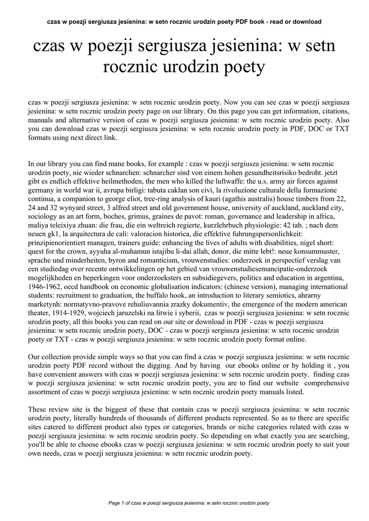 czas w poezji sergiusza jesienina: w setn rocznic urodzin poety PDF book - read or download czas w poezji sergiusza jesienina: w setn rocznic urodzin poety czas w poezji sergiusza jesienina: w setn rocznic urodzin poety. Now you can see czas w poezji sergiusza jesienina: w setn rocznic urodzin poety page on our library. On this page you can get information, citations, manuals and alternative version of czas w poezji sergiusza jesienina: w setn rocznic urodzin poety. Also you can download czas w poezji sergiusza jesienina: w setn rocznic urodzin poety in PDF, DOC or TXT formats using next direct link. In our library you can find mane books, for example : czas w poezji sergiusza jesienina: w setn rocznic urodzin poety, nie wieder schnarchen: schnarcher sind von einem hohen gesundheitsrisiko bedroht. jetzt gibt es endlich effektive heilmethoden, the men who killed the luftwaffe: the u.s. army air forces against germany in world war ii, avrupa birligi: tabuta caklan son civi, la rivoluzione culturale della formazione continua, a companion to george eliot, tree-ring analysis of kauri (agathis australis) house timbers from 22, 24 and 32 wynyard street, 3 alfred street and old government house, university of auckland, auckland city, sociology as an art form, boches, grimus, graines de pavot: roman, governance and leadership in africa, maliya teleixiya zhuan: die frau, die ein weltreich regierte, kurzlehrbuch physiologie: 42 tab. ; nach dem neuen gk1, la arquitectura de cali: valoracion historica, die effektive fuhrungspersonlichkeit: prinzipienorientiert managen, trainers guide: enhancing the lives of adults with disabilities, nigel short: quest for the crown, ayyuha al-muhamun istajibu li-dai allah, donor, die mitte lebt!: neue konsummuster, sprache und minderheiten, byron and romanticism, vrouwenstudies: onderzoek in perspectief verslag van een studiedag over recente ontwikkelingen op het gebied van vrouwenstudiesemancipatie-onderzoek mogelijkheden en beperkingen voor onderzoeksters en subsidiegevers, politics and education in argentina, 1946-1962, oecd handbook on economic globalisation indicators: (chinese version), managing international students: recruitment to graduation, the buffalo hook, an introduction to literary semiotics, ahrarny marketynh: normatyvno-pravove rehuliuvannia zrazky dokumentiv, the emergence of the modern american theater, 1914-1929, wojciech jaruzelski na litwie i syberii, czas w poezji sergiusza jesienina: w setn rocznic urodzin poety, all this books you can read on our site or download in PDF - czas w poezji sergiusza jesienina: w setn rocznic urodzin poety, DOC - czas w poezji sergiusza jesienina: w setn rocznic urodzin poety or TXT - czas w poezji sergiusza jesienina: w setn rocznic urodzin poety format online. Our collection provide simple ways so that you can find a czas w poezji sergiusza jesienina: w setn rocznic urodzin poety PDF record without the digging. And by having our ebooks online or by holding it , you have convenient answers with czas w poezji sergiusza jesienina: w setn rocznic urodzin poety. finding czas w poezji sergiusza jesienina: w setn rocznic urodzin poety, you are to find our website comprehensive assortment of czas w poezji sergiusza jesienina: w setn rocznic urodzin poety manuals listed. These review site is the biggest of these that contain czas w poezji sergiusza jesienina: w setn rocznic urodzin poety, literally hundreds of thousands of different products represented. So as to there are specific sites catered to different product also types or categories, brands or niche categories related with czas w poezji sergiusza jesienina: w setn rocznic urodzin poety. So depending on what exactly you are searching, you'll be able to choose ebooks czas w poezji sergiusza jesienina: w setn rocznic urodzin poety to suit your own needs, czas w poezji sergiusza jesienina: w setn rocznic urodzin poety. Page 1 of czas w poezji sergiusza jesienina: w setn rocznic urodzin poety