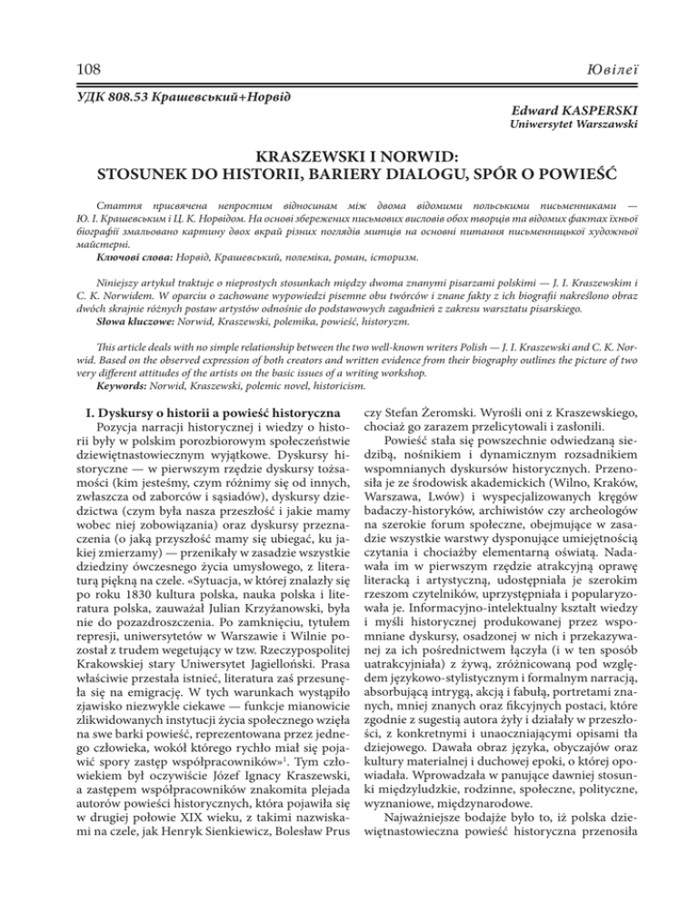 108 УДК 808.53 Крашевський+Норвід Ювілеї Edward KASPERSKI Uniwersytet Warszawski KRASZEWSKI I NORWID: STOSUNEK DO HISTORII, BARIERY DIALOGU, SPÓR O POWIEŚĆ Стаття присвячена непростим відносинам між двома відомими польськими письменниками — Ю. І. Крашевським і Ц. K. Норвідом. На основі збережених письмових висловів обох творців та відомих фактах їхньої біографії змальовано картину двох вкрай різних поглядів митців на основні питання письменницької художньої майстерні. Ключові слова: Норвід, Крашевський, полеміка, роман, історизм. Niniejszy artykuł traktuje o nieprostych stosunkach między dwoma znanymi pisarzami polskimi — J. I. Kraszewskim i C. K. Norwidem. W oparciu o zachowane wypowiedzi pisemne obu twórców i znane fakty z ich biografii nakreślono obraz dwóch skrajnie różnych postaw artystów odnośnie do podstawowych zagadnień z zakresu warsztatu pisarskiego. Słowa kluczowe: Norwid, Kraszewski, polemika, powieść, historyzm. This article deals with no simple relationship between the two well-known writers Polish — J. I. Kraszewski and C. K. Norwid. Based on the observed expression of both creators and written evidence from their biography outlines the picture of two very different attitudes of the artists on the basic issues of a writing workshop. Keywords: Norwid, Kraszewski, polemic novel, historicism. I. Dyskursy o historii a powieść historyczna Pozycja narracji historycznej i wiedzy o historii były w polskim porozbiorowym społeczeństwie dziewiętnastowiecznym wyjątkowe. Dyskursy historyczne — w pierwszym rzędzie dyskursy tożsamości (kim jesteśmy, czym różnimy się od innych, zwłaszcza od zaborców i sąsiadów), dyskursy dziedzictwa (czym była nasza przeszłość i jakie mamy wobec niej zobowiązania) oraz dyskursy przeznaczenia (o jaką przyszłość mamy się ubiegać, ku jakiej zmierzamy) — przenikały w zasadzie wszystkie dziedziny ówczesnego życia umysłowego, z literaturą piękną na czele. «Sytuacja, w której znalazły się po roku 1830 kultura polska, nauka polska i literatura polska, zauważał Julian Krzyżanowski, była nie do pozazdroszczenia. Po zamknięciu, tytułem represji, uniwersytetów w Warszawie i Wilnie pozostał z trudem wegetujący w tzw. Rzeczypospolitej Krakowskiej stary Uniwersytet Jagielloński. Prasa właściwie przestała istnieć, literatura zaś przesunęła się na emigrację. W tych warunkach wystąpiło zjawisko niezwykle ciekawe — funkcje mianowicie zlikwidowanych instytucji życia społecznego wzięła na swe barki powieść, reprezentowana przez jednego człowieka, wokół którego rychło miał się pojawić spory zastęp współpracowników»1. Tym człowiekiem był oczywiście Józef Ignacy Kraszewski, a zastępem współpracowników znakomita plejada autorów powieści historycznych, która pojawiła się w drugiej połowie XIX wieku, z takimi nazwiskami na czele, jak Henryk Sienkiewicz, Bolesław Prus czy Stefan Żeromski. Wyrośli oni z Kraszewskiego, chociaż go zarazem przelicytowali i zasłonili. Powieść stała się powszechnie odwiedzaną siedzibą, nośnikiem i dynamicznym rozsadnikiem wspomnianych dyskursów historycznych. Przenosiła je ze środowisk akademickich (Wilno, Kraków, Warszawa, Lwów) i wyspecjalizowanych kręgów badaczy-historyków, archiwistów czy archeologów na szerokie forum społeczne, obejmujące w zasadzie wszystkie warstwy dysponujące umiejętnością czytania i chociażby elementarną oświatą. Nadawała im w pierwszym rzędzie atrakcyjną oprawę literacką i artystyczną, udostępniała je szerokim rzeszom czytelników, uprzystępniała i popularyzowała je. Informacyjno-intelektualny kształt wiedzy i myśli historycznej produkowanej przez wspomniane dyskursy, osadzonej w nich i przekazywanej za ich pośrednictwem łączyła (i w ten sposób uatrakcyjniała) z żywą, zróżnicowaną pod względem językowo-stylistycznym i formalnym narracją, absorbującą intrygą, akcją i fabułą, portretami znanych, mniej znanych oraz fikcyjnych postaci, które zgodnie z sugestią autora żyły i działały w przeszłości, z konkretnymi i unaoczniającymi opisami tła dziejowego. Dawała obraz języka, obyczajów oraz kultury materialnej i duchowej epoki, o której opowiadała. Wprowadzała w panujące dawniej stosunki międzyludzkie, rodzinne, społeczne, polityczne, wyznaniowe, międzynarodowe. Najważniejsze bodajże było to, iż polska dziewiętnastowieczna powieść historyczna przenosiła Київські полоністичні студії. ТОМ XХІІ mniej czy bardziej odległą przeszłość — w pierwszym rzędzie historię Polski — w krąg aktualnej świadomości społecznej. Czyniła jej żywym składnikiem płynnej i zmieniającej się teraźniejszości. Powodowała, iż pamięć historyczna stawała się aktywnym spoiwem świadomości narodowej. Integrowała tę świadomość na wielu płaszczyznach i na wiele sposobów: intelektualnie, emocjonalnie i moralnie. Scalała ją ponad terytorialnymi kordonami państw zaborczych i na przekór istniejącemu rozbiciu oraz rozproszeniu ówczesnego polskiego społeczeństwa. Przełamywała alienujące podziały, wynikające z utraty bytu państwowego i politycznego i z parcelacji między trzech — nierzadko skłóconych i wojujących ze sobą — zaborców. Największym zagrożeniem było to, iż różne części społeczeństwa polskiego uczestniczyły w całkowicie odmiennych organizmach politycznych, prawnych, administracyjnych, edukacyjnych i językowych oraz że poddawano je polityce asymilacyjnej i wynaradawiającej. Powieść i refleksja historyczna — zwł