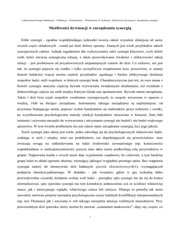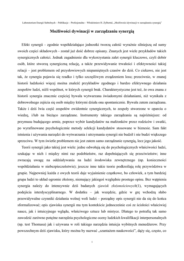 Laboratorium Energii Subtelnych – Publikacje – Profesjonalne – Włodzimierz H. Zylbertal, „Możliwości dywinacji w zarządzaniu synergią” Możliwości dywinacji w zarządzaniu synergią Efekt synergii - zgodnie współdziałające jednostki tworzą całość wyraźnie silniejszą od sumy swoich części składowych - został już dość dobrze opisany. Znanych jest wiele przykładów takich synergicznych całości. Jednak zagadnienie dla wykorzystania zalet synergii kluczowe, czyli dobór osób, które stworzą synergiczną relację, a także przewidywanie trwałości i efektywności takiej relacji – jest problemem od przysłowiowych niepamiętnych czasów do dziś. Co ciekawe, nie jest tak, że synergia pojawia się rzadko i tylko szczęśliwym zrządzeniem losu; przeciwnie, w znanej historii ludzkości więcej można znaleźć przykładów zgodnego i bardzo efektywnego działania zespołów ludzi, niźli wspólnot, w których synergii brak. Charakterystyczne jest też, że owa znana z historii synergia znacznie częściej bywała wytwarzana świadomymi działaniami, niż wynikała z dobrowolnego zejścia się osób między którymi działa ona spontanicznie. Bywała zatem zarządzana. Także i dziś lwia część zespołów ewidentnie synergicznych, to zespoły stworzone w oparciu o wiedzę, i/lub na bieżąco zarządzane. Instrumenty takiego zarządzania są najróżniejsze: od przymusu budującego armie, poprzez wybór kandydatów na małżonków przez rodziców i swatki, po wyrafinowane psychologicznie metody selekcji kandydatów stosowane w biznesie. Sam fakt istnienia i używania narzędzi do wytwarzania i utrzymania synergii nie budził i nie budzi większego sprzeciwu. W tym świetle problemem nie jest zatem samo zarządzanie synergią, lecz jego jakość. Teorii synergii jako takiej jest wiele: jedne odwołują się do psychologicznych właściwości ludzi, szukając w nich i między nimi raz podobieństw, raz dopełniających się przeciwieństw; inne zwracają uwagę na oddziaływania na ludzi środowiska zewnętrznego (np. konieczności współdziałania w niebezpieczeństwie); jeszcze inne takie teorie podkreślają rolę przywództwa w grupie. Najpewniej każda z owych teorii daje wyjaśnienie cząstkowe, bo człowiek, a tym bardziej grupa ludzi to układ ogromie złożony, niemający jakiegoś względnie prostego opisu. Bez wątpienia synergia należy do intensywnie dziś badanych zjawisk złożonościowych(1), wymagających podejścia interdyscyplinarnego. W dodatku – jak wszędzie, gdzie w grę wchodzą słabo przewidywalne czynniki działania wolnej woli ludzi – porządny opis synergii nie da się do końca sformalizować; opis zjawiska synergii ma tym kontekście jednocześnie coś ze ścisłości właściwiej nauce, jak i intuicyjnego wglądu, właściwego sztuce lub mistyce. Dlatego to potrafią tak samo zawodzić zarówno potężne narzędzia psychologiczne oceny ludzkich kwalifikacji interpersonalnych (np. test Thomasa) jak i używana w roli takiego narzędzia intuicja wybitnych menedżerow. Przy powszechnym dziś zjawisku, który można by nazwać „szantażem naukowości”, dąży się, często, co 1 Laboratorium Energii Subtelnych – Publikacje – Profesjonalne – Włodzimierz H. Zylbertal, „Możliwości dywinacji w zarządzaniu synergią” tu ukrywać beznadziejnie, do jak najściślejszego określania coraz mniej znaczących elementów osobowości i ich wpływu na zdolności synergiczne. Ruguje się jednocześnie (przynajmniej oficjalnie) wszelkie czynniki nieracjonalne, choćby takie jak intuicja. Co uczciwsi przedstawiciele nauki przyznają w konferencyjnych kuluarach, że nie da się opisać człowieka i jego społecznych interakcji tylko w kategoriach redukcjonistycznych, dziś uznawanych za „racjonalne” - ale w słyszanych poza kuluarami referatach prawie tego nie ma. Rozbudowuje się narzędzia psychologiczne, przede wszystkim wszelkiego rodzaju testy, coraz lepiej rozszyfrowuje algorytmy rządzące zachowaniami podświadomymi (np. mową ciała). Jednak metody te, choć dobrze diagnozują kondycję człowieka w chwili badania, nie umożliwiają prognozowania zachowań ludzi w dłuższym horyzoncie czasowym. A przecież to kwestia dla sprawnego działania kluczowa! Prognozowanie długoterminowe wymaga brania pod uwagę czynników w dzisiejszej psychologii zazwyczaj nie istniejących. Mówimy „zazwyczaj”, bo byli i są psycholodzy usiłujący wyjść poza te schematy – ale ich dokonania funkcjonują poza głównym nurtem świadomości społecznej (2). Poprawne prognozowanie wymaga też rozumienia człowieka, które moglibyśmy nazwać ekologicznym, nakazującego widzieć jednostkę jako integralną część szeroko pojętych środowisk – przyrodniczego, społecznego, kulturowego, technicznego, a nawet kosmicznego. Z tym ostatnim wiąże się kontrowersyjne, a przez oficjalną naukę przeważnie piętnowane zagadnienie roli jednostki w porządku Wszechświata, w popularnych wyobrażeniach rozumiane jako karma, przeznaczenie, etc. Obecnie w zastosowaniach profesjonalnych na użytek HR, prognoza zachowań ludzi i stworzonych z nich zespołów jest oficjalnie pomijana, a nieoficjalnie robiona... intuicyjnie, o czym wie każdy jako-tako doświadczony decydent. Tymczasem rozwiązanie tej kwadratury koła istnieje, jest w zasięgu ręki, jednak z przyczyn, przyznajmy to szczerze, bardziej ideologicznych niż merytorycznych, nie jest powszechne. Rozwiązaniem takim jest użycie do oceny synergii i jej rozwoju w czasie - diagnozy dywinacyjnej. Wbrew tyleż powszechnym co bałamutnym mniemaniom, dywinacja (wróżbiarstwo) to nie tylko „wróżenie przyszłości” – to także (a może przede wszystkim?) zbiór najstarszych i do dziś użytecznych modeli psychologicznych człowieka. W dodatku modeli od razu uwzględniających omówioną przed chwilą dwutorowość poznania ludzkiej psyche – bo w dywinację zarówno systemow