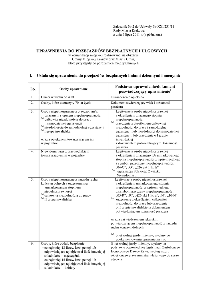 0b8003a4-f932-4f24-972c-f88cf1e8b085 Załącznik Nr 2 do Uchwały Nr XXI/231/11 Rady Miasta Krakowa z dnia 6 lipca 2011 r. (z późn. zm.) UPRAWNIENIA DO PRZEJAZDÓW BEZPŁATNYCH I ULGOWYCH w komunikacji miejskiej realizowanej na obszarze Gminy Miejskiej Kraków oraz Miast i Gmin, które przystąpiły do porozumień międzygminnych I. Lp. Ustala się uprawnienia do przejazdów bezpłatnych liniami dziennymi i nocnymi: Podstawa uprawnienia/dokument poświadczający uprawnienie1 Osoby uprawnione 1. Dzieci w wieku do 4 lat Oświadczenie opiekuna 2. Osoby, które ukończyły 70 lat życia 3. Osoby niepełnosprawne z orzeczonym/ą: znacznym stopniem niepełnosprawności lub całkowitą niezdolnością do pracy i samodzielnej egzystencji lub niezdolnością do samodzielnej egzystencji lub I grupą inwalidzką Dokument stwierdzający wiek i tożsamość pasażera Legitymacja osoby niepełnosprawnej z określeniem znacznego stopnia niepełnosprawności lub orzeczenie z określeniem całkowitej niezdolności do pracy i samodzielnej egzystencji lub niezdolności do samodzielnej egzystencji lub orzeczenie o I grupie inwalidzkiej z dokumentem potwierdzającym tożsamość pasażera Legitymacja osoby niepełnosprawnej z określeniem znacznego lub umiarkowanego stopnia niepełnosprawności z wpisem jednego z symboli przyczyny niepełnosprawności: „04-O”, „O”, „§26 pkt 1 lit. h” lub legitymacja Polskiego Związku Niewidomych Legitymacja osoby niepełnosprawnej z określeniem umiarkowanego stopnia niepełnosprawności z wpisem jednego z symboli przyczyny niepełnosprawności: „05-R”, „R”, „§26 pkt 1 lit. a”, „N”, „10-N” lub orzeczenie z określeniem całkowitej niezdolności do pracy lub orzeczenie o II grupie inwalidzkiej z dokumentem potwierdzającym tożsamość pasażera wraz z opiekunem towarzyszącym im w pojeździe 4. Niewidomi wraz z przewodnikiem towarzyszącym im w pojeździe 5. Osoby niepełnosprawne z narządu ruchu kończyn dolnych z orzeczonym/ą: umiarkowanym stopniem niepełnosprawności lub całkowitą niezdolnością do pracy lub II grupą inwalidzką wraz z zaświadczeniem lekarskim potwierdzającym niepełnosprawność z narządu ruchu kończyn dolnych lub 6. Osoby, które oddały bezpłatnie: − co najmniej 18 litrów krwi pełnej lub odpowiadającą tej objętości ilość innych jej składników – mężczyźni, − co najmniej 15 litrów krwi pełnej lub odpowiadającą tej objętości ilość innych jej składników – kobiety bilet wolnej jazdy imienny, wydany po udokumentowaniu uprawnienia j.w. Bilet wolnej jazdy imienny, wydany na podstawie odpowiedniej legitymacji Zasłużonego Honorowego Dawcy Krwi, według wzoru określonego przez ministra właściwego do spraw zdrowia 0b8003a4-f932-4f24-972c-f88cf1e8b085 7. Dzieci nie słyszące do 16 roku życia wraz z opiekunem towarzyszącym im w pojeździe 8. Osoby niepełnosprawne z upośledzeniem umysłowym z orzeczonym umiarkowanym stopniem niepełnosprawności 9. Dzieci do 16 roku życia niepełnosprawne z powodu upośledzenia umysłowego, lub schorzeń narządu wzroku, lub schorzeń narządu ruchu 10. 11. 12. 13. 14. wraz z opiekunem towarzyszącym im w pojeździe Dzieci niepełnosprawne uczęszczające do oddziałów przedszkolnych w szkołach podstawowych lub przedszkolach oraz uczniowie o specjalnych potrzebach edukacyjnych uczęszczający do szkół podstawowych, gimnazjalnych, ponadgimnazjalnych i policealnych wraz z opiekunem, który podróżuje: - z uprawnionym, po uprawnionego lub po odwiezieniu uprawnionego - wyłącznie na trasie od miejsca zamieszkania do placówki oświatowej i z powrotem Pracownicy Miejskiego Przedsiębiorstwa Komunikacyjnego S.A. w Krakowie Dzieci i młodzież z rodzin wielodzietnych zamieszkujących na stałe w obszarze objętym integracją międzygminną lub odprowadzających podatek dochodowy do Urzędu Skarbowego na terenie Miasta Krakowa, w których jest czworo i więcej dzieci: - dzieci po ukończeniu 4 lat do czasu rozpoczęcia obowiązku szkolnego, - uczniowie i studenci do ukończenia 24 roku życia. Ukończenie 24 roku życia lub zmiana zamieszkania przez dzieci starsze nie pozbawia młodszych dzieci nabytych uprawnień. Obywatele polscy poszkodowani przez III Rzeszę będący zwyczajnymi członkami Stowarzyszenia Polaków Poszkodowanych przez III Rzeszę - wychowankowie rodzinnych domów dziecka oraz placówek opiekuńczowychowawczych typu rodzinnego, wraz z osobami prowadzącymi i ich dziećmi, - wychowankowie placówek opiekuńczowychowawczych - dzieci z wielodzietnych zawodowych Legitymacja osoby niepełnosprawnej z wpisem jednego z symboli przyczyny niepełnosprawności: „03-L”, „L”, „§26 pkt 1 lit. i” wraz z zaświadczeniem lekarskim potwierdzającym zaburzenia słuchu lub bilet wolnej jazdy imienny, wydany po udokumentowaniu uprawnienia j.w. Legitymacja osoby niepełnosprawnej z określeniem umiarkowanego stopnia niepełnosprawności z wpisem jednego z symboli przyczyny niepełnosprawności: „01-U”, „U”, „§26 pkt 1 lit. c” Legitymacja osoby niepełnosprawnej z wpisem jednego z symboli przyczyny niepełnosprawności: -„01-U”, „U”, „§26 pkt 1 lit. c”; -„04-O”, „O”, „§26 pkt 1 lit. h”; -„05-R”, „R”, „§26 pkt 1 lit. a” Dla uprawnionego ważna legitymacja wydana według wzoru określonego przez ministra właściwego do spraw oświaty i wychowania, a dla opiekuna zaświadczenie wydane przez placówkę oświatową określające trasę przejazdu Legitymacja pracownicza MPK S.A. Dla ucznia lub studenta: Ważna Krakowska Karta Rodzinna 4+ wraz z ważną legitymacją szkolną lub ważną legitymacją studencką lub bilet wolnej jazdy imienny - dotyczy osób z obszaru objętego integracją międzygminną nie uprawnionych do uzyskania KKR 4+ Dla dziecka: Bilet wolnej jazdy imienny Legitymacja Stowarzyszenia z dowodem tożsamości Bilet wolnej jazdy imienny, wydany na okres całego roku 0b8003a4