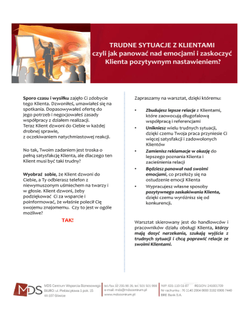 TRUDNE SYTUACJE Z KLIENTAMI czyli jak panować nad emocjami i zaskoczyć Klienta pozytywnym nastawieniem? Sporo czasu i wysiłku zajęło Ci zdobycie tego Klienta. Dzwoniłeś, umawiałeś się na spotkania. Dopasowywałeś ofertę do jego potrzeb i negocjowałeś zasady współpracy z działem realizacji. Teraz Klient dzwoni do Ciebie w każdej drobnej sprawie, z oczekiwaniem natychmiastowej reakcji. Zapraszamy na warsztat, dzięki któremu: No tak, Twoim zadaniem jest troska o pełną satysfakcję Klienta, ale dlaczego ten Klient musi być taki trudny? • • • • Wyobraź sobie, że Klient dzwoni do Ciebie, a Ty odbierasz telefon z niewymuszonym uśmiechem na twarzy i w głosie. Klient dzwoni, żeby podziękować Ci za wsparcie i poinformować, że właśnie polecił Cię swojemu znajomemu. Czy to jest w ogóle możliwe? TAK! • Zbudujesz lepsze relacje z Klientami, które zaowocują długofalową współpracą i referencjami Unikniesz wielu trudnych sytuacji, dzięki czemu Twoja praca przyniesie Ci więcej satysfakcji i zadowolonych Klientów Zamienisz reklamacje w okazję do lepszego poznania Klienta i zacieśnienia relacji Będziesz panował nad swoimi emocjami, co przełoży się na ostudzenie emocji Klienta Wypracujesz własne sposoby pozytywnego zaskakiwania Klienta, dzięki czemu wyróżnisz się od konkurencji. Warsztat skierowany jest do handlowców i pracowników działu obsługi Klienta, którzy mają dosyć narzekania, szukają wyjścia z trudnych sytuacji i chcą poprawić relacje ze swoimi Klientami. TRUDNE SYTUACJE Z KLIENTAMI czyli jak panować nad emocjami i zaskoczyć Klienta pozytywnym nastawieniem? PROGRAM SZKOLENIA: • • • • Trudny Klient – jakie zachowania powodują, że pojawiają się trudne sytuacje? – Klient trudny czy wymagający? – Czego nie należy robić? Pretensje, zażalenia i zastrzeżenia – Zastrzeżenia - kolejne etapy radzenia sobie z nimi, trzy rodzaje zażaleń i reakcji Klienta, jak je rozpoznać, dlaczego zażalenia są szansą? – Metody odpierania ataków i zarzutów, magiczne słowo "ale" czyli o metodzie warunkowej akceptacji Co to jest skarga i reklamacja? – Wykazywanie inicjatywy w reakcji na reklamację – Reagowanie w irytujących sytuacjach czyli co zrobić, kiedy nie możesz powiedzieć TAK - jak umiejętnie odpierać zarzuty, dlaczego i czy zawsze należy objaśniać elementy świadczonej usługi? Jak być elastycznym, uczynnym i skutecznym? – Jak sobie radzić z niezadowolonym Klientem, czy można odzyskać jego zaufanie? – Jeśli Klient jest wściekły, czy można go uspokoić? - Strategie postępowania – Słowa, których nie powinien mówić pracownik działu obsługi Klienta • • • • Zasady asertywnego zachowania podczas rozmowy i nie tylko – Jak odmówić Klientowi, żeby nie poczuł się urażony? Jak asertywnie prosić? – Sposoby reagowania na krytykę Typy osobowości – Trudne zachowania Klientów a typy osobowości – Wskazówki jak rozmawiać przez telefon z poszczególnymi typami osobowości Trudne zachowania Klientów i sposób radzenia sobie z nimi Etapy radzenia sobie z trudnymi Klientami – Jak umiejętnie stawiać granice? – Utrzymywanie równowagi emocjonalnej. TRUDNE SYTUACJE Z KLIENTAMI czyli jak panować nad emocjami i zaskoczyć Klienta pozytywnym nastawieniem? Czas trwania szkolenia: 2 dni, 16 godzin zajęć, Godziny zajęć: 9:00-17:00 Termin: do ustalenia. Miejsce: Do ustalenia. Prowadzący: Trener z wieloletnim doświadczeniem – z zawodu menedżer, finansista i handlowiec. Specjalizuje się w rozwoju umiejętności sprzedażowych, negocjacyjnych, komunikacyjnych i kompetencji menedżerskich. Cena szkolenia: do ustalenia. Cena obejmuje: • analizę potrzeb szkoleniowych • materiały szkoleniowe dla uczestnika • przerwy kawowe, lunch • zaświadczenie o ukończeniu szkolenia Uwaga: Minimalna ilość uczestników wynosi 10 osób. W przypadku mniejszej liczby zgłoszonych osób, organizator podejmie decyzję o realizacji szkolenia lub przeniesieniu na inny termin.