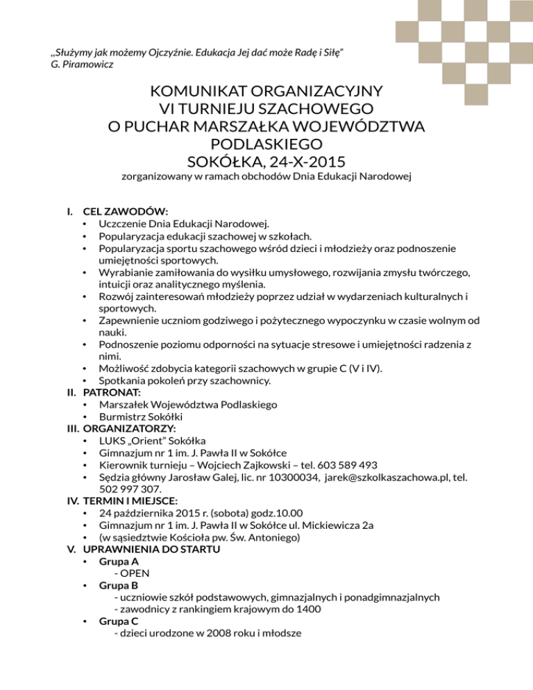 ,,Służymy jak możemy Ojczyźnie. Edukacja Jej dać może Radę i Siłę” G. Piramowicz KOMUNIKAT ORGANIZACYJNY VI TURNIEJU SZACHOWEGO O PUCHAR MARSZAŁKA WOJEWÓDZTWA PODLASKIEGO SOKÓŁKA, 24-X-2015 zorganizowany w ramach obchodów Dnia Edukacji Narodowej I. CEL ZAWODÓW: • Uczczenie Dnia Edukacji Narodowej. • Popularyzacja edukacji szachowej w szkołach. • Popularyzacja sportu szachowego wśród dzieci i młodzieży oraz podnoszenie umiejętności sportowych. • Wyrabianie zamiłowania do wysiłku umysłowego, rozwijania zmysłu twórczego, intuicji oraz analitycznego myślenia. • Rozwój zainteresowań młodzieży poprzez udział w wydarzeniach kulturalnych i sportowych. • Zapewnienie uczniom godziwego i pożytecznego wypoczynku w czasie wolnym od nauki. • Podnoszenie poziomu odporności na sytuacje stresowe i umiejętności radzenia z nimi. • Możliwość zdobycia kategorii szachowych w grupie C (V i IV). • Spotkania pokoleń przy szachownicy. II. PATRONAT: • Marszałek Województwa Podlaskiego • Burmistrz Sokółki III. ORGANIZATORZY: • LUKS „Orient” Sokółka • Gimnazjum nr 1 im. J. Pawła II w Sokółce • Kierownik turnieju – Wojciech Zajkowski – tel. 603 589 493 • Sędzia główny Jarosław Galej, lic. nr 10300034, [email protected], tel. 502 997 307. IV. TERMIN I MIEJSCE: • 24 października 2015 r. (sobota) godz.10.00 • Gimnazjum nr 1 im. J. Pawła II w Sokółce ul. Mickiewicza 2a • (w sąsiedztwie Kościoła pw. Św. Antoniego) V. UPRAWNIENIA DO STARTU • Grupa A - OPEN • Grupa B - uczniowie szkół podstawowych, gimnazjalnych i ponadgimnazjalnych - zawodnicy z rankingiem krajowym do 1400 • Grupa C - dzieci urodzone w 2008 roku i młodsze VI. SYSTEM ROZGRYWEK, TEMPO GRY: • System szwajcarski • Grupa A i B – 9 rund; tempo gry po 10 minut na całą partię i dodatkowo po 5 sekund na każdy ruch od początku partii. • Grupy C – 7 rund, tempo gry po 20 minut na całą partię i dodatkowo po 10 sekund na każdy ruch od początku partii. VII. KRYTERIA PUNKTACJI POMOCNICZEJ: • średni Buchholtz • pełny Buchholtz • progresja VIII. NAGRODY: Grupa A ◦ puchary, medale za miejsca I-III ◦ dyplomy I-X ◦ nagrody pieniężne: za I miejsce 300 zł (wysokość kolejnych nagród zostanie podana po 2. rundzie) Grupa B ◦ za I miejsce puchar Marszałka Województwa Podlaskiego dla szkoły zwycięskiej w punktacji drużynowej (liczy się suma punktów 4 najlepszych zawodników w grupie B) ◦ puchary, medale za miejsca I-III w klasyfikacji indywidualnej, ◦ dyplomy I-X ◦ nagrody rzeczowe za miejsca I-VI (w klasyfikacji indywidualnej) Grupa C ◦ puchary, medale za miejsca I-III ◦ nagrody rzeczowe za zajęcie miejsc I-VI i upominki dla wszystkich zawodników Dodatkowo: ◦ dyplomy dla wszystkich uczestników ◦ nagroda specjalna dla najmłodszego zawodnika turnieju IX. ZGŁOSZENIA: • Zapisy na stronie http://www.chessarbiter.com/turnieje.php oraz bezpośrednio przed zawodami. • Termin zgłoszeń do godz. 9:30 w dniu turnieju. X. WPISOWE: • Turniej A, B, C – 20zł od każdego zawodnika • Zawodnicy z tytułami GM, IM, WGM, WIM zwolnieni z wpisowego XI. USTALENIA KOŃCOWE: • Obowiązują przepisy Kodeksu Szachowego PZSzach. z 1 lipca 2014 r. • Organizator zastrzega sobie prawo do niezbędnych zmian wynikających z jego potrzeb. • Prawo interpretacji niniejszego regulaminu należy do organizatorów i sędziego głównego, którego decyzje są ostateczne. • Organizator zastrzega sobie prawo przyznania dodatkowych nagród w dodatkowych kategoriach. • Organizator zastrzega możliwość dokonania zmian w regulaminie. • Opiekę nad nieletnimi zawodnikami sprawują rodzice i kluby delegujące zawodników. • Spóźnienie ponad 5 min. na rozpoczęcie partii skutkuje jej przegraniem. ORGANIZATOR: PATRONAT: PATRONI MEDIALNI: MIEJSCE TURNIEJU: