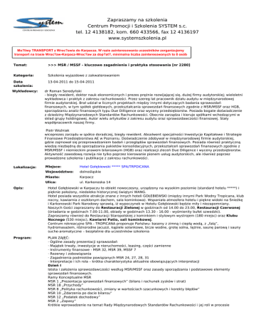 Zapraszamy na szkolenia Centrum Promocji i Szkolenia SYSTEM s.c. tel. 12 4138182, kom. 660 433566, fax 12 4136197 www.systemszkolenia.pl Mo?liwy TRANSPORT z Wroc?awia do Karpacza. W razie zainteresowania uczestników zorganizujemy transport na trasie Wroc?aw-Karpacz-Wroc?aw za dop?at?, minimalna liczba zainteresowanych to 8 osób Temat: >>> MSR / MSSF - kluczowe zagadnienia i praktyka stosowania [nr 2280] Kategoria: Szkolenia wyjazdowe z zakwaterowaniem Data szkolenia: 13-04-2011 do 15-04-2011 Wykładowcy: dr drRoman RomanSeredyński Seredyński - -biegły biegłyrewident, rewident,doktor doktornauk naukekonomicznych ekonomicznychi iprezes prezesprężnie prężnierozwijającej rozwijającejsię, się,dużej dużejfirmy firmyaudytorskiej; audytorskiej;wieloletni wieloletni wykładowca wykładowcai ipraktyk praktykzzzakresu zakresurachunkowości. rachunkowości.Przez Przezszereg szereglat latpracownik pracownikdziału działuaudytu audytuwwmiędzynarodowej międzynarodowej firmie firmieaudytorskiej. audytorskiej.Brał Brałudział udziałwwlicznych licznychprojektach projektachmiędzy międzyinnymi innymidotyczących dotyczącychbadania badaniasprawozdań sprawozdań finansowych, finansowych,wwtym tymspółek spółekgiełdowych, giełdowych,przekształcania przekształcaniasprawozdań sprawozdańfinansowych finansowychzgodnie zgodniezzMSR/MSSF MSR/MSSForaz orazHGB, HGB, sporządzaniu sporządzaniuanaliz analizfinansowych finansowychtypu typuDue DueDilligence Dilligenceoraz orazwyceny wycenyprzedsiębiorstw. przedsiębiorstw.Posiada Posiadabogate bogatedoświadczenie doświadczenie zzdziedziny dziedzinyMiędzynarodowych MiędzynarodowychStandardów StandardówRachunkowości. Rachunkowości.Obecnie Obecniezarządza zarządzai ikieruje kierujespółkami spółkamiwchodzącymi wchodzącymiww skład składgrupy grupyholdingowej. holdingowej.Autor Autorwielu wieluartykułów artykułówzzzakresu zakresuaudytu audytuoraz orazsprawozdawczości sprawozdawczościfinansowej. finansowej.Stały Stały współpracownik współpracowniknaszej naszejfirmy. firmy. Piotr PiotrWoźniak Woźniak wiceprezes wiceprezeszarządu zarząduwwspółce spółcedoradczej, doradczej,biegły biegłyrewident. rewident.Absolwent Absolwentspecjalności specjalnościInwestycje InwestycjeKapitałowe Kapitałowei iStrategie Strategie Finansowe FinansowePrzedsiębiorstwa PrzedsiębiorstwaAE AEwwPoznaniu. Poznaniu.Doświadczenie Doświadczeniezdobywał zdobywałwwmiędzynarodowej międzynarodowejfirmie firmieaudytorskiej, audytorskiej, gdzie gdziezajmował zajmowałsię sięprzeprowadzaniem przeprowadzaniembadań badańi iprzeglądów przeglądówsprawozdań sprawozdańfinansowych. finansowych.Posiada Posiadarównież równieżpraktyczną praktyczną wiedzę wiedzęniezbędną niezbędnądo dosporządzania sporządzaniapakietów pakietówkonsolidacyjnych, konsolidacyjnych,przekształceń przekształceńsprawozdań sprawozdańfinansowych finansowychzgodnie zgodniezz MSR/MSSF MSR/MSSFi iniemieckim niemieckimprawem prawembilansowym bilansowym(HGB) (HGB)oraz orazrealizacji realizacjizleceń zleceńDue DueDiligence Diligencei iwyceny wycenyprzedsiębiorstw. przedsiębiorstw. Aktywność Aktywnośćzawodową zawodowąrozwija rozwijanie nietylko tylkopoprzez poprzezkierowanie kierowaniepionem pionemusług usługaudytorskich, audytorskich,ale alerównież równieżpoprzez poprzez prowadzone prowadzoneszkolenia szkoleniai ipublikacje publikacjezzzakresu zakresurachunkowości. rachunkowości. Lokalizacja: Opis: Program: Miejsce: Hotel Gołębiewski ***** SPA/TRPOICANA Miejsce: Hotel Gołębiewski ***** SPA/TRPOICANA Województwo: dolnośląskie Województwo: dolnośląskie Miasto: Karpacz Miasto: Karpacz Ulica: ul.ul. Karkonoska 1414 Ulica: Karkonoska Hotel Gołębiewski w Karpaczu to obiekt nowoczesny, urządzony na wysokim poziomie (standard hotelu *****) i pięknie położony, niedaleko historycznej świątyni WANG. Hotel posiada wszystkie atrakcje znane z innych hoteli GOŁEBIEWSKI (między innymi Park Wodny Tropicana, klub nocny, kawiarnia z oszklonym dachem, sala kominkowa). Wspaniała atmosfera hotelu i piękne widoki na Śnieżkę i Karkonowski Park Narodowy sprawią, iż wypoczynek w Hotelu Gołębiewski będzie miły i niezapomniany. Naszych Gości zapraszamy do Restauracji Zielonej w godzinach od 14.00 do 23.00, Restauracji Czerwonej (śniadania w godzinach 7.00-11.00, obiady w godzinach 13.30 - 16.00 - wyśmienity bufet szwedzki). Zapraszamy również do Restauracji Staropolskiej z kominkiem i stylowym wystrojem (180 miejsc) oraz Klubu Nocnego (530 miejsc), Kawiarni Patio, sali kominkowej. Centrum rekreacyjne SPA - TROPICANA proponuje Państwu: baseny z zimną i ciepłą wodą, z „falą”, hydromasażem, różnorodne jacuzzi, kąpiele solankowe, bicze wodne, grotę solna, tężnie, saunę parową i sauny suche-aromatyczne – bezpłatnie dla uczestników szkolenia PLAN ZAJĘĆ: · Ogólne zasady prezentacji sprawozdań · Majątek trwały, inwestycje w nieruchomości, leasing, części zamienne · Instrumenty finansowe - MSR 32, MSR 39, MSSF 7 · Rezerwy i zobowiązania · Zagadnienia podmiotów powiązanych MSR 24, 27, 28, 31 · Interpretacje i ich rola – krótka charakterystyka aktualnie obowiązujących interpretacji Dzień I Istota i założenia sprawozdawczości według MSR/MSSF oraz zasady sporządzania i podstawowe elementy sprawozdań finansowych. Ramy Konceptualne MSR MSR 1 „Prezentacja sprawozdań finansowych” (bilans i rachunek zysków i strat) MSR 18 „Przychody” MSR 8 „Polityka rachunkowości, zmiany w wartościach szacunkowych i korekty błędów” MSR 10 „Zdarzenia po dacie bilansu” MSR 12 „Podatek dochodowy” MSR 2 „Zapasy” Krótkie wprowadzenie na temat Rady Międzynarodowych Standardów Rachunkowości i jej roli w procesie międzynarodowej harmonizacji rachunkowości oraz istoty Międzynarodowych Standardów Sprawozdawczości Finansowej. W tej części przedstawimy podstawowe zało