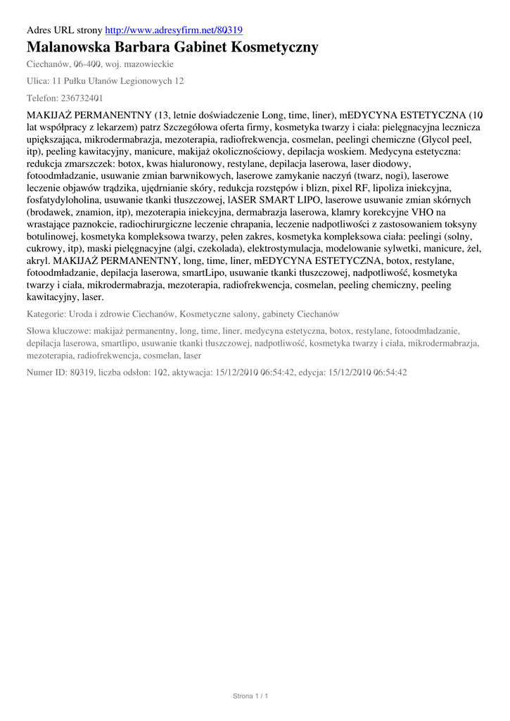 Adres URL strony http://www.adresyfirm.net/80319 Malanowska Barbara Gabinet Kosmetyczny Ciechanów, 06-400, woj. mazowieckie Ulica: 11 Pułku Ułanów Legionowych 12 Telefon: 236732401 MAKIJAŻ PERMANENTNY (13, letnie doświadczenie Long, time, liner), mEDYCYNA ESTETYCZNA (10 lat współpracy z lekarzem) patrz Szczegółowa oferta firmy, kosmetyka twarzy i ciała: pielęgnacyjna lecznicza upiększająca, mikrodermabrazja, mezoterapia, radiofrekwencja, cosmelan, peelingi chemiczne (Glycol peel, itp), peeling kawitacyjny, manicure, makijaż okolicznościowy, depilacja woskiem. Medycyna estetyczna: redukcja zmarszczek: botox, kwas hialuronowy, restylane, depilacja laserowa, laser diodowy, fotoodmładzanie, usuwanie zmian barwnikowych, laserowe zamykanie naczyń (twarz, nogi), laserowe leczenie objawów trądzika, ujędrnianie skóry, redukcja rozstępów i blizn, pixel RF, lipoliza iniekcyjna, fosfatydyloholina, usuwanie tkanki tłuszczowej, lASER SMART LIPO, laserowe usuwanie zmian skórnych (brodawek, znamion, itp), mezoterapia iniekcyjna, dermabrazja laserowa, klamry korekcyjne VHO na wrastające paznokcie, radiochirurgiczne leczenie chrapania, leczenie nadpotliwości z zastosowaniem toksyny botulinowej, kosmetyka kompleksowa twarzy, pełen zakres, kosmetyka kompleksowa ciała: peelingi (solny, cukrowy, itp), maski pielęgnacyjne (algi, czekolada), elektrostymulacja, modelowanie sylwetki, manicure, żel, akryl. MAKIJAŻ PERMANENTNY, long, time, liner, mEDYCYNA ESTETYCZNA, botox, restylane, fotoodmładzanie, depilacja laserowa, smartLipo, usuwanie tkanki tłuszczowej, nadpotliwość, kosmetyka twarzy i ciała, mikrodermabrazja, mezoterapia, radiofrekwencja, cosmelan, peeling chemiczny, peeling kawitacyjny, laser. Kategorie: Uroda i zdrowie Ciechanów, Kosmetyczne salony, gabinety Ciechanów Słowa kluczowe: makijaż permanentny, long, time, liner, medycyna estetyczna, botox, restylane, fotoodmładzanie, depilacja laserowa, smartlipo, usuwanie tkanki tłuszczowej, nadpotliwość, kosmetyka twarzy i ciała, mikrodermabrazja, mezoterapia, radiofrekwencja, cosmelan, laser Numer ID: 80319, liczba odsłon: 102, aktywacja: 15/12/2010 06:54:42, edycja: 15/12/2010 06:54:42 Strona 1 / 1