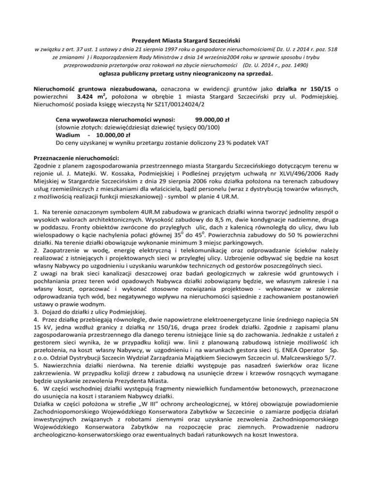 Prezydent Miasta Stargard Szczeciński w związku z art. 37 ust. 1 ustawy z dnia 21 sierpnia 1997 roku o gospodarce nieruchomościami( Dz. U. z 2014 r. poz. 518 ze zmianami ) i Rozporządzeniem Rady Ministrów z dnia 14 września2004 roku w sprawie sposobu i trybu przeprowadzania przetargów oraz rokowań na zbycie nieruchomości (Dz. U. 2014 r., poz. 1490) ogłasza publiczny przetarg ustny nieograniczony na sprzedaż. Nieruchomość gruntowa niezabudowana, oznaczona w ewidencji gruntów jako działka nr 150/15 o powierzchni 3.424 m2, położona w obrębie 1 miasta Stargard Szczeciński przy ul. Podmiejskiej. Nieruchomość posiada księgę wieczystą Nr SZ1T/00124024/2 Cena wywoławcza nieruchomości wynosi: 99.000,00 zł (słownie złotych: dziewięćdziesiąt dziewięć tysięcy 00/100) Wadium - 10.000,00 zł Do ceny uzyskanej w wyniku przetargu zostanie doliczony 23 % podatek VAT Przeznaczenie nieruchomości: Zgodnie z planem zagospodarowania przestrzennego miasta Stargardu Szczecińskiego dotyczącym terenu w rejonie ul. J. Matejki. W. Kossaka, Podmiejskiej i Podleśnej przyjętym uchwałą nr XLVI/496/2006 Rady Miejskiej w Stargardzie Szczecińskim z dnia 29 sierpnia 2006 roku działka położona na terenach zabudowy usług rzemieślniczych z mieszkaniami dla właściciela, bądź personelu (wraz z dystrybucją towarów własnych, z możliwością realizacji funkcji mieszkaniowej) - symbol w planie 4 UR.M. 1. Na terenie oznaczonym symbolem 4UR.M zabudowa w granicach działki winna tworzyć jednolity zespół o wysokich walorach architektonicznych. Wysokość zabudowy do 8,5 m, dwie kondygnacje nadziemne, druga w poddaszu. Fronty obiektów zwrócone do przyległych ulic, dach z kalenicą równoległą do ulicy, dwu lub wielospadowy o kącie nachylenia połaci głównej 350 do 450. Powierzchnia zabudowy do 50 % powierzchni działki. Na terenie działki obowiązuje wykonanie minimum 3 miejsc parkingowych. 2. Zaopatrzenie w wodę, energię elektryczną i telekomunikację oraz odprowadzanie ścieków należy realizować z istniejących i projektowanych sieci w przyległej ulicy. Uzbrojenie odbywać się będzie na koszt własny Nabywcy po uzgodnieniu i uzyskaniu warunków technicznych od gestorów poszczególnych sieci. Z uwagi na brak sieci kanalizacji deszczowej oraz badań geologicznych w zakresie wód gruntowych i pochłaniania przez teren wód opadowych Nabywca działki zobowiązany będzie, we własnym zakresie i na własny koszt, opracować i wykonać stosowne rozwiązania projektowo - wykonawcze w zakresie odprowadzania tych wód, bez negatywnego wpływu na nieruchomości sąsiednie z zachowaniem postanowień ustawy o prawie wodnym. 3. Dojazd do działki z ulicy Podmiejskiej. 4. Przez działkę przebiegają równolegle, dwie napowietrzne elektroenergetyczne linie średniego napięcia SN 15 kV, jedna wzdłuż granicy z działką nr 150/16, druga przez środek działki. Zgodnie z zapisami planu zagospodarowania przestrzennego dla danego terenu istniejące linie są do zachowania. Jednakże z ustaleń z gestorem sieci wynika, że w przypadku kolizji ww. linii z planowaną zabudową istnieje możliwość ich przełożenia, na koszt własny Nabywcy, w uzgodnieniu i na warunkach gestora sieci tj. ENEA Operator Sp. z o.o. Odział Dystrybucji Szczecin Wydział Zarządzania Majątkiem Sieciowym Szczecin ul. Malczewskiego 5/7. 5. Nawierzchnia działki nierówna. Na terenie działki występuje pas nasadzeń świerków oraz liczne zakrzewienia. W przypadku kolizji drzew z zabudową na usunięcie drzew i krzewów rosnących wymagane będzie uzyskanie zezwolenia Prezydenta Miasta. 6. W części wschodniej działki występują fragmenty niewielkich fundamentów betonowych, przeznaczone do usunięcia na koszt i staraniem Nabywcy działki. Działka w części położona w strefie „W III” ochrony archeologicznej, w której obowiązuje powiadomienie Zachodniopomorskiego Wojewódzkiego Konserwatora Zabytków w Szczecinie o zamiarze podjęcia działań inwestycyjnych związanych z robotami ziemnymi oraz uzyskanie zezwolenia Zachodniopomorskiego Wojewódzkiego Konserwatora Zabytków na rozpoczęcie prac ziemnych. Prowadzenie nadzoru archeologiczno-konserwatorskiego oraz ewentualnych badań ratunkowych na koszt Inwestora. 7. Działka zgodnie z ewidencją gruntów oznaczona rodzajem użytku RIVa. Nabywca przed przystąpieniem do przetargu winien zasięgnąć informacji o wyłączeniu gruntów z produkcji rolniczej w Starostwie Powiatowym. 8. W księdze wieczystej nieruchomości wpisane jest nieodpłatne użytkowanie nieruchomości polegające na nieograniczonym czasowo nieodpłatnym dostępie i prawie eksploatacji i konserwacji uzbrojenia podziemnego w postaci kabla technicznego na rzecz Telekomunikacji Kolejowej spółki z ograniczoną odpowiedzialnością Zakładu Telekomunikacji w Szczecinie oraz nieodpłatne użytkowanie polegające na nieograniczonym czasowo, nieodpłatnym dostępie i prawie eksploatacji i konserwacji sieci zasilającej rozdzielczej niskiego napięcia oraz rozdzielnicy wnętrzowej niskiego napięcia na rzecz „PKP Energetyka” spółki z ograniczoną odpowiedzialnością Zakład Pomorski w Szczecinie. Obowiązujący miejscowy plan zagospodarowania przestrzennego tego obszaru, zawierający szczegółowe warunki zabudowy i zagospodarowania nieruchomości, dostępny do wglądu w Wydziale Gospodarki Przestrzennej oraz na stronie internetowej www.stargard.pl WAGA: 1. Przetarg odbędzie się w siedzibie Stargardzkiego TBS - ul. Struga 29 w Stargardzie Szczecińskim w sali przetargów - o godz. 10,30 ; dnia 03 lipca 2015 r. r. 2. Wadium w wyżej określonej wysokości winno wpłynąć na konto Stargardzkiego TBS Sp. z o.o. w Banku PEKAO S.A. I O/Stargard Nr 10124039011111000042204466, najpóźniej 29 czerwca 2015 r. 3. O wysokości postąpienia decydują uczestnicy przetargu, z tym że wysokość postąpienia nie może być niższa niż 1 % ceny wywoławczej. 4. Wyniki przetargu po