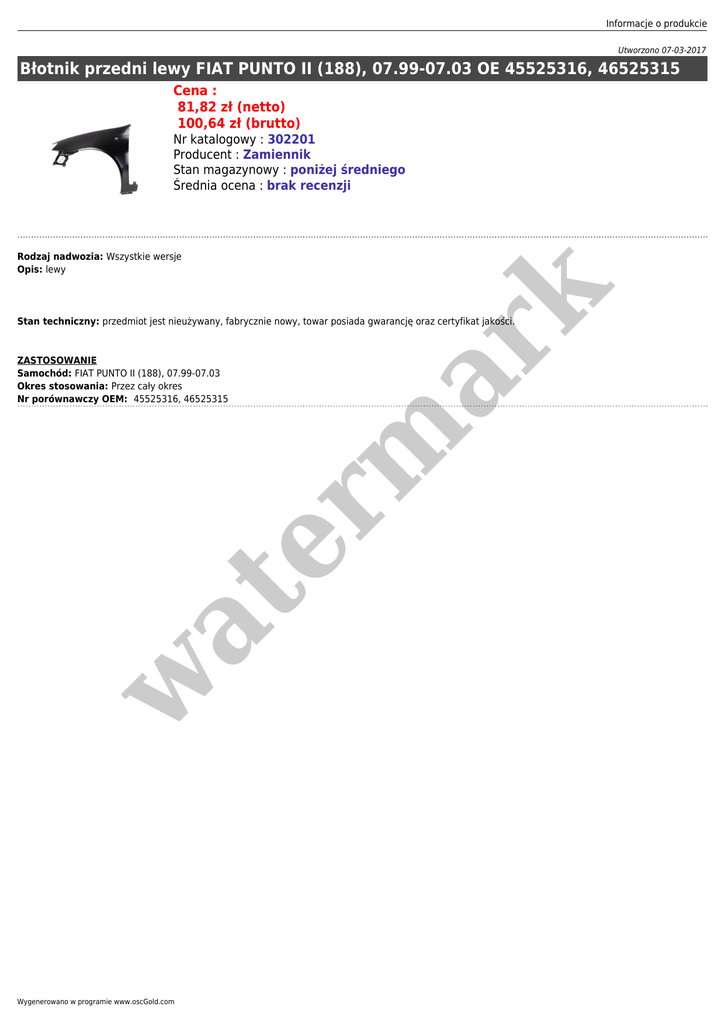 Informacje o produkcie Utworzono 07-03-2017 Błotnik przedni lewy FIAT PUNTO II (188), 07.99-07.03 OE 45525316, 46525315 Cena : 81,82 zł (netto) 100,64 zł (brutto) Nr katalogowy : 302201 Producent : Zamiennik Stan magazynowy : poniżej średniego Średnia ocena : brak recenzji er m ar k Rodzaj nadwozia: Wszystkie wersje Opis: lewy Stan techniczny: przedmiot jest nieużywany, fabrycznie nowy, towar posiada gwarancję oraz certyfikat jakości. w at ZASTOSOWANIE Samochód: FIAT PUNTO II (188), 07.99-07.03 Okres stosowania: Przez cały okres Nr porównawczy OEM: 45525316, 46525315 Wygenerowano w programie www.oscGold.com