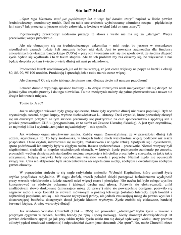 Sto lat? Mało! „Opat tego klasztoru miał już pięćdziesiąt lat a więc był bardzo stary” napisał w liście pewien średniowieczny, anonimowy mnich. Dziś na takie stwierdzenie wybałuszamy zdumione oczęta – pięćdziesiąt lat i stary? Jak przecież to jeszcze młody człowiek, w kwiecie wieku! Jaki on tam „stary”? Pięćdziesiątkę przekroczył niedawno piszący te słowa i wcale nie ma się za „starego”. Wręcz przeciwnie; wręcz przeciwnie… Ale nie oburzajmy się na średniowiecznego zakonnika – miał rację, bo jeszcze w stosunkowo nieodległych czasach ludzie żyli znacznie krócej niż dziś. Jest to poważna zagwozdka dla funduszy emerytalnych (zwłaszcza bandyckiego ZUS’u) – przy ich tworzeniu nikt się nie spodziewał, że średnia długość życia będzie się wydłużała i to w takim stopniu. Ale to ich problem my zaś cieszmy się, bo większość z nas będzie dreptała po tym świecie o wiele dłużej niż nasi pradziadowie. Producenci laurek urodzinowych już od lat zauważają, że jest coraz większy na popyt na kartki z okazji 80, 85. 90, 95 100 urodzin. Produkują i sprzedają ich z roku na rok coraz więcej. Ale dlaczego? Co się stało takiego, że pisane nam dłuższe życie niż naszym przodkom? Lekarze dumnie wypinają spasione kałduny – to dzięki rozwojowi nauk medycznych tak się dzieje! To jednak tylko cząstka prawdy i do tego niewielka. To nie medycynie należy się palma pierwszeństwa a nawet nie drugie lub trzecie miejsce. To nie to. A co? Już w ubiegłych wiekach były grupy społeczne, które żyły wyraźnie dłużej niż reszta populacji. Była to arystokracja, uczeni, bogaci kupcy, wyższe duchowieństwo i… aktorzy. Dziś czynniki, które pozwalały cieszyć się im dłuższym pobytem na tym świecie przeniosły się praktycznie na całe społeczeństwo i spędzają sen z powiek pracownikom ZUS’u (przypominam, że to skrót od Zawsze Ukradną Składkę). A jest tych czynników, co najmniej kilka i wyłonić „ten jeden najważniejszy” - nie sposób. Jak wiadomo organ nieużywany zanika. Każdy organ. Zauważyliśmy, że w przeszłości dłużej żyli uczeni, arystokracja itp. To były środowiska, w których ludzie mieli wielokrotnie więcej bodźców niż reszta pospólstwa. Dużo czytali, interesowali się muzyką, malarstwem i w ogóle sztuką. Spotykali się i dyskutowali, sporo podróżowali ich umysły były w ciągłym ruchu. Reszta społeczeństwa – przeciwnie. Niemal wszyscy byli niepiśmienni, siedzieli w kiepsko oświetlonych chatach, w których życie praktycznie zamierało po zmroku, prowadzili według dzisiejszych standardów nędzną wegetację a ich ciężka praca ledwie starczała, na jakie takie utrzymanie. Jedyną rozrywką były sporadyczne wiejskie wesela i pogrzeby. Niemal nigdy nie opuszczali swojej wsi. Cała ich aktywność była skoncentrowana na napełnieniu michy, zdobyciu i ewentualnym zdobyciu garnca okowity. W poprzednim stuleciu to się nagle radykalnie zmieniło. Wybuchł Kapitalizm, który zmienił życie szybko pospólstwa radykalnie. W ciągu dwóch, trzech pokoleń dzięki postępowi technicznemu wydajność pracy wzrosła wielokrotnie a ludzie zaczęli mieć więcej czasu i pieniędzy. Nie trzeba już było całego wysiłku koncentrować na zdobyciu pokarmu i jakiegoś dachu nad głową. Pojawiła się elektryczność, znikł analfabetyzm słowo drukowane (zmuszające mózg do pracy!) stało się powszechnie dostępne, pojawiło się najpierw radio a więc kontakt ze słowem mówionym a później telewizja (ostatnio Internet), czyli kontakt z najbardziej popularną sztuką – nie zawsze najwyższej próby, ale jednak zmuszającą mózg do pewno wysiłku i dostarczającej bodźców dostępnych dotąd jedynie klasom wyższym. Życie zrobiło się ciekawsze, bardziej barwne i lżejsze. A więc warto żyć dłużej! Jak wiadomo Winston Churchill (1874 – 1965) nie prowadził „zdrowego” trybu życia – zawsze z potężnym cygarem w zębach, butelką brandy po ręką i sporą nadwagą. Kiedy skończył dziewięćdziesiąt lat pewien dziennikarz spytał go jak przy takim trybie życia udało mu się dożyć sędziwego wieku; stary premier odłożył pędzel (malował namiętnie) i odpowiedział dwom jeno słowami: „No sport”. No, może Churchill nieco przesadził, ale tylko trochę. Jeszcze w ubiegłym stuleciu duża część społeczeństwa niebywale ciężko pracowała i to często po dwanaście i więcej godzin na dobę. Efekty tej pracy były mierne a wpływ na budowę fizyczną ludzi znaczący. Pospólstwo było niskie, krępe, koślawe. Taka praca skracała życie. A arystokracja? Uczeni? Pisarze? O! Ci na pewno nie pracowali ciężko (najwyżej umysłowo) i dzięki temu byli wyżsi, piękniejsi i żyli dłużej. Kiedy pojawiły się traktory, młockarnie, snopowiązałki, betoniarki i inne dźwigi a prosty lud został uwolniony od morderczej, katorżniczej harówki różnice w wyglądzie i długości życia zaczęły się zacierać. W poprzednich stuleciach prosty lud jadł tylko to potrafił sam wyprodukować lub co udało się wyhodować w najbliższej okolicy. Siłą rzeczy różnorodność pożywienia była bardzo ograniczona. Na bardziej urozmaicony wikt mogli sobie pozwolić ludzie bogaci – frymuśności kulinarne były trudno dostępne i bardzo kosztowne. W ubiegłym stuleciu pojawiło się zmechanizowane, wydajne rolnictwo, nowoczesne środki transportu – szybkie pociągi z chłodzonymi wagonami, takież samochody a nawet samoloty; Kapitalizm i Wolny Rynek dostarczył lodówek, skutecznych metod pakowania i przechowywania żywności. Dziś nawet kiepsko sytuowany europejczyk może pozwolić sobie codziennie na takie zastawienie stołu, jakie przez stulecia było dostępne jeno faraonom i innym koronowanym głowom. A obfitość i rozmaitość pożywienia to podstawa życia, zdrowia i długowieczności. Nie wierzcie Janowi Kwaśniewskiemu, który 